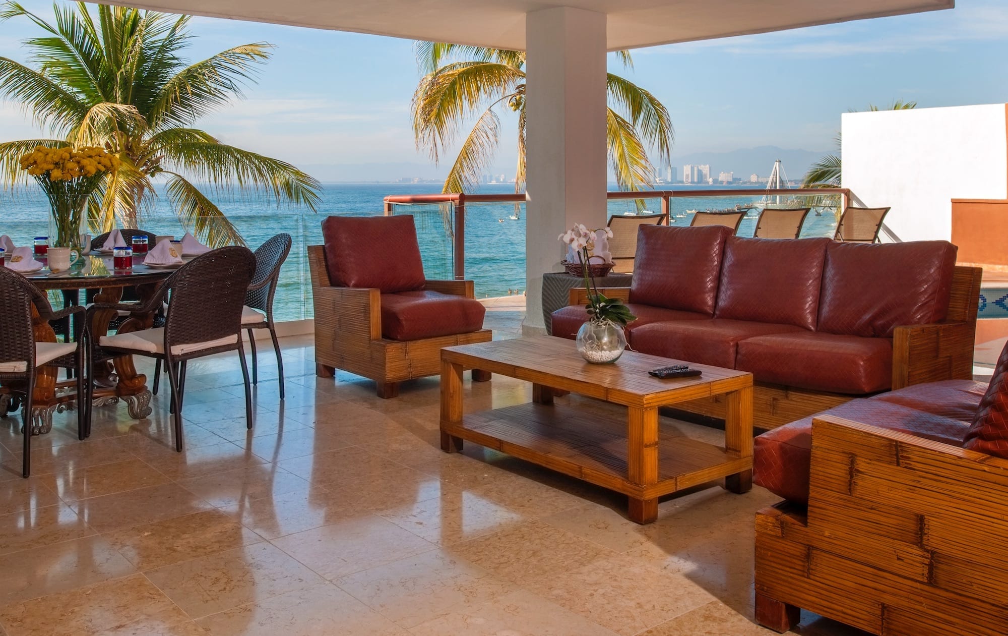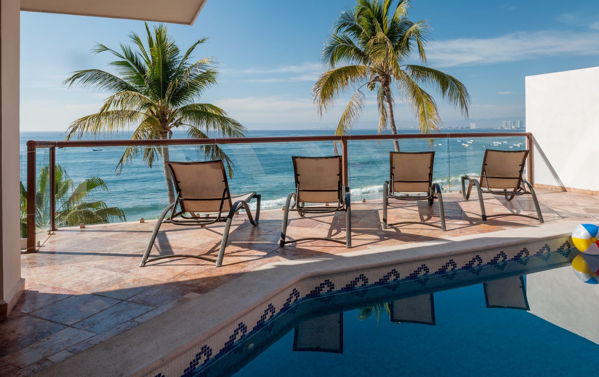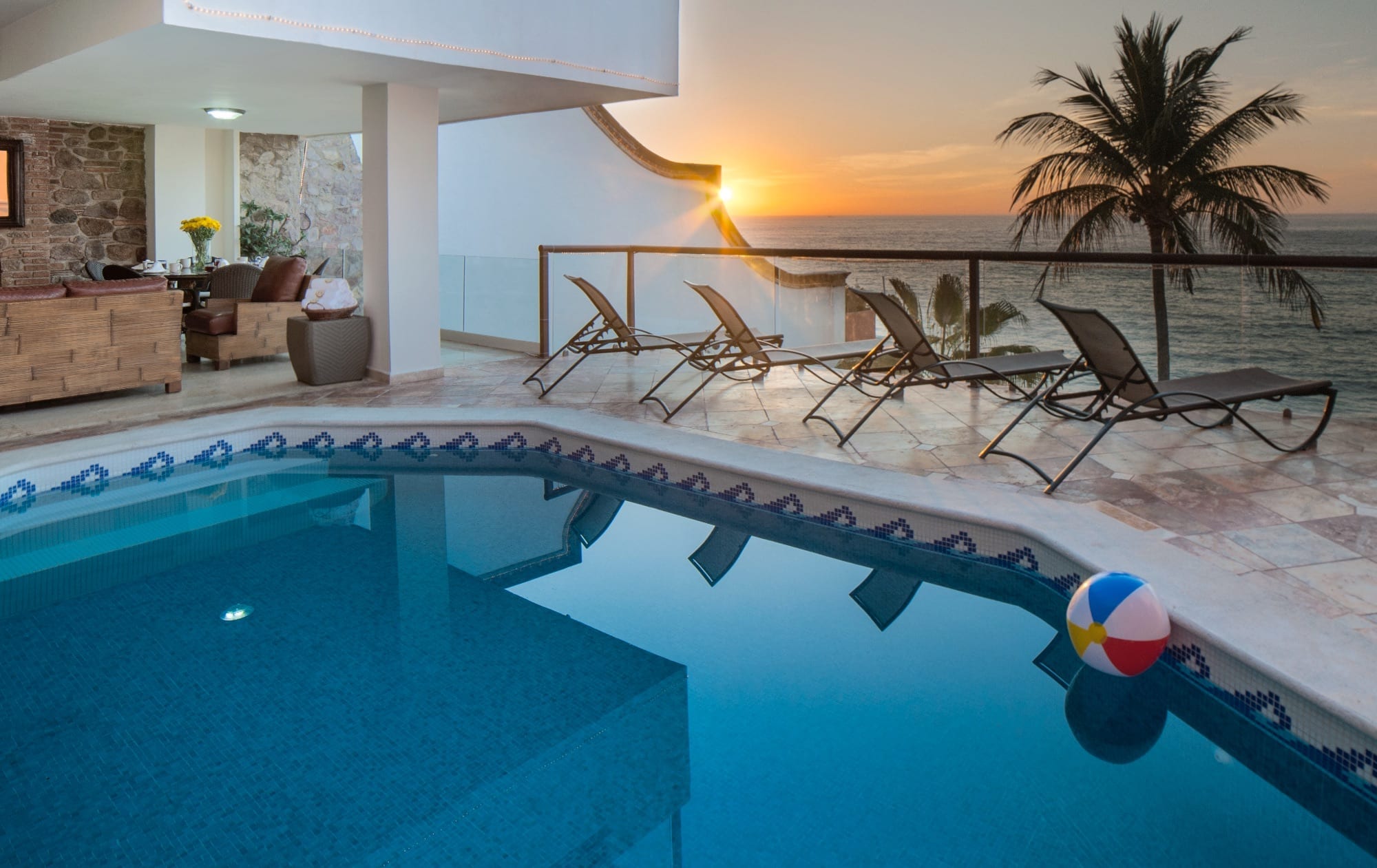Sky Suite B simultaneously envelopes you in an aura of luxury and great comfort; although the home is far away, you are sitting in your own living room. With 3,000 square feet (300 square meters) of living space, Sky Suite B is so spacious that you have to see it to believe it. The lovely gourmet kitchen flows into the exquisitely furnished and spacious living and dining areas, which lead out to the furnished pool terrace and gorgeous pool, the ideal spot for enjoying the spectacular ocean views and the stunning sunsets over the Pacific Ocean. The large open windows give a sense of light, space, and outdoor living, while the lovely antiques and wooden beam ceilings provide an elegant rustic charm. The staff at Vallarta Shores is famously friendly and helpful and can give expert advice on tours, shopping, nightlife, spa treatments, restaurants, and much more. For the best prices and discount rates on this luxury Puerto Vallarta beachfront vacation rental condo, make an online booking and make this lovely penthouse by the sea the perfect base for your next tropical beach vacation to the beautiful shores of Puerto Vallarta and the Mexican Riviera.