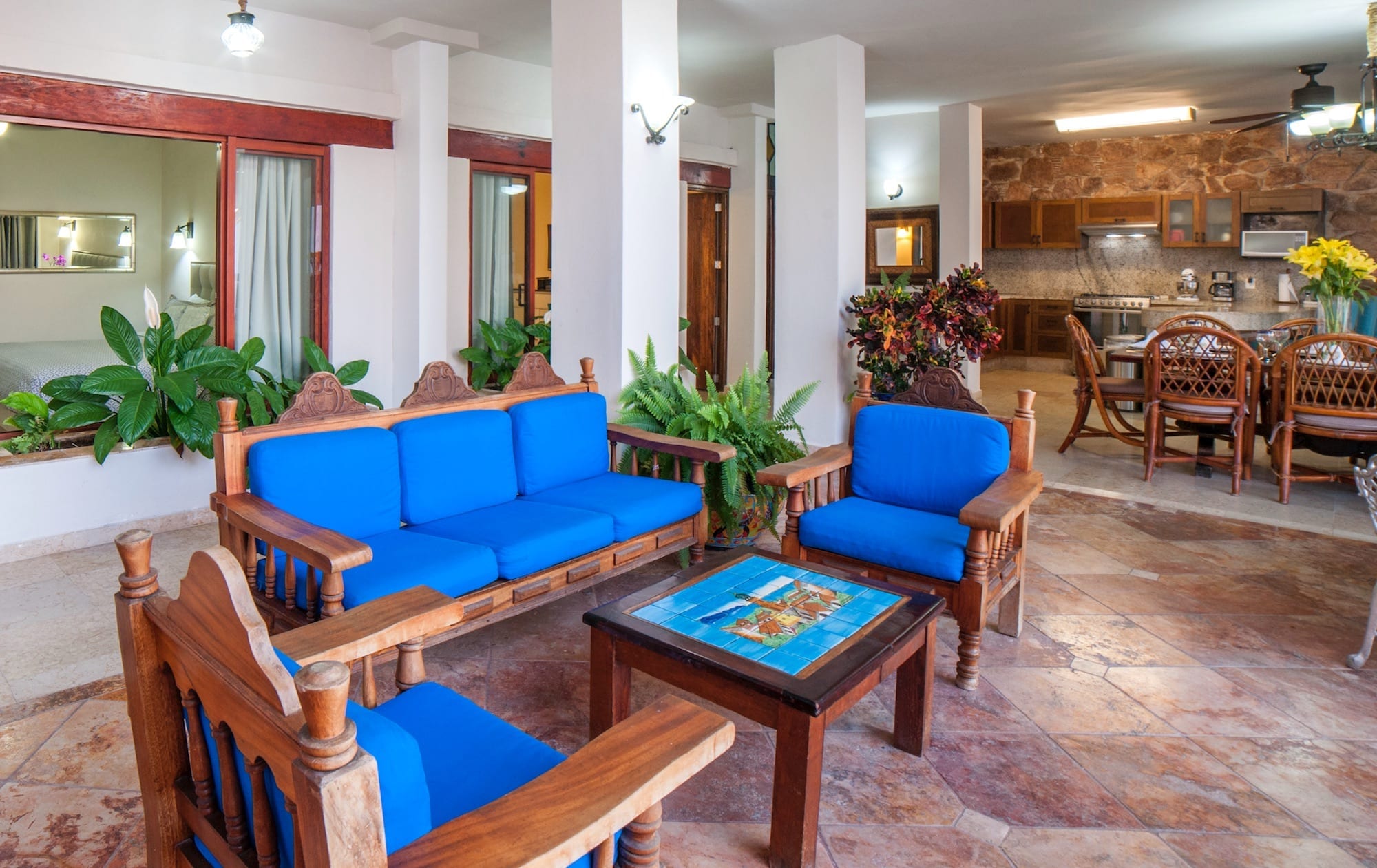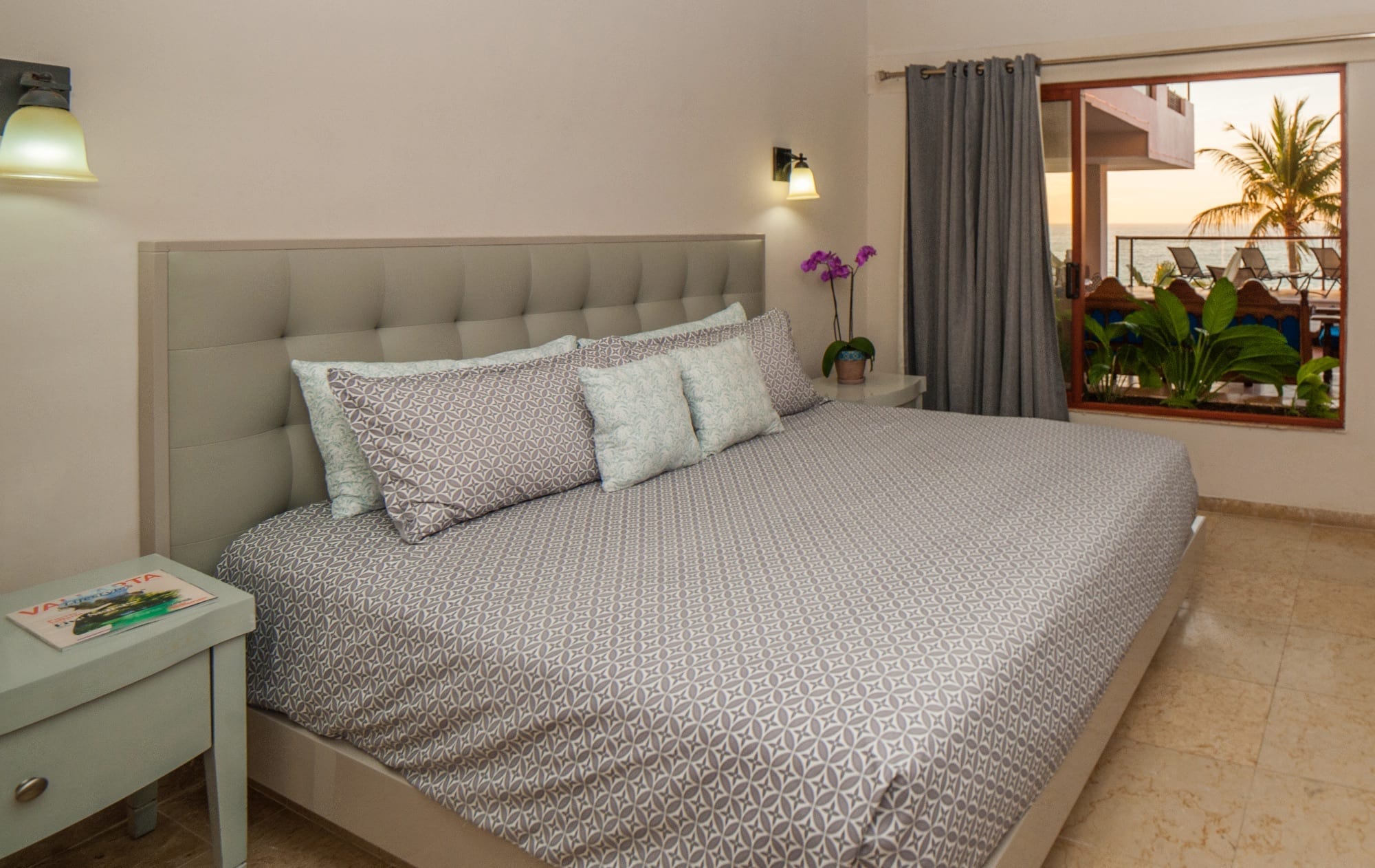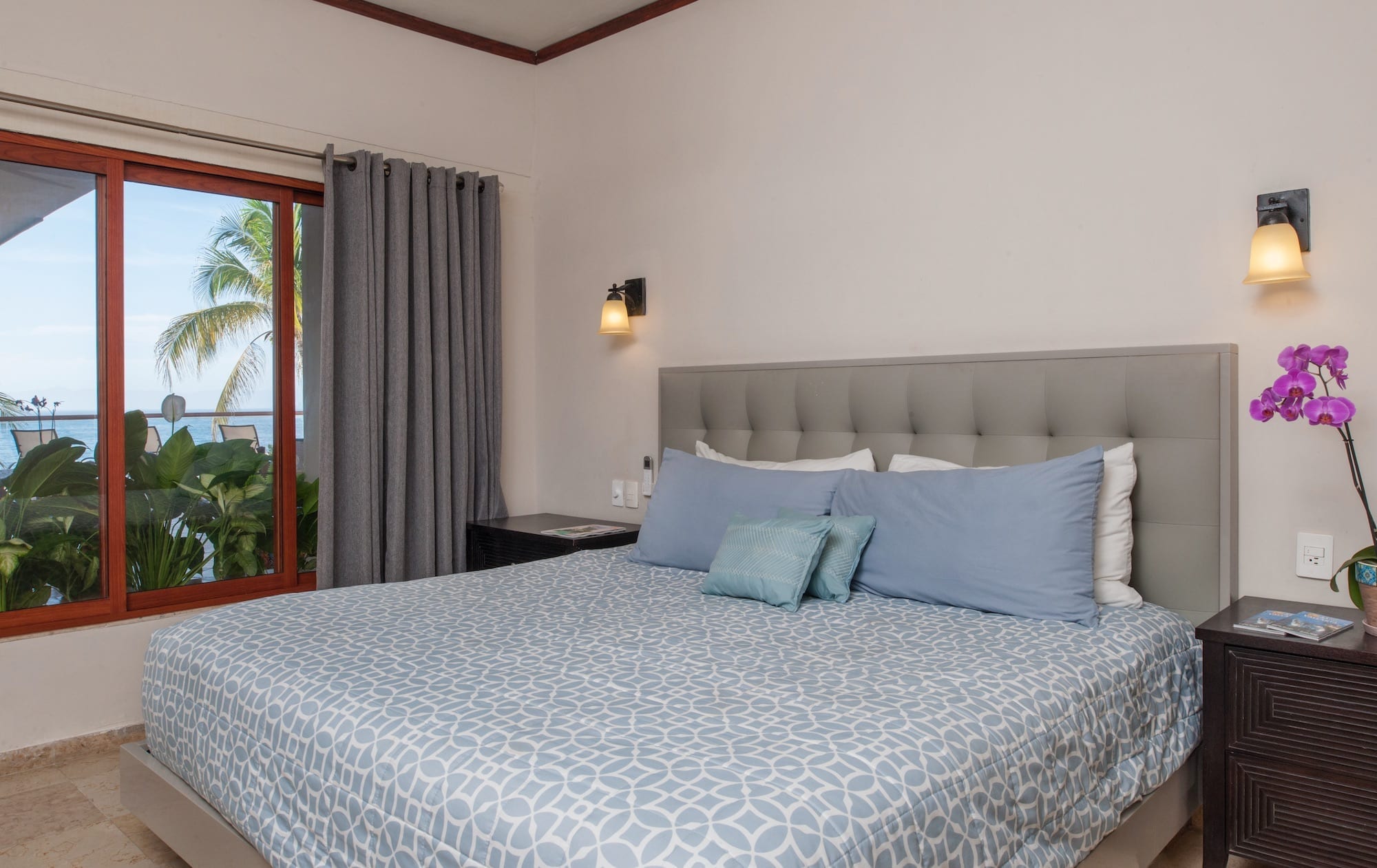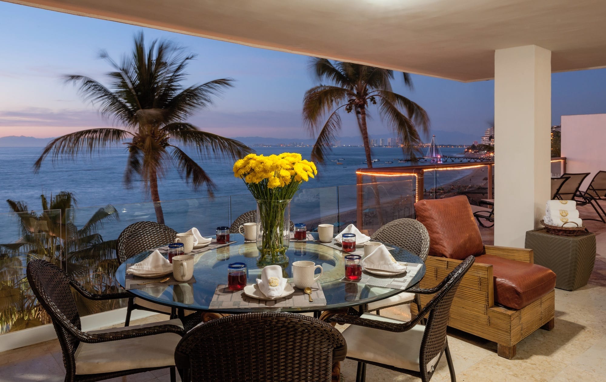 Sky Suite B simultaneously envelopes you in an aura of luxury and great comfort; although the home is far away, you are sitting in your own living room. With 3,000 square feet (300 square meters) of living space, Sky Suite B is so spacious that you have to see it to believe it. The lovely gourmet kitchen flows into the exquisitely furnished and spacious living and dining areas, which lead out to the furnished pool terrace and gorgeous pool, the ideal spot for enjoying the spectacular ocean views and the stunning sunsets over the Pacific Ocean. The large open windows give a sense of light, space, and outdoor living, while the lovely antiques and wooden beam ceilings provide an elegant rustic charm. The staff at Vallarta Shores is famously friendly and helpful and can give expert advice on tours, shopping, nightlife, spa treatments, restaurants, and much more. For the best prices and discount rates on this luxury Puerto Vallarta beachfront vacation rental condo, make an online booking and make this lovely penthouse by the sea the perfect base for your next tropical beach vacation to the beautiful shores of Puerto Vallarta and the Mexican Riviera.