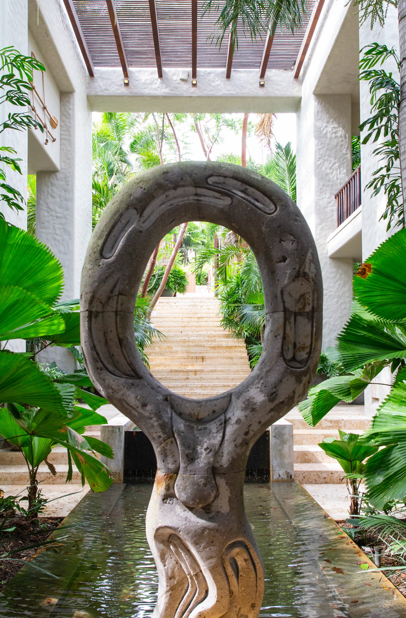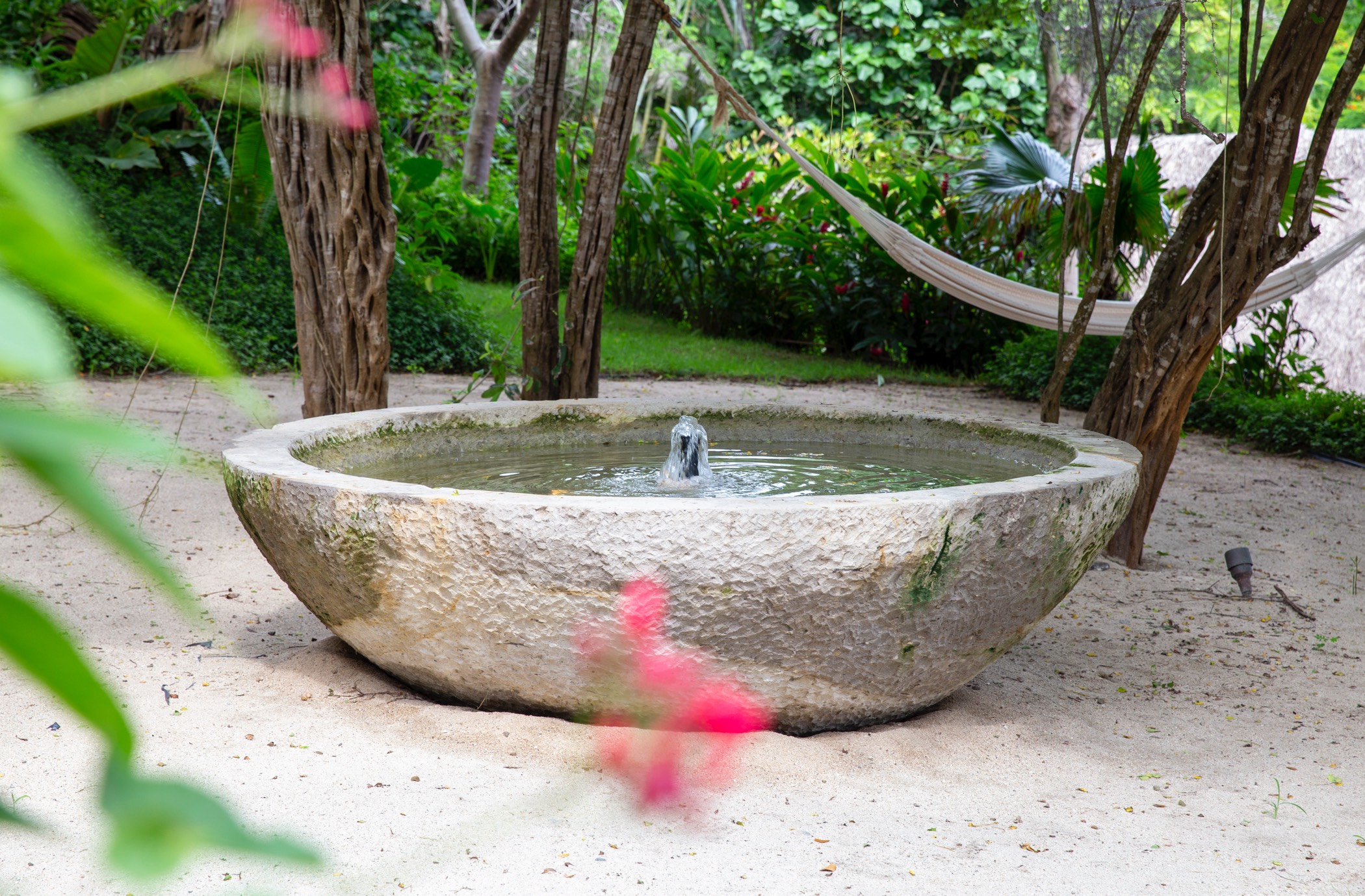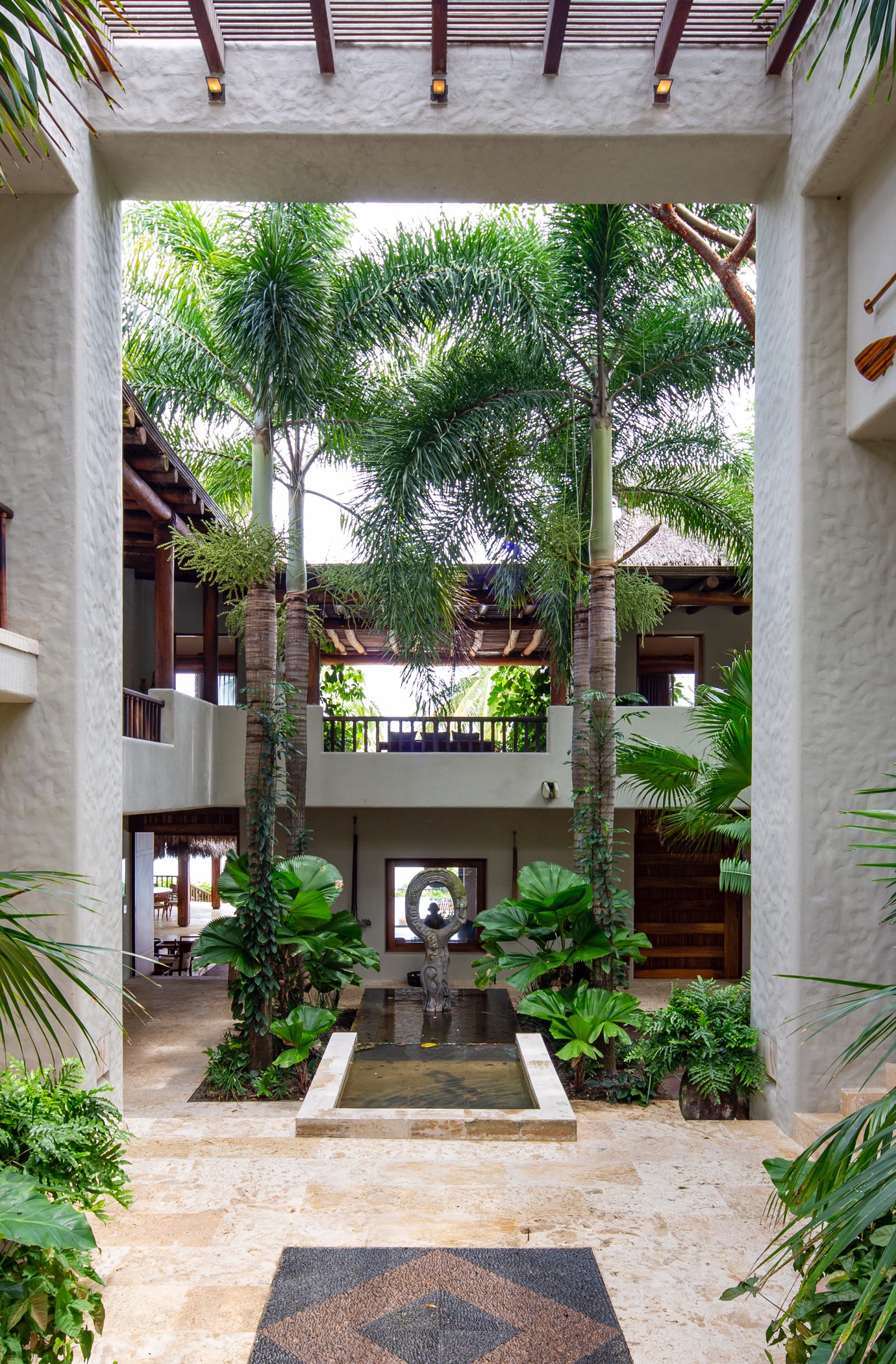 As you enter, an evocative mural sets the tone for an estate where nature and design converge. Romantic outdoor lounges, cascading water features, majestic wooden palapas, and intricate stonework contribute to the villa’s charm. The architecture and landscape merge harmoniously, ensuring the boundaries between indoors and outdoors effortlessly blur.