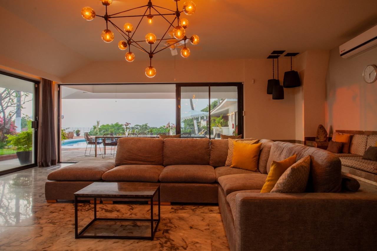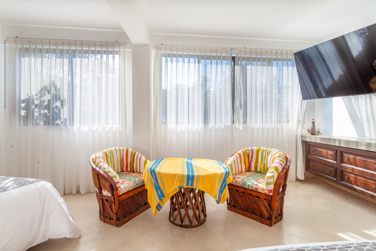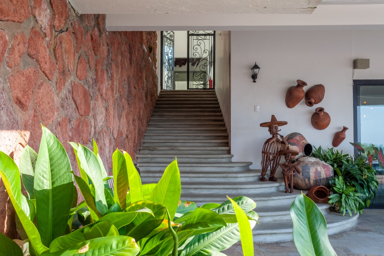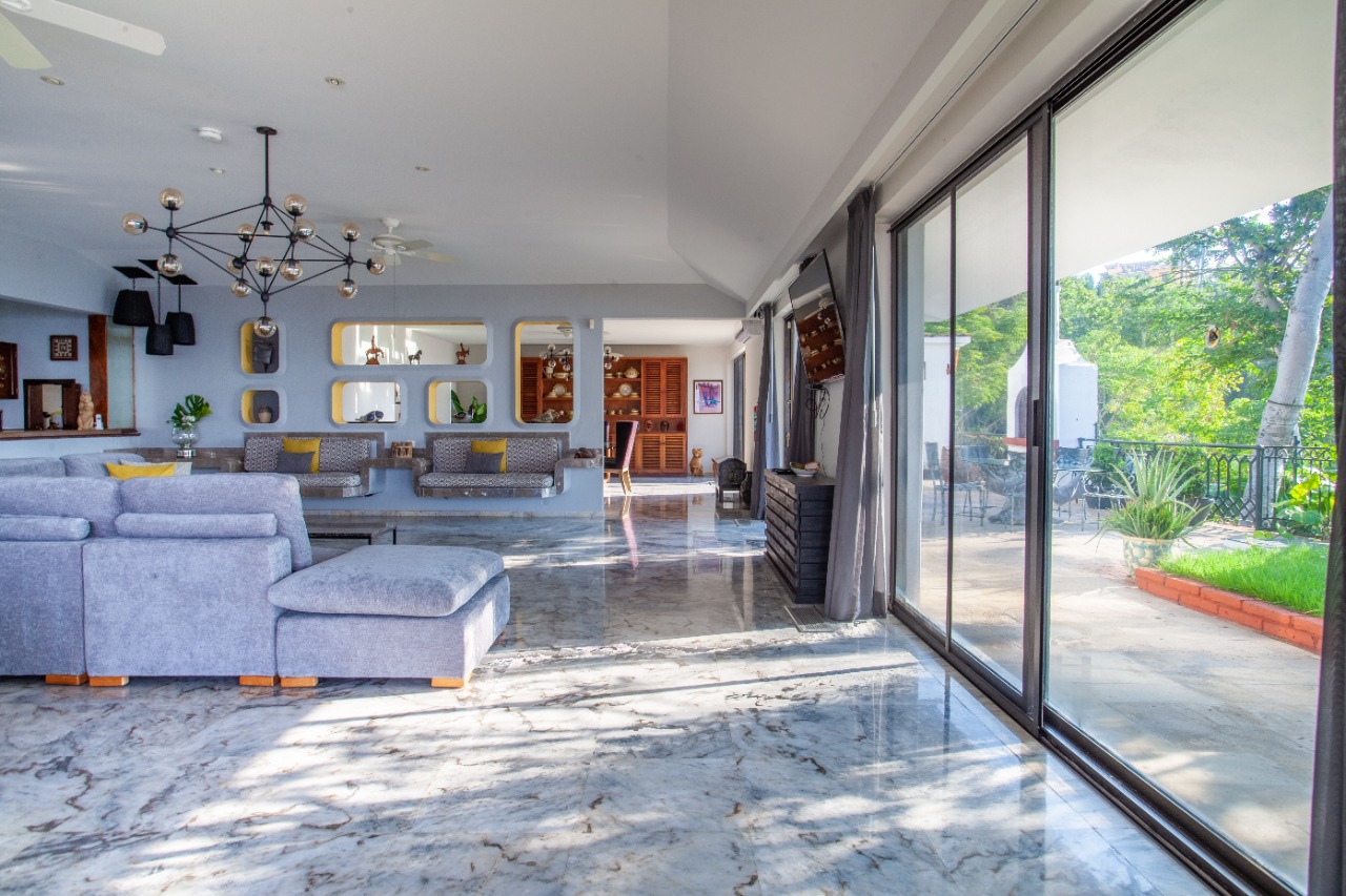 The villa’s elevated position brings a strong connection to its surroundings, with expansive vistas over the Bay of Puerto Vallarta, the city, and landmarks such as Los Arcos and the Marietas Islands. Large windows draw in natural light and frame the jungle landscape, creating a tranquil, almost cinematic setting indoors. The result is a retreat that feels both open to its environment and pleasantly secluded from the bustle below.