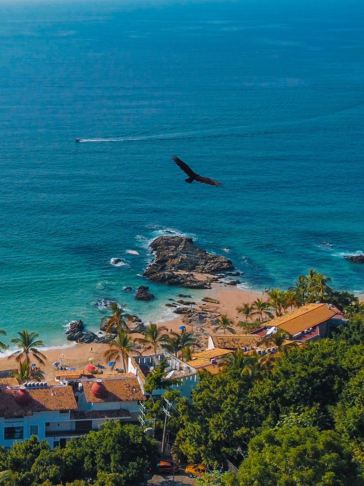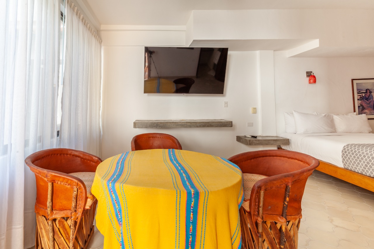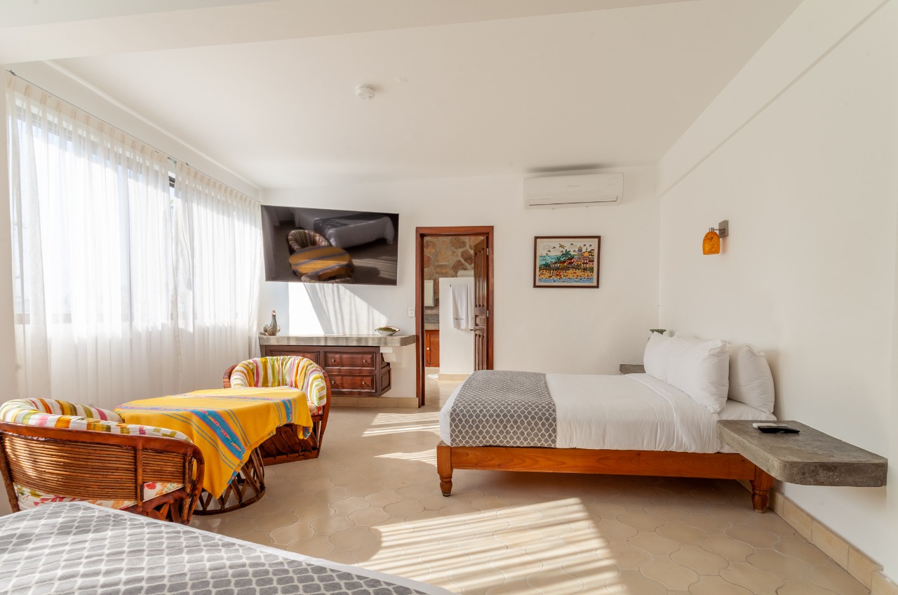 The villa’s elevated position brings a strong connection to its surroundings, with expansive vistas over the Bay of Puerto Vallarta, the city, and landmarks such as Los Arcos and the Marietas Islands. Large windows draw in natural light and frame the jungle landscape, creating a tranquil, almost cinematic setting indoors. The result is a retreat that feels both open to its environment and pleasantly secluded from the bustle below.