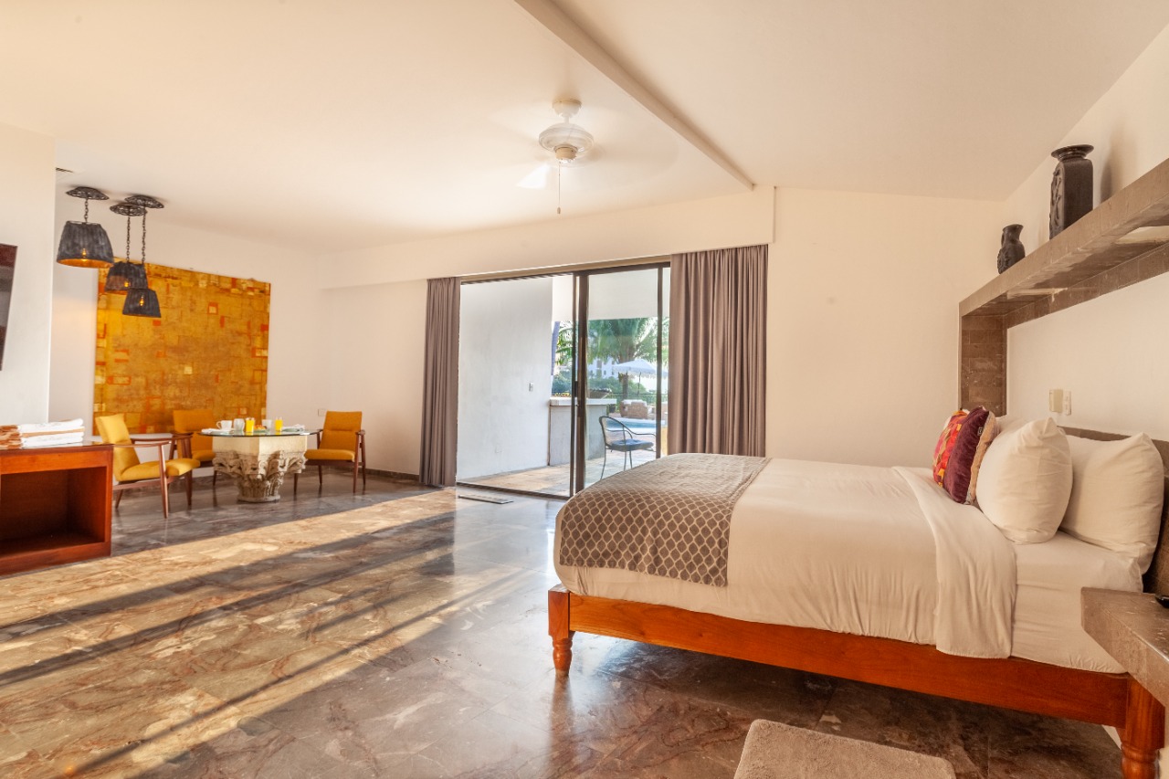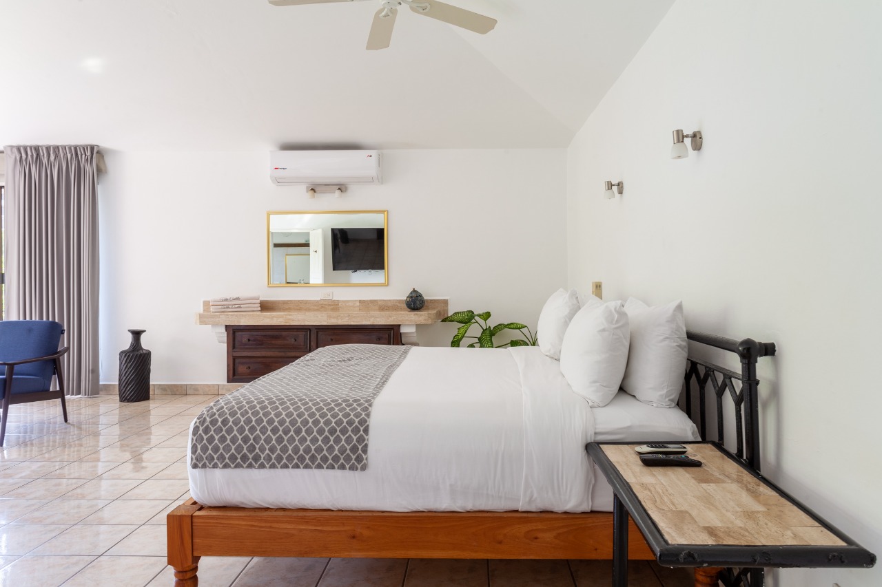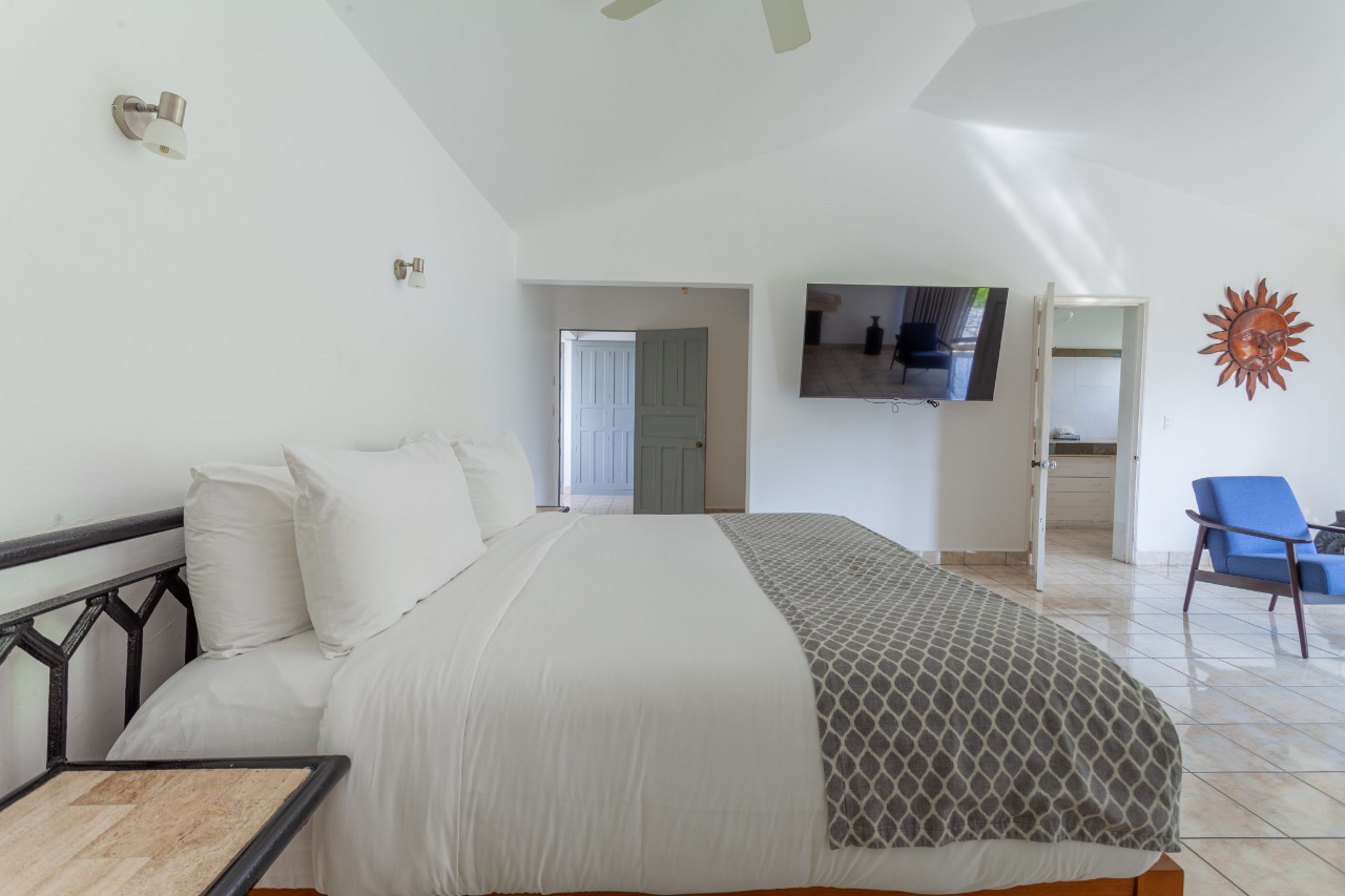 (main floor, outdoor access): King size bed, En-suite bathroom, Ceiling Fans, A/C, Safe, Direct access to pool area