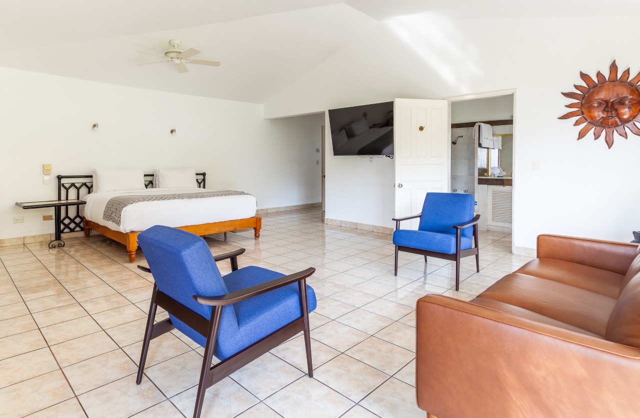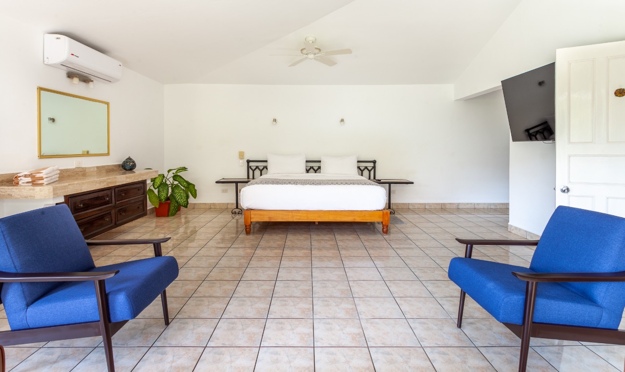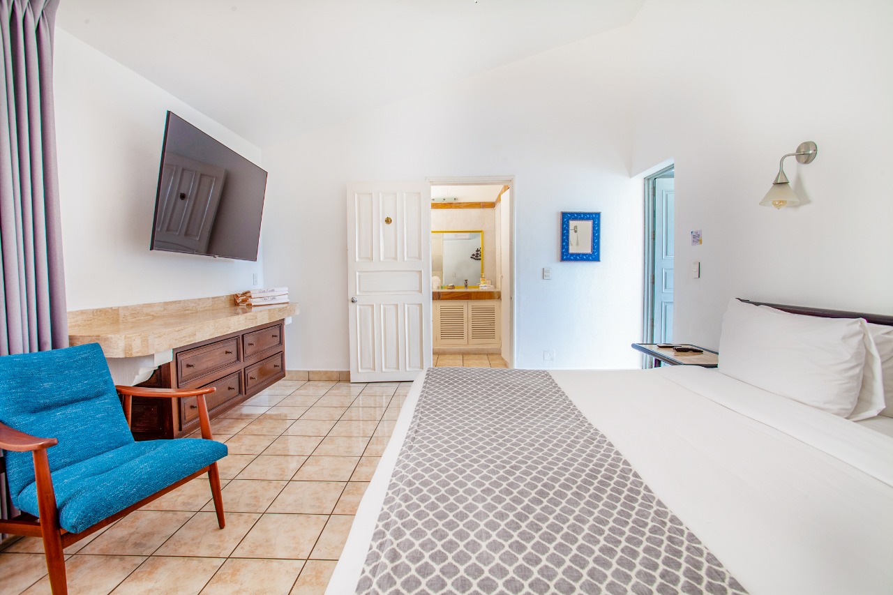 (main floor, outdoor access): King size bed, En-suite bathroom, Ceiling Fans, A/C, Safe, Direct access to pool area