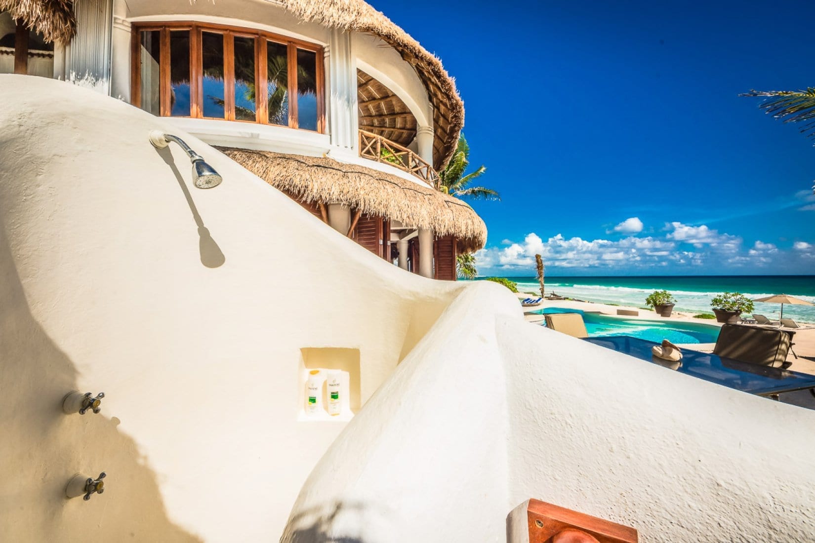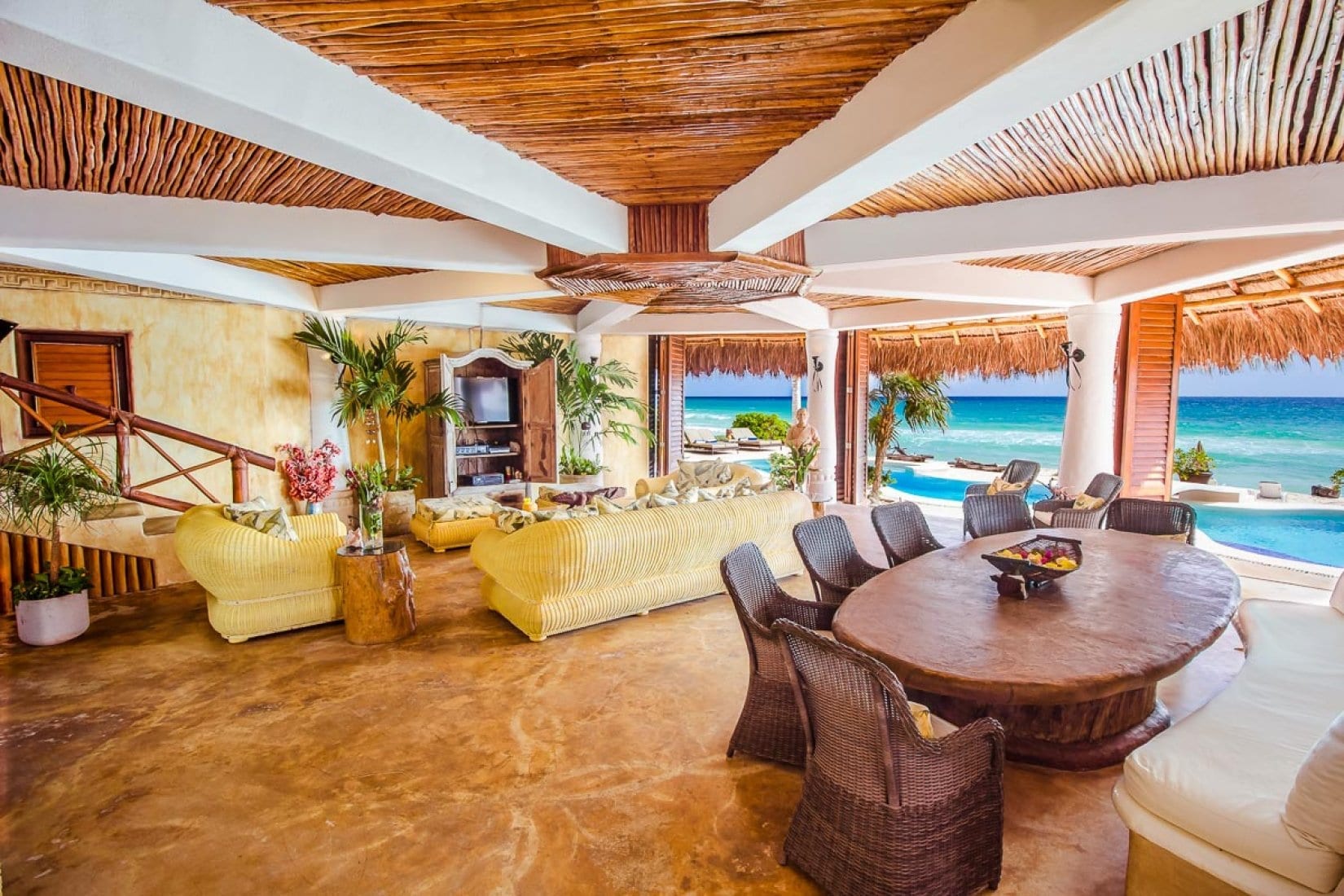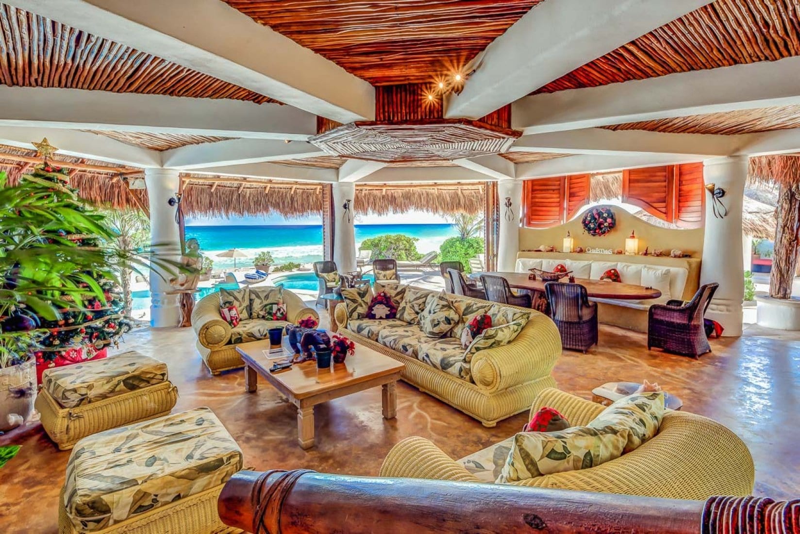 Designed as a generous private estate, this luxury villa in the Mayan Riviera accommodates up to ten guests in five bedrooms, with spaces that are thoughtfully arranged for both togetherness and retreat. Several suites incorporate sitting areas and kitchenettes, allowing for added independence and comfort. Throughout, the architecture and interiors reflect a concept that blends modern amenities with organic touches, including handcrafted elements that echo the surrounding landscape.