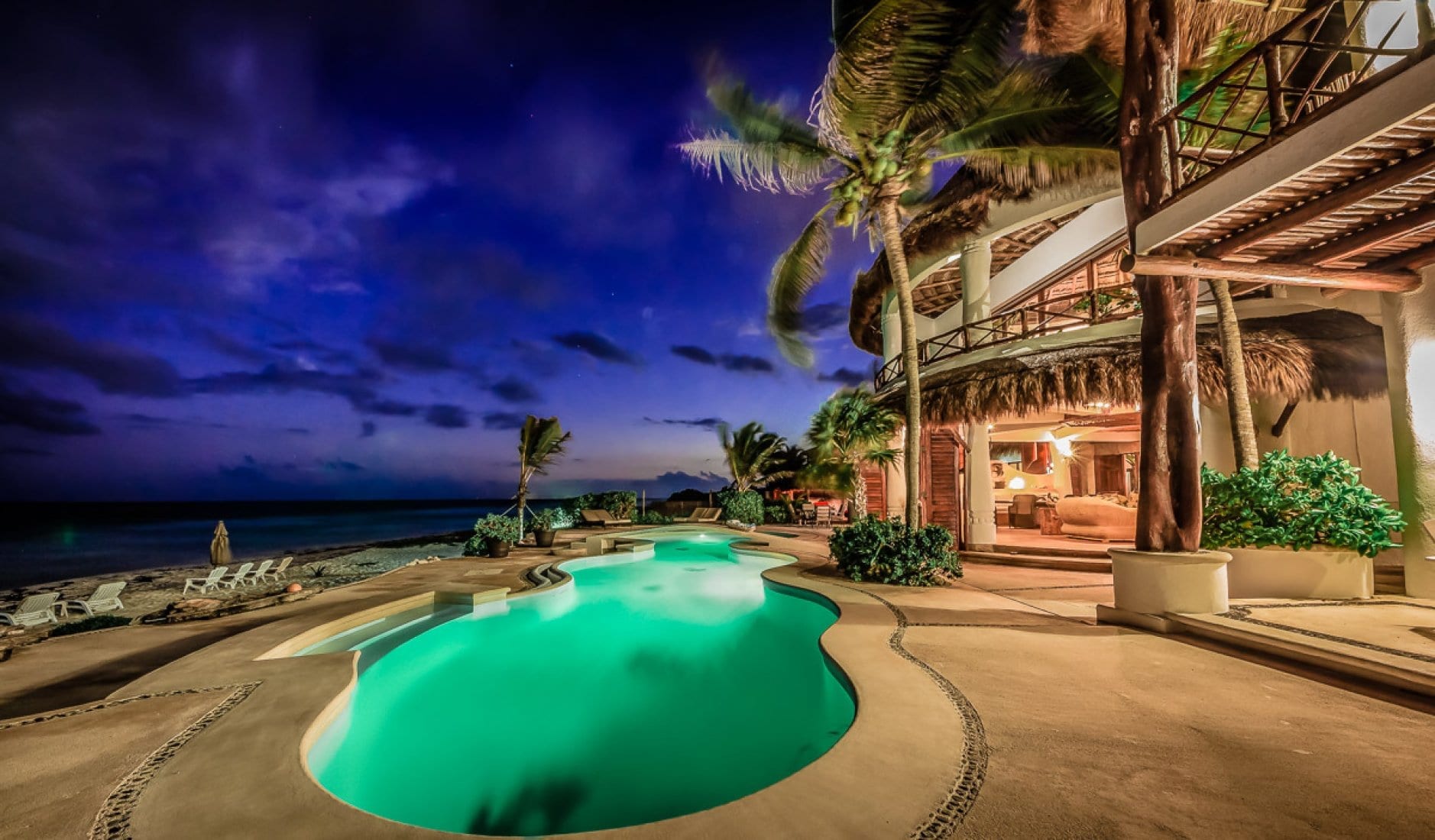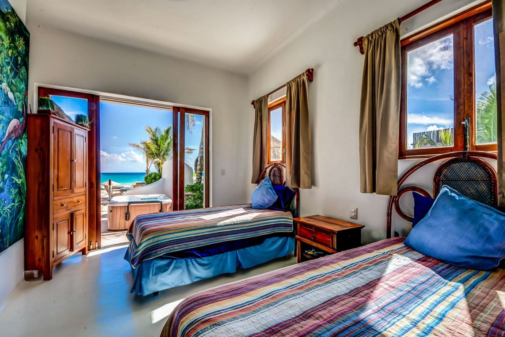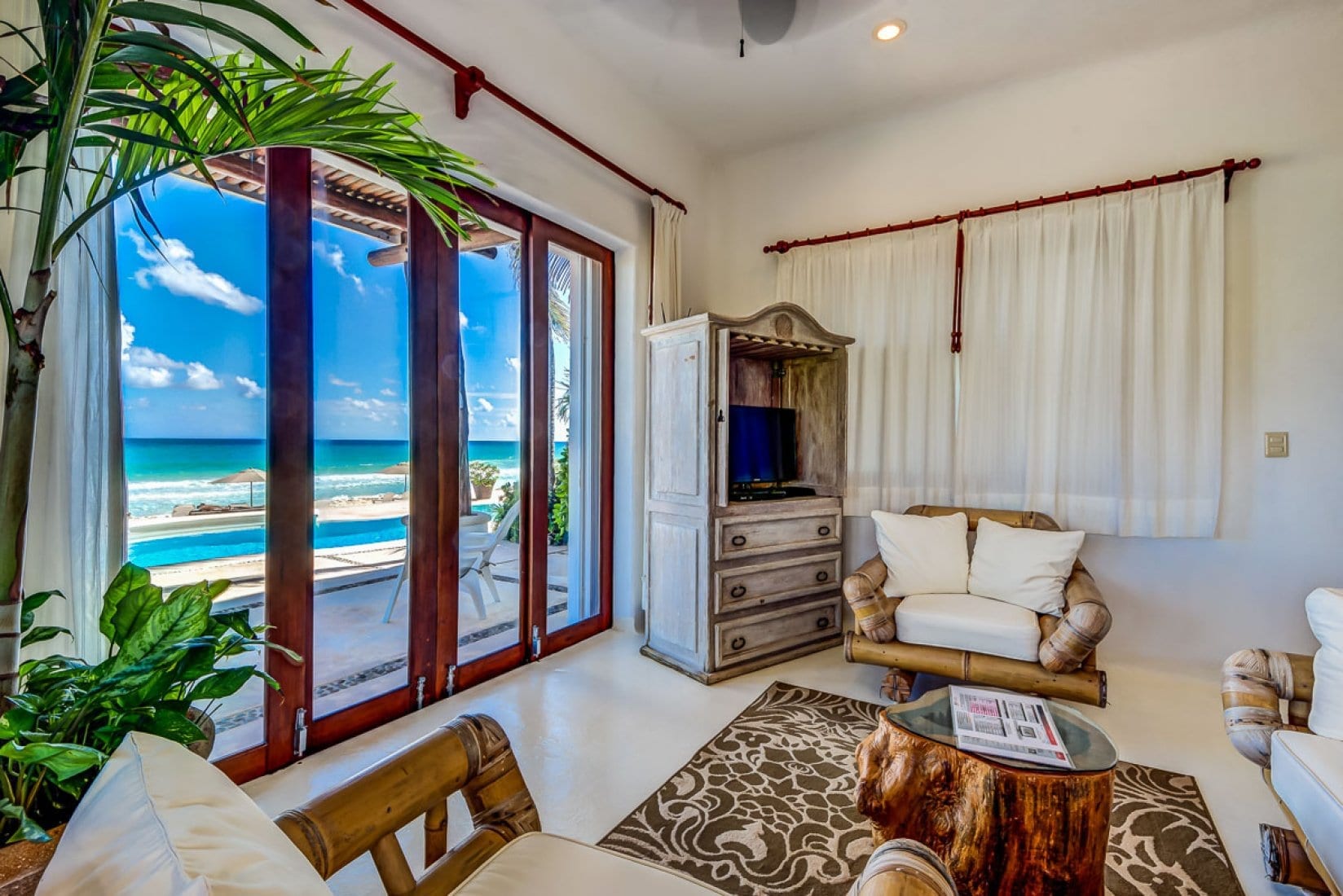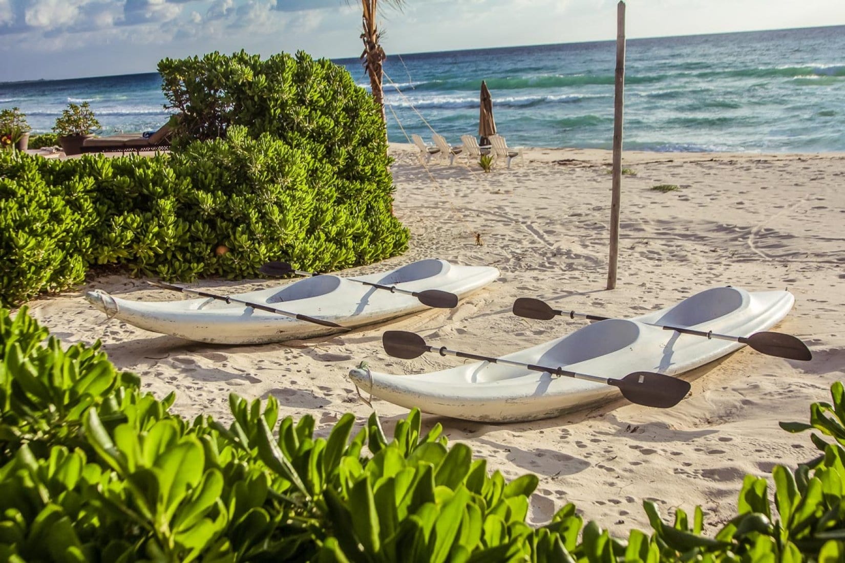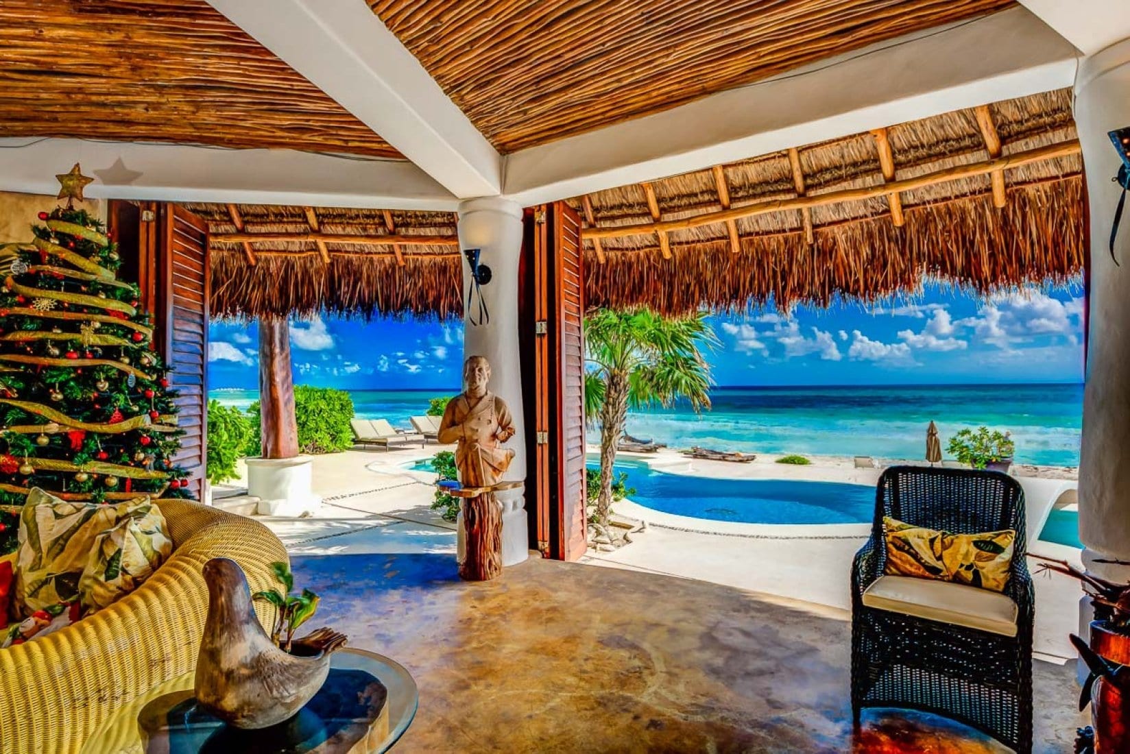 Life at the villa naturally orients toward the shoreline, with indoor living and dining areas opening directly onto the pool deck for an easy flow between interior and exterior spaces. The contoured swimming pool and outdoor Jacuzzi sit just above the sand, creating a relaxed setting for long, languid days by the water, complemented by sun loungers, parasols and sea kayaks. Indoors, a home entertainment system, office and workout room support unhurried work, leisure and wellness, all framed by views of the Caribbean Sea and the nearby jungle lagoon.