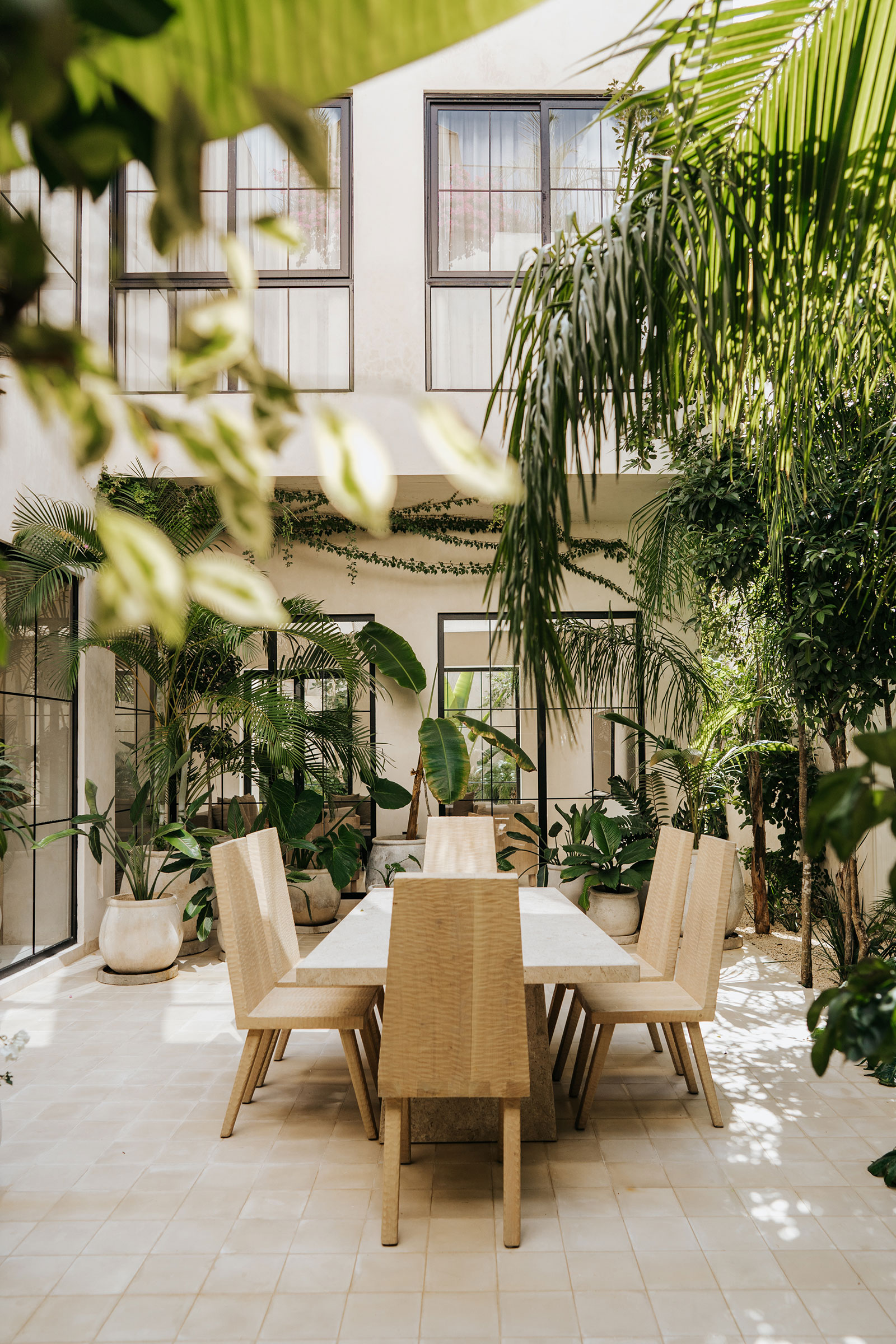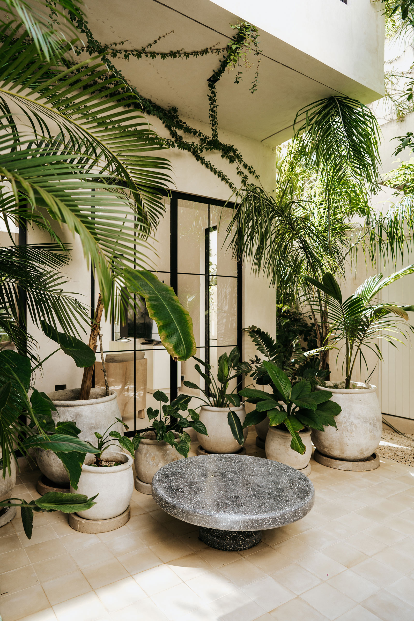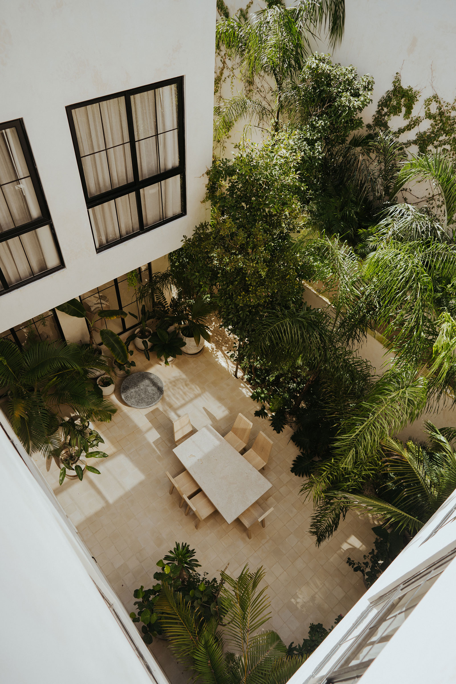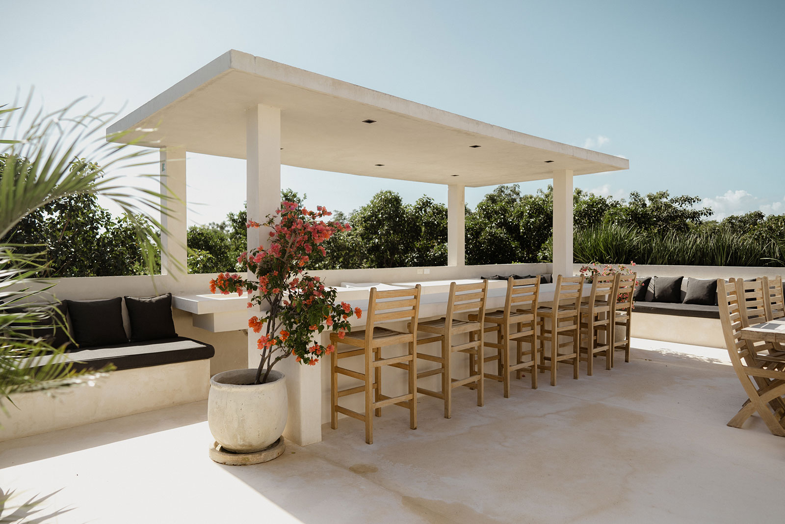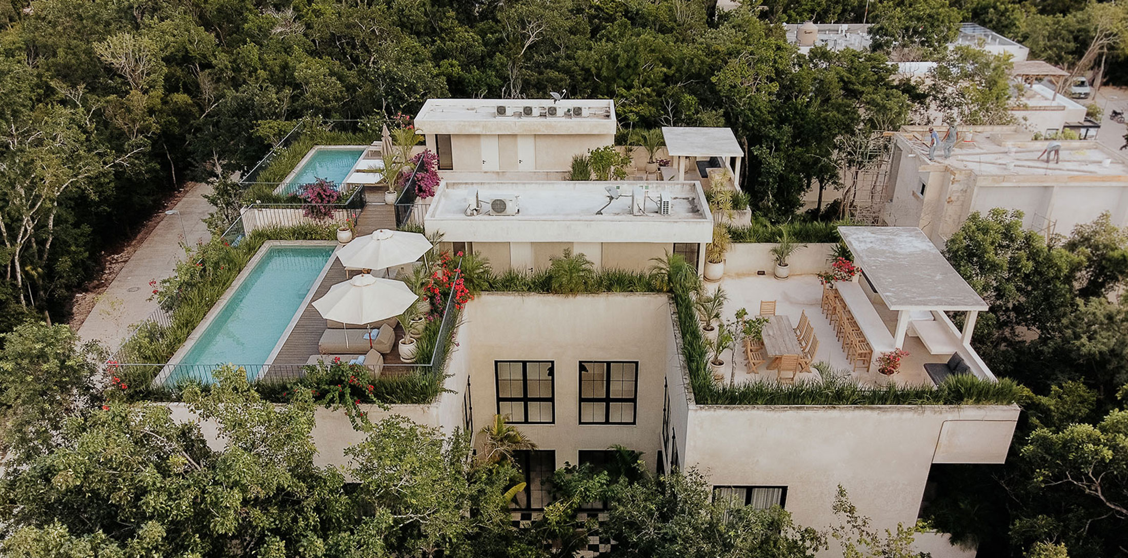 Daily life here naturally orbits around the villa’s generous common areas and open-air spaces. Expansive living rooms and spacious kitchens in each home flow toward two central courtyards, where stone dining tables and lush planting create a relaxed backdrop for shared meals and lingering conversations. Rooftop gardens on each residence, complete with swimming pools, bars, and lounge areas, extend the living experience upward, offering an elevated setting for unwinding, socializing, or simply enjoying the surrounding greenery.