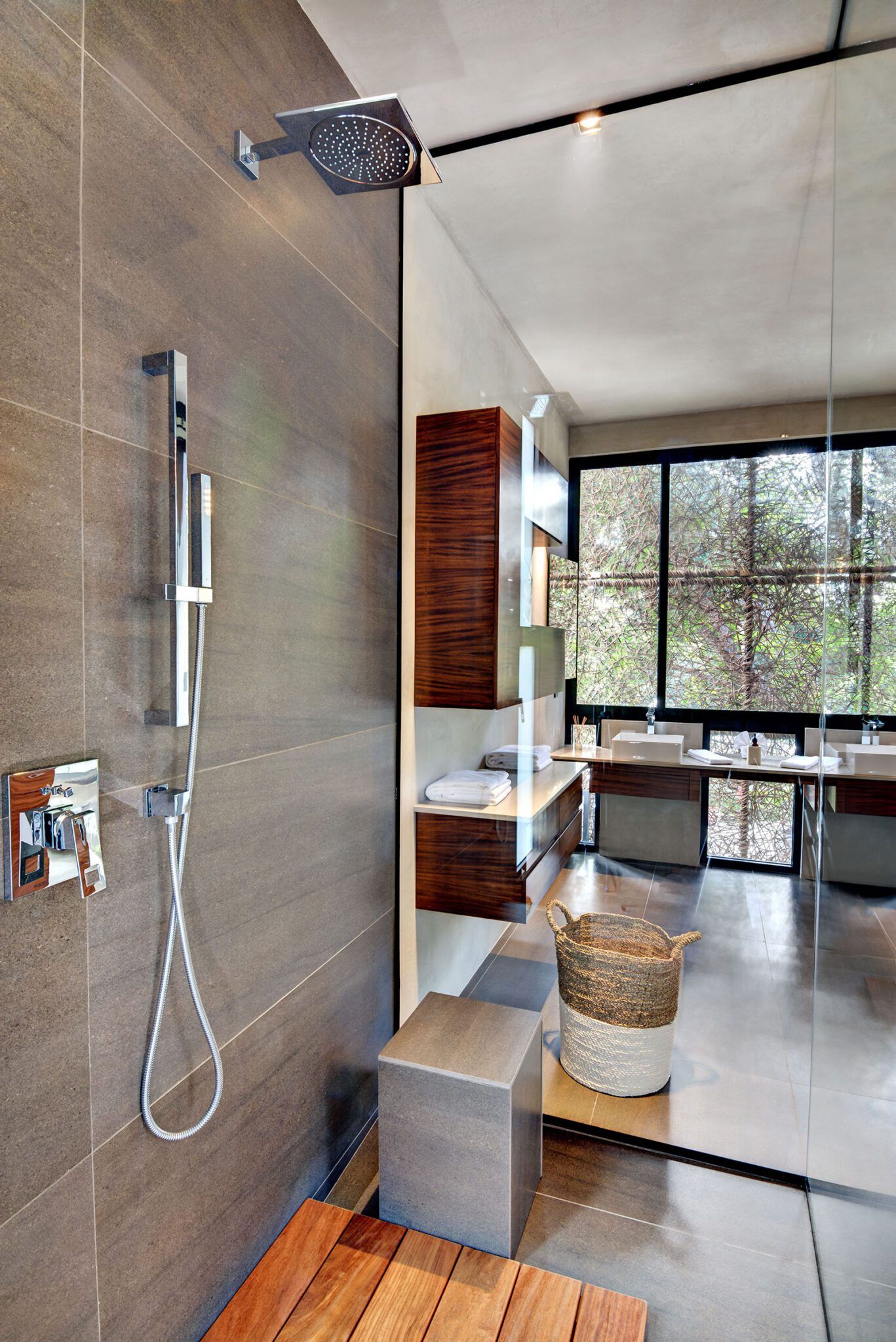 Designed with generous proportions, the residence offers ample space for groups to spread out comfortably while remaining connected. The open-plan living area forms the heart of the home, with large indoor spaces that naturally draw guests together. Five suites are arranged across two levels, with select rooms opening to a shared balcony or directly to the pool and deck, allowing guests to choose between elevated garden perspectives or immediate outdoor access.