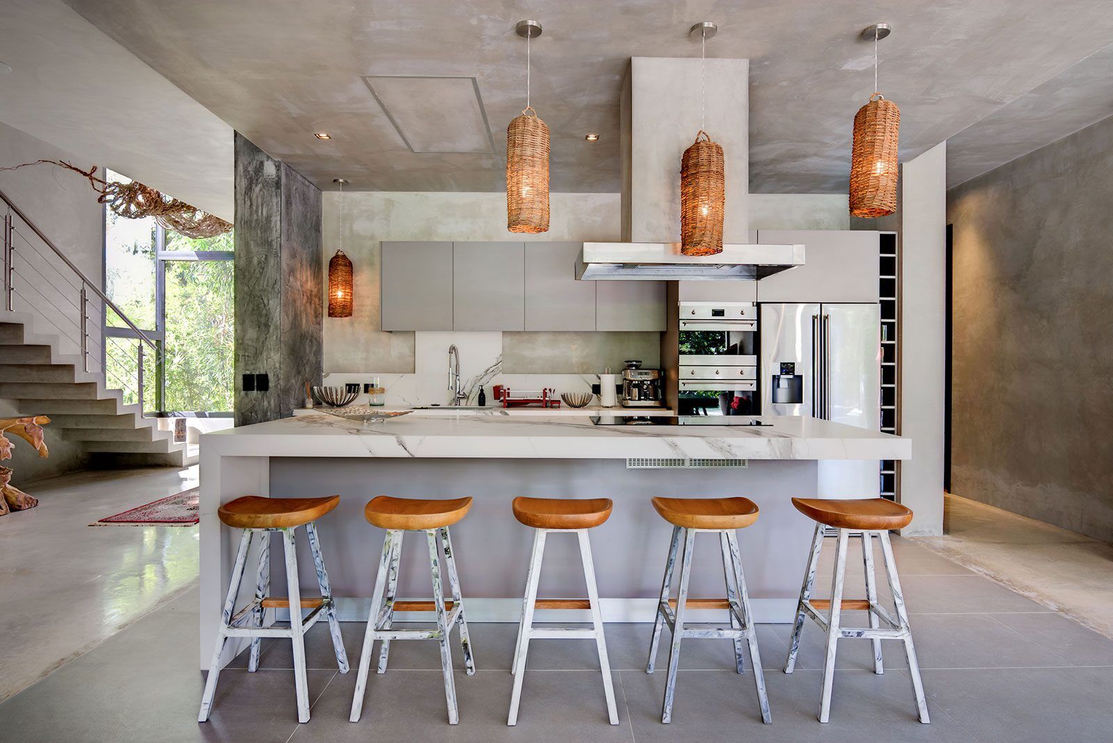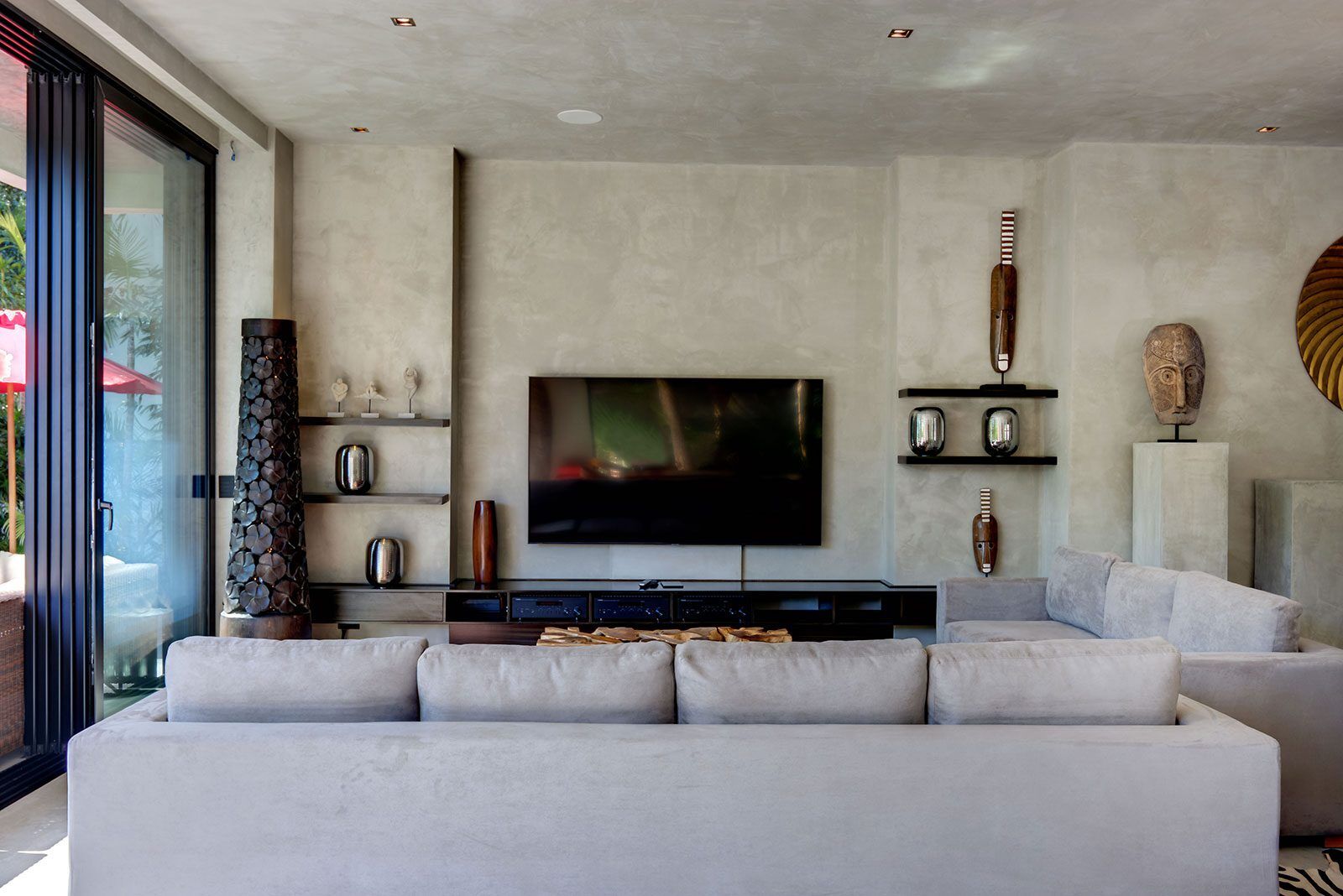 Throughout the villa, clean cement walls are softened by rustic accents and carefully chosen designer furniture, some with a playful, Dali-inspired touch. The result is a minimalistic yet characterful environment where every room feels considered. Indoors flows easily to the pool and lounge area, where the surrounding greenery frames a quiet space for unwinding, socializing, or simply enjoying the calm of the neighborhood at any time of day.