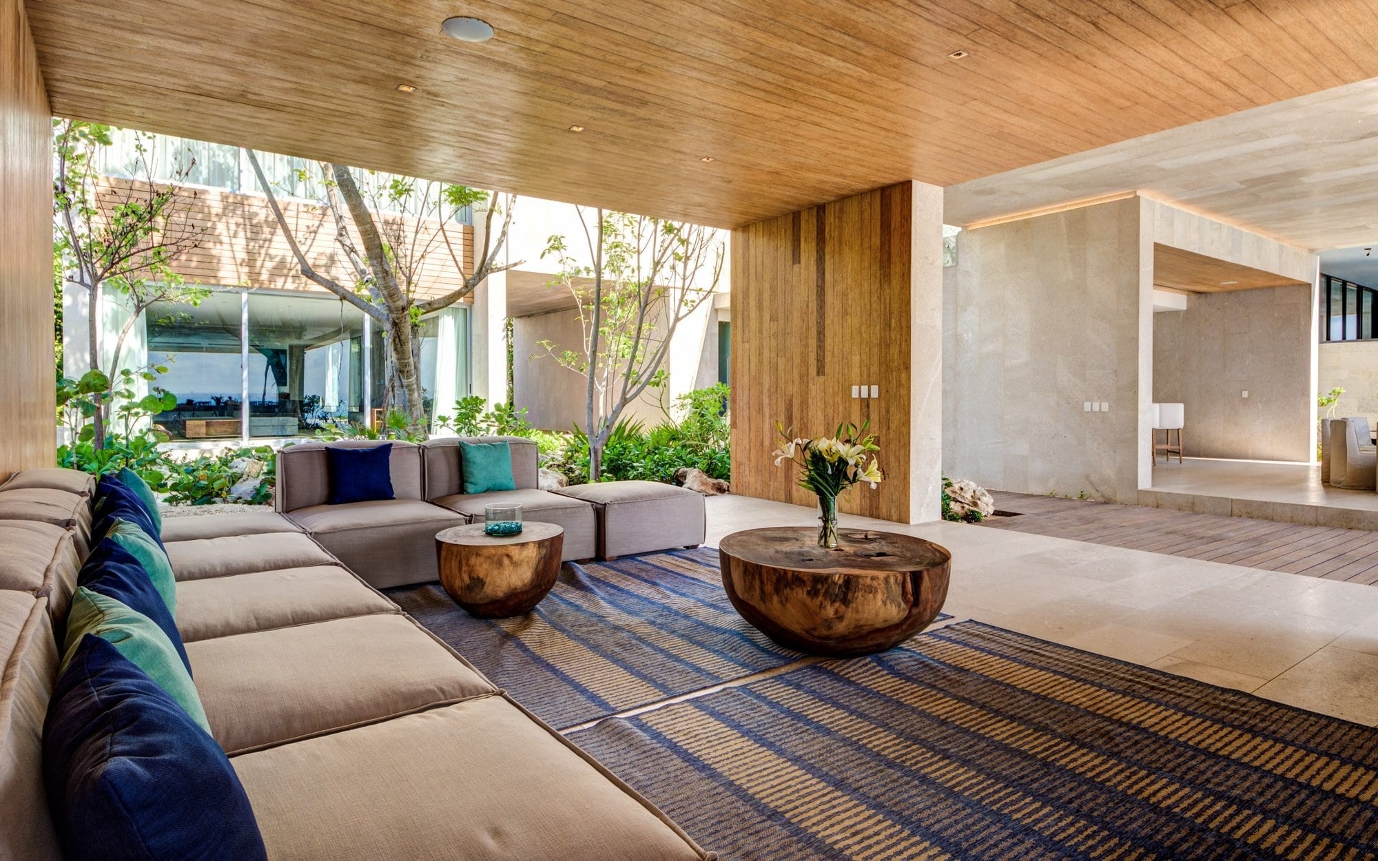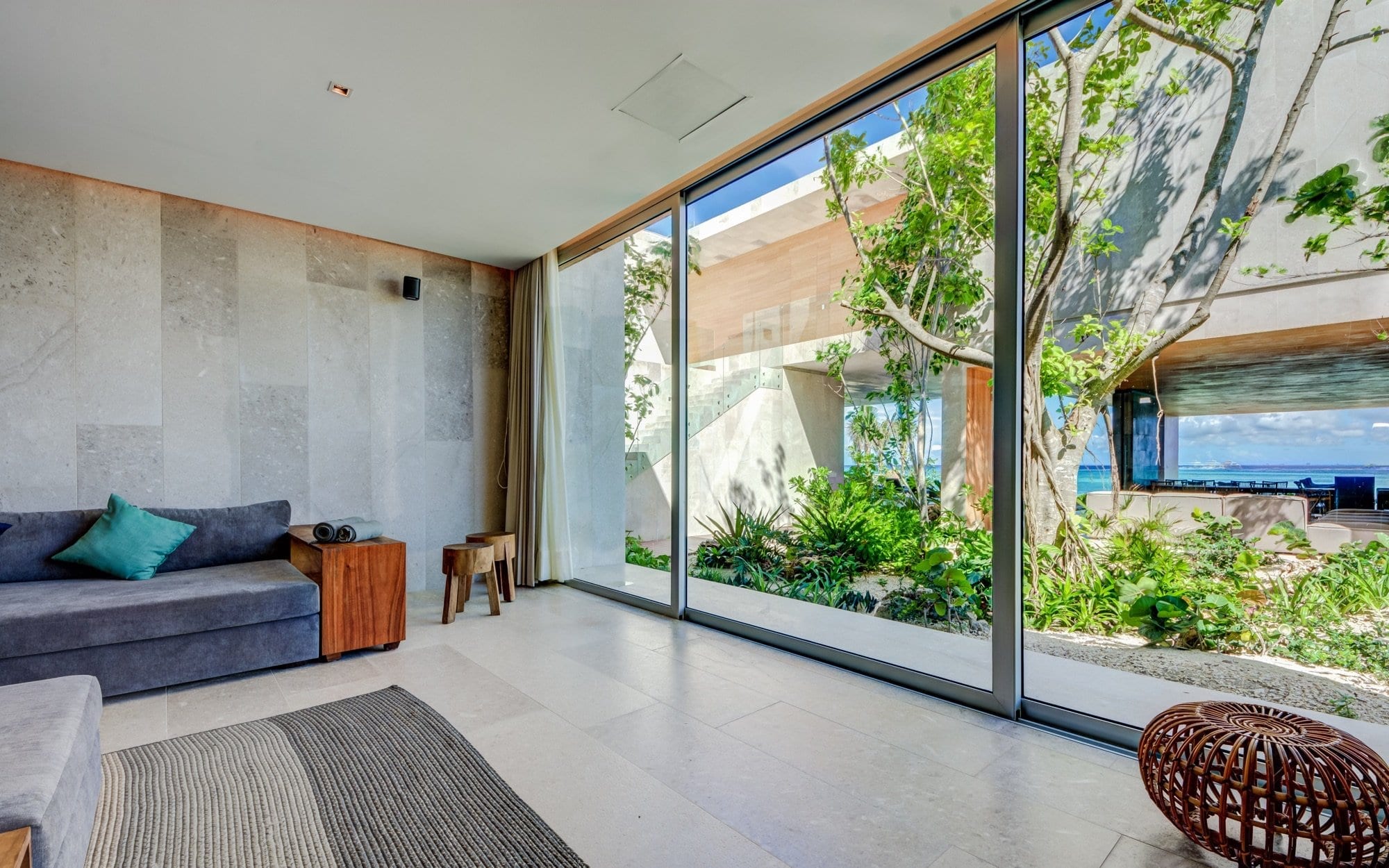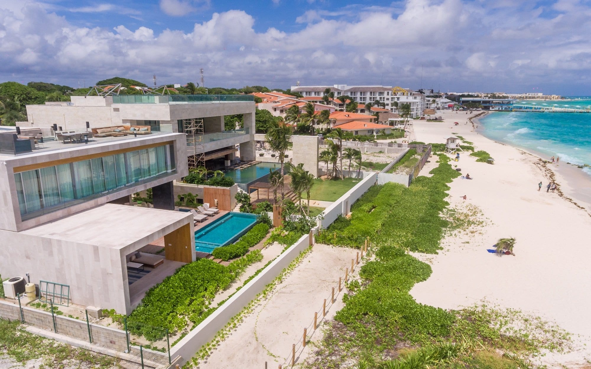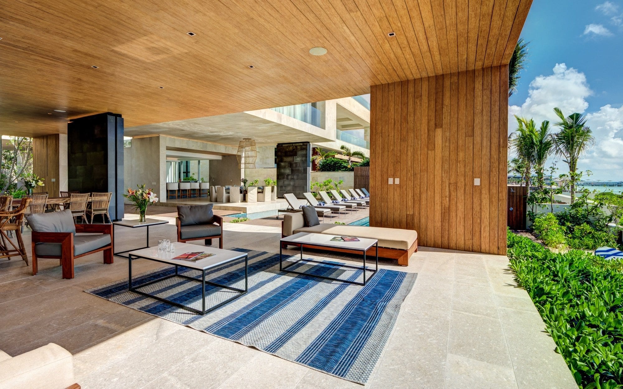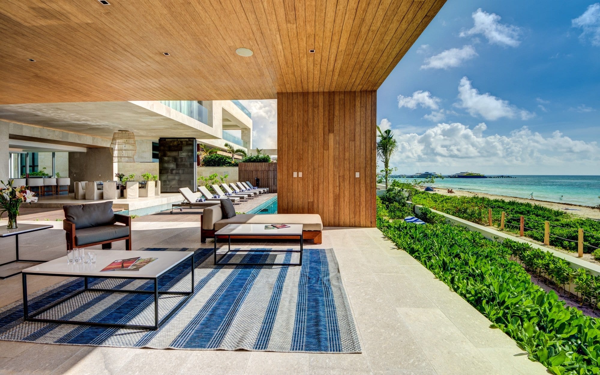 Set within the private, exclusive gated community of Playacar, the villa sits just a short distance inside the entrance, offering a sense of seclusion while remaining discreetly connected to its surroundings. Arrival is through a lush corridor that leads the eye outward to the water, immediately establishing a strong connection to the coastline. The atmosphere is one of calm and privacy, with the beachfront location anchoring the entire experience.