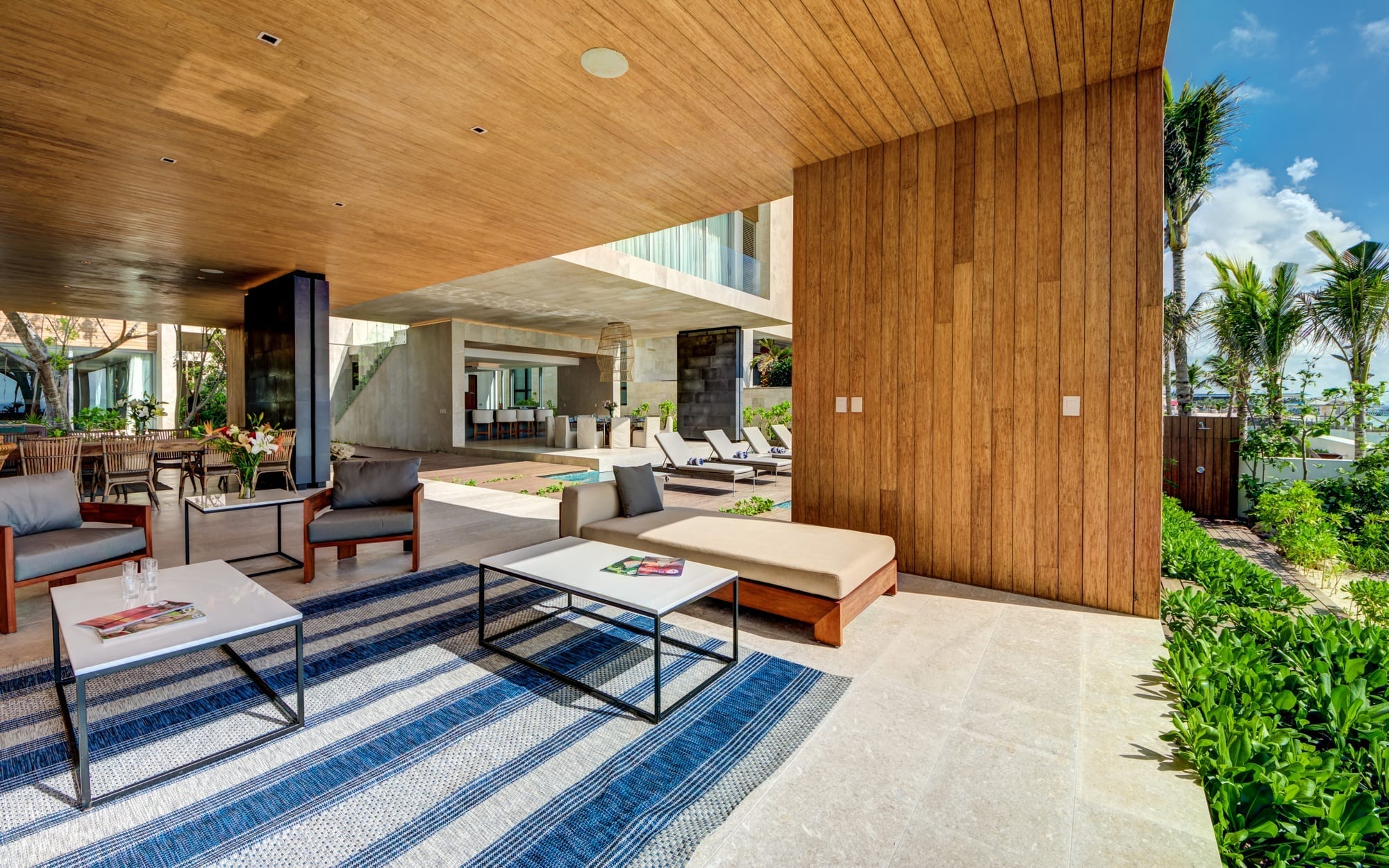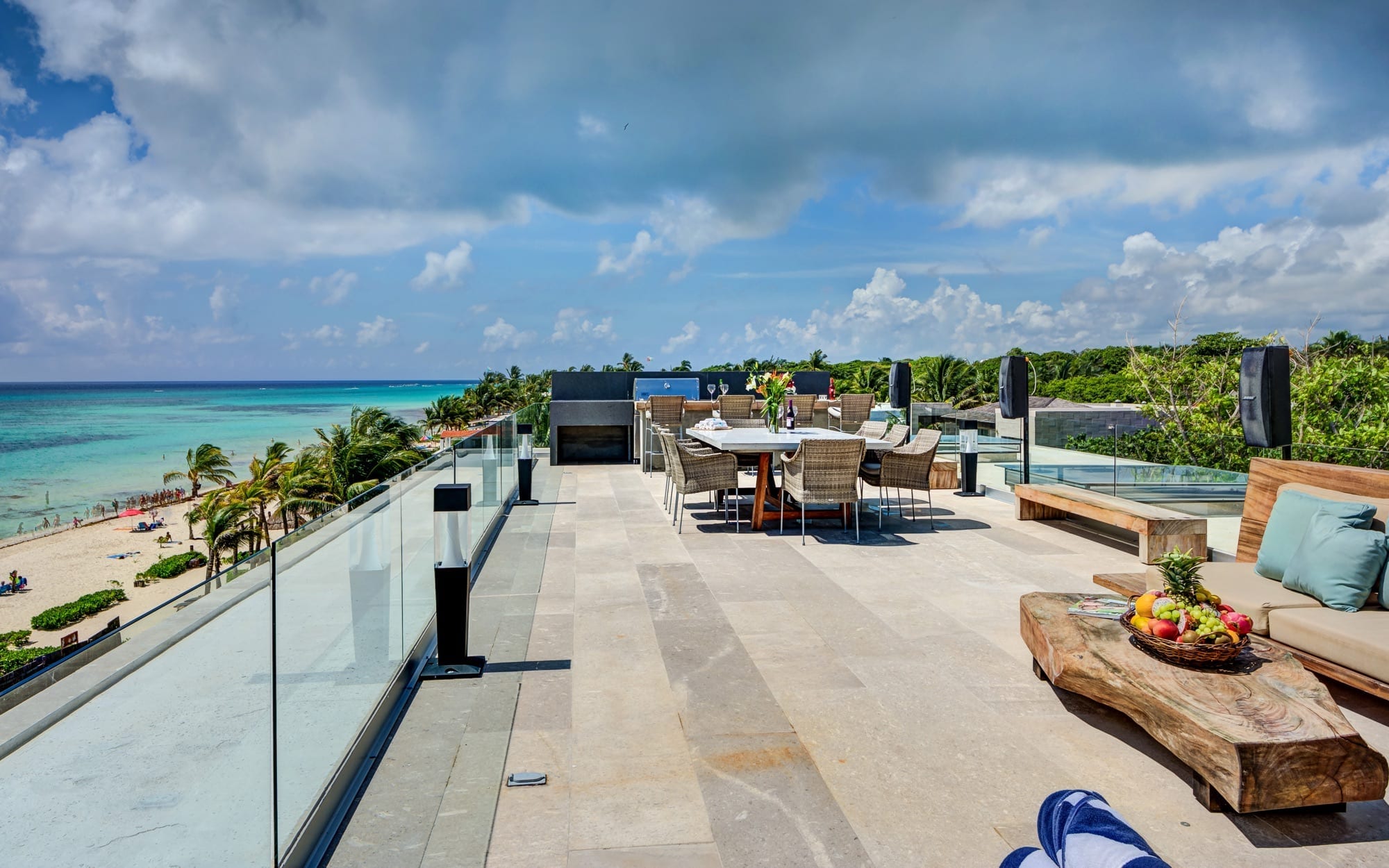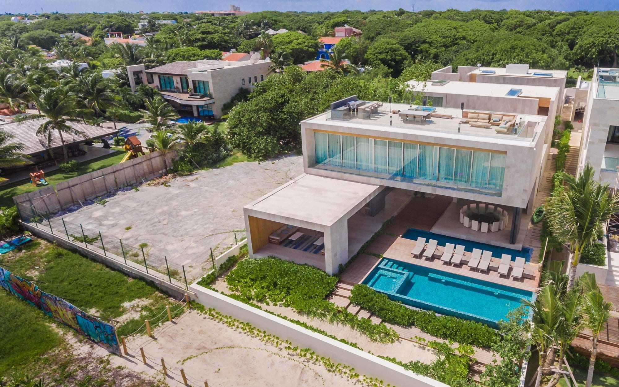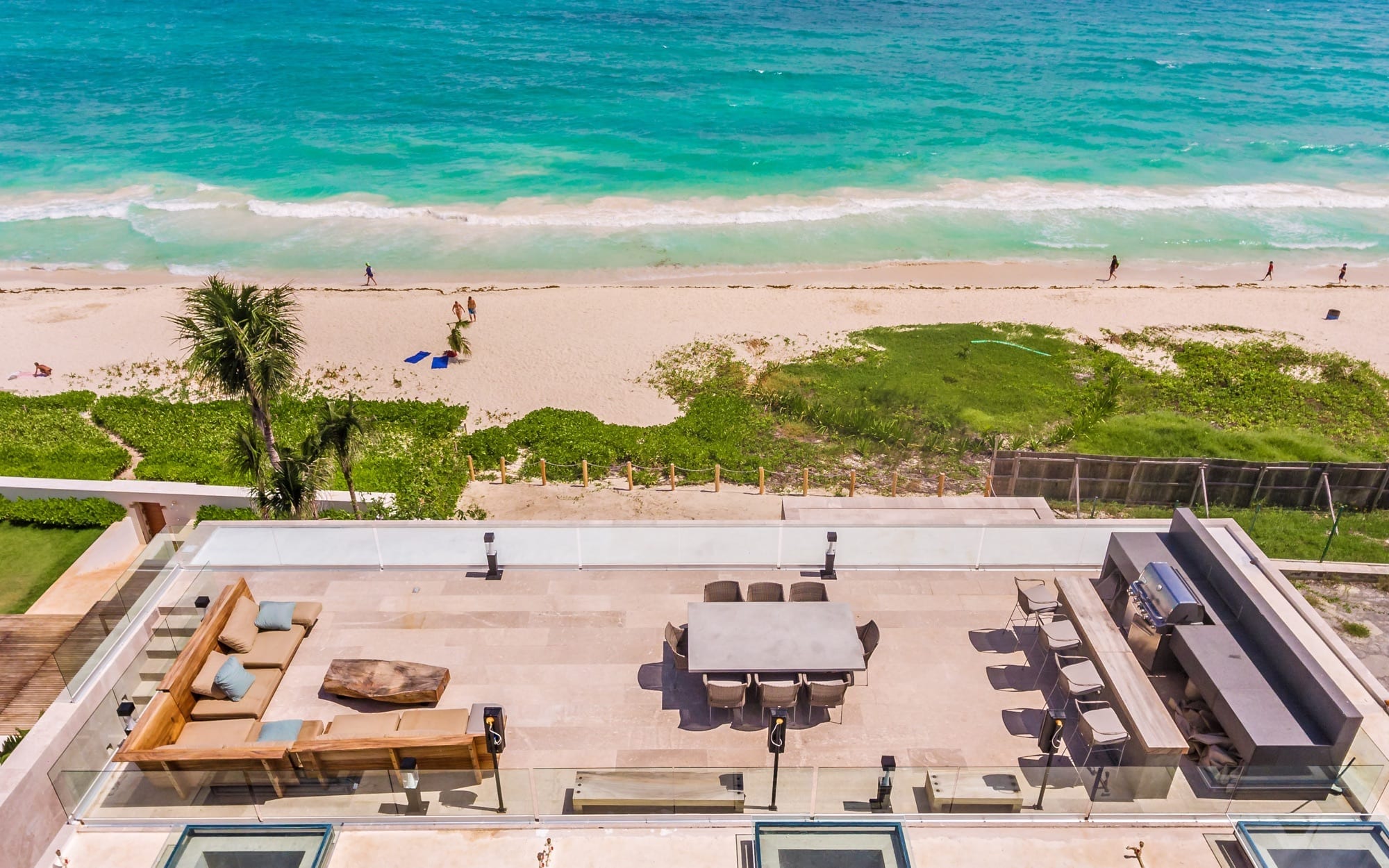 Life at the villa naturally orients toward the outdoors, with expansive exterior living and dining areas flowing out toward the beach. Guests can move easily between lounging by the pool, stepping down to the sand, or ascending to the rooftop, where the elevated setting invites lingering over the ocean breeze and evening light. Throughout the day, the house supports an easy rhythm of sun, shade, conversation, and quiet moments, whether you are gathering as a group or seeking a private corner.