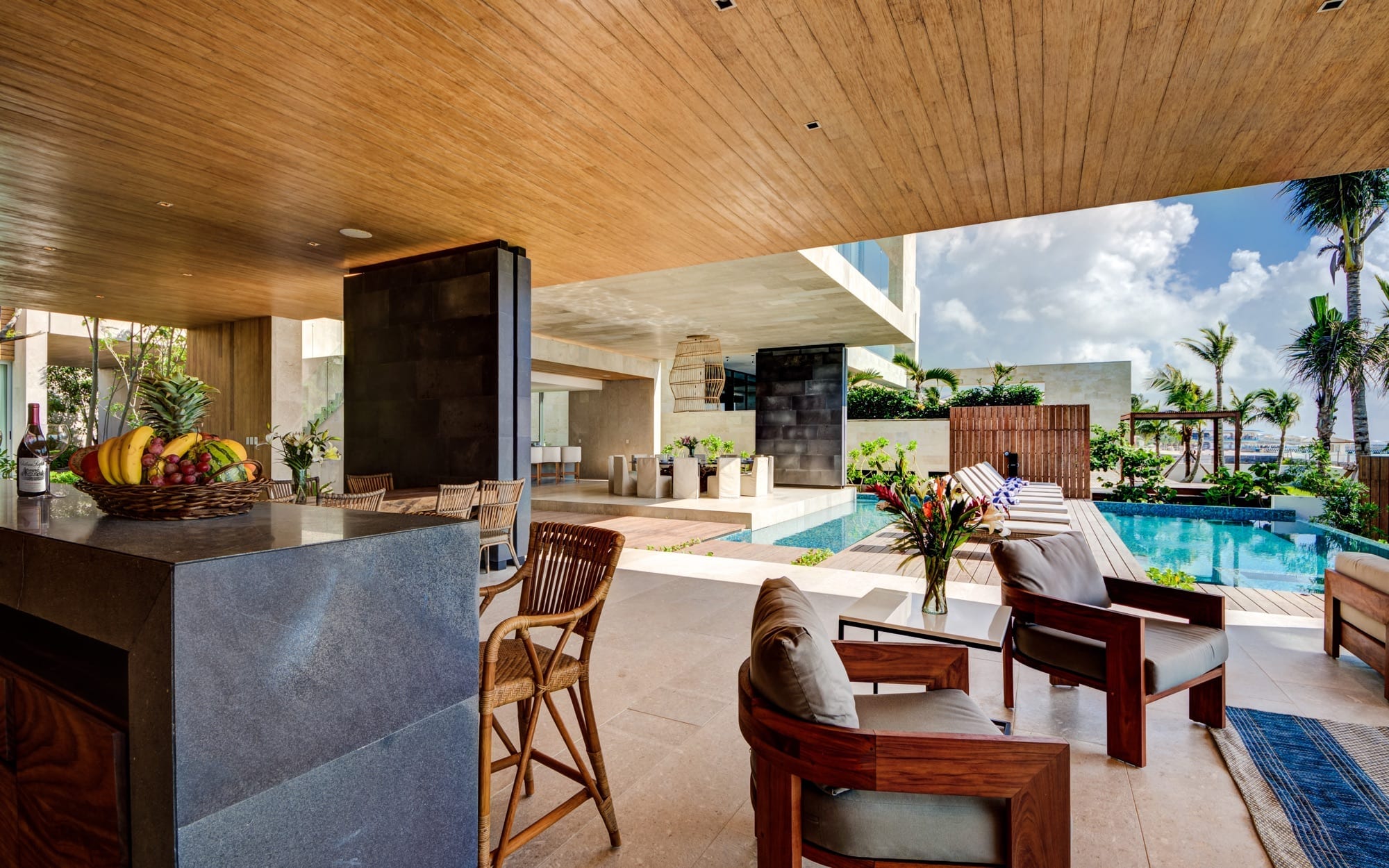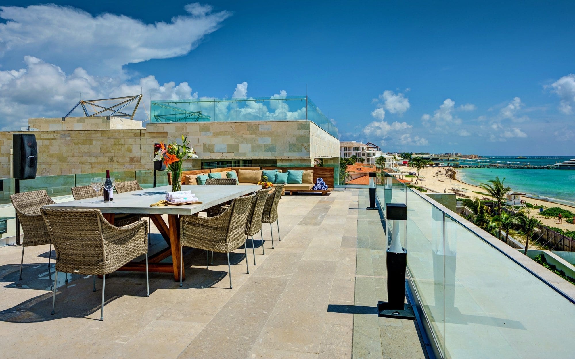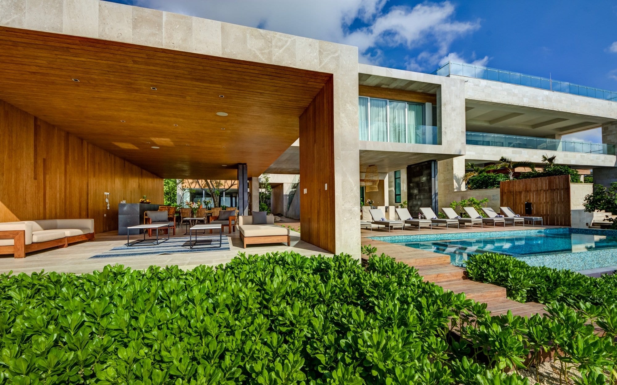 Life at the villa naturally orients toward the outdoors, with expansive exterior living and dining areas flowing out toward the beach. Guests can move easily between lounging by the pool, stepping down to the sand, or ascending to the rooftop, where the elevated setting invites lingering over the ocean breeze and evening light. Throughout the day, the house supports an easy rhythm of sun, shade, conversation, and quiet moments, whether you are gathering as a group or seeking a private corner.
