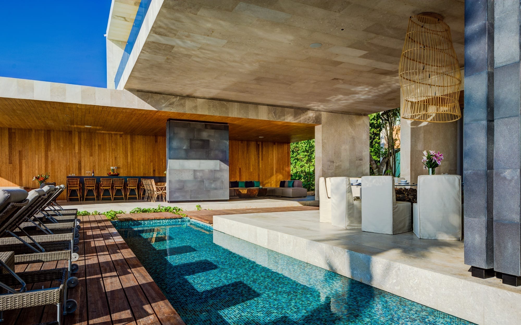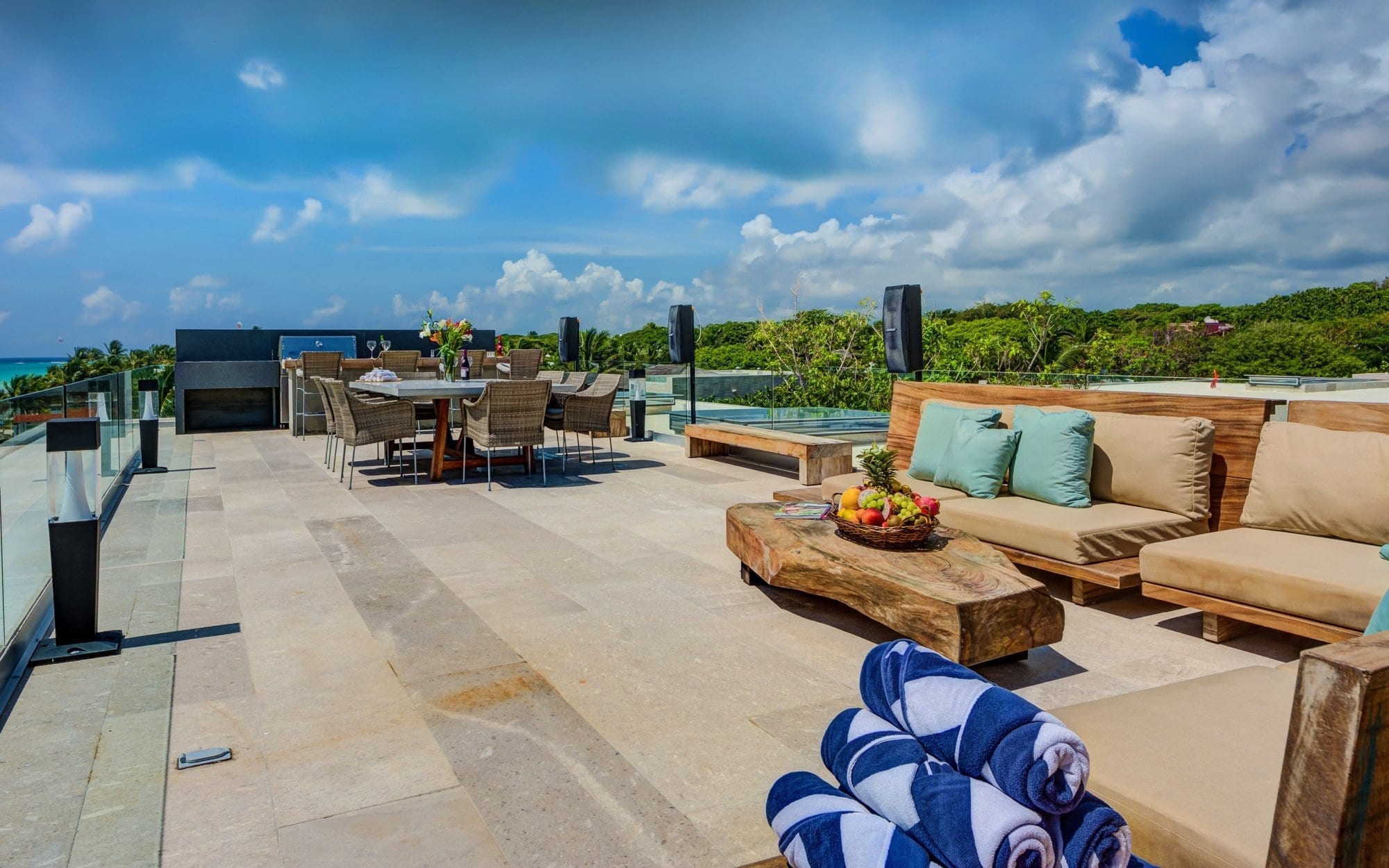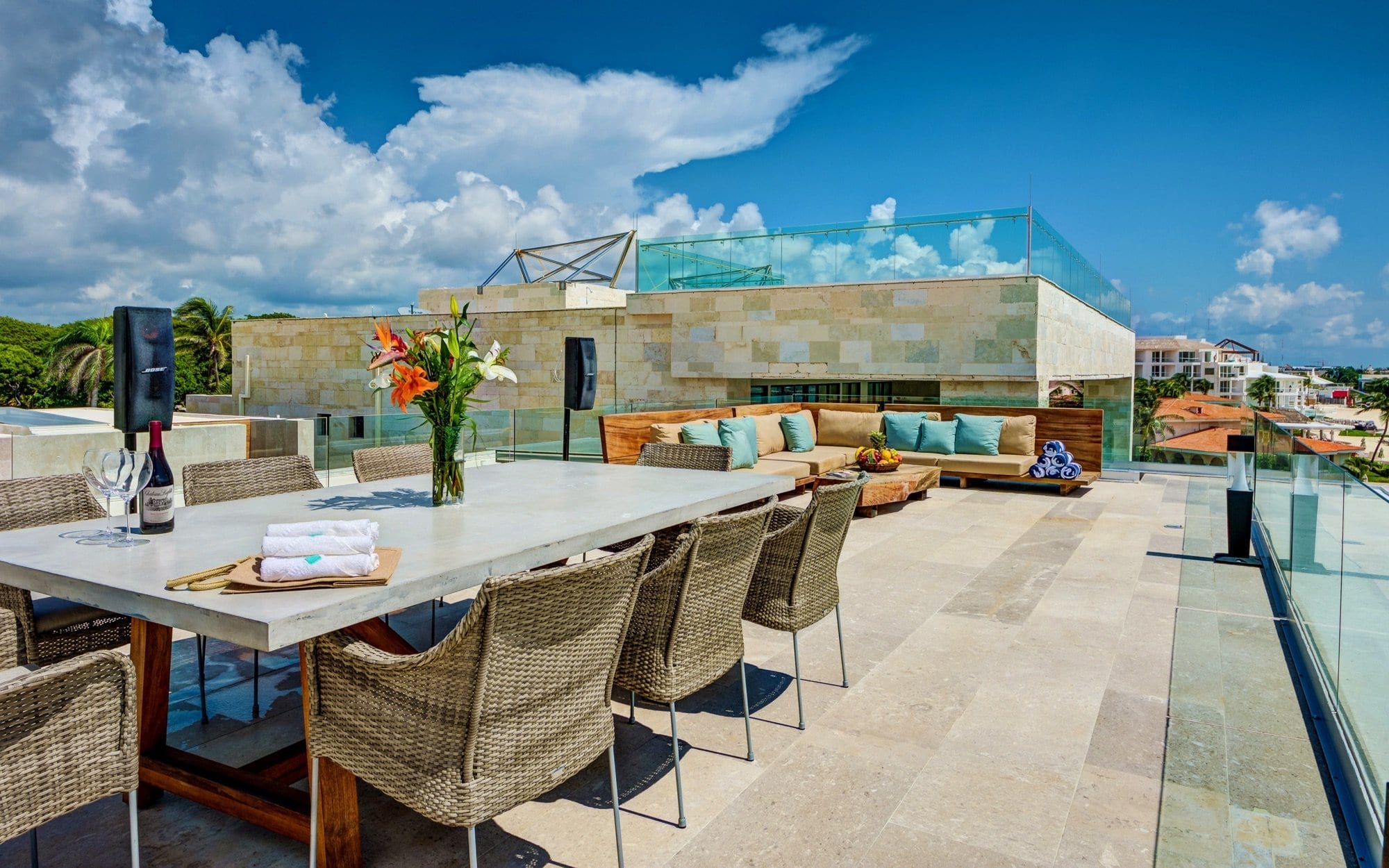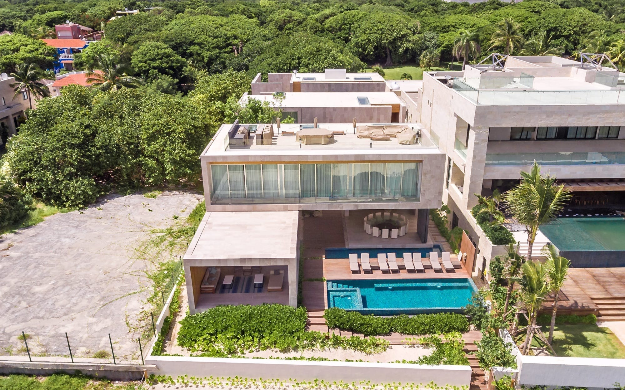 Life at the villa naturally orients toward the outdoors, with expansive exterior living and dining areas flowing out toward the beach. Guests can move easily between lounging by the pool, stepping down to the sand, or ascending to the rooftop, where the elevated setting invites lingering over the ocean breeze and evening light. Throughout the day, the house supports an easy rhythm of sun, shade, conversation, and quiet moments, whether you are gathering as a group or seeking a private corner.