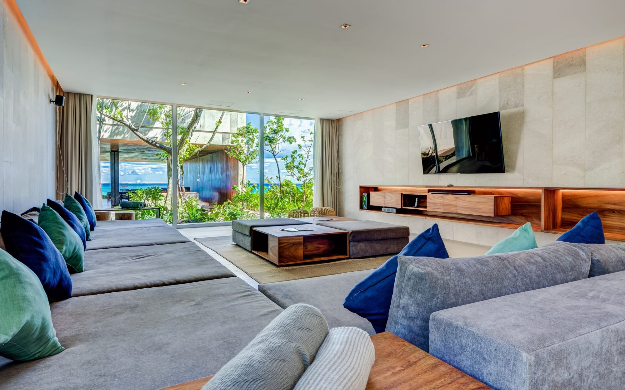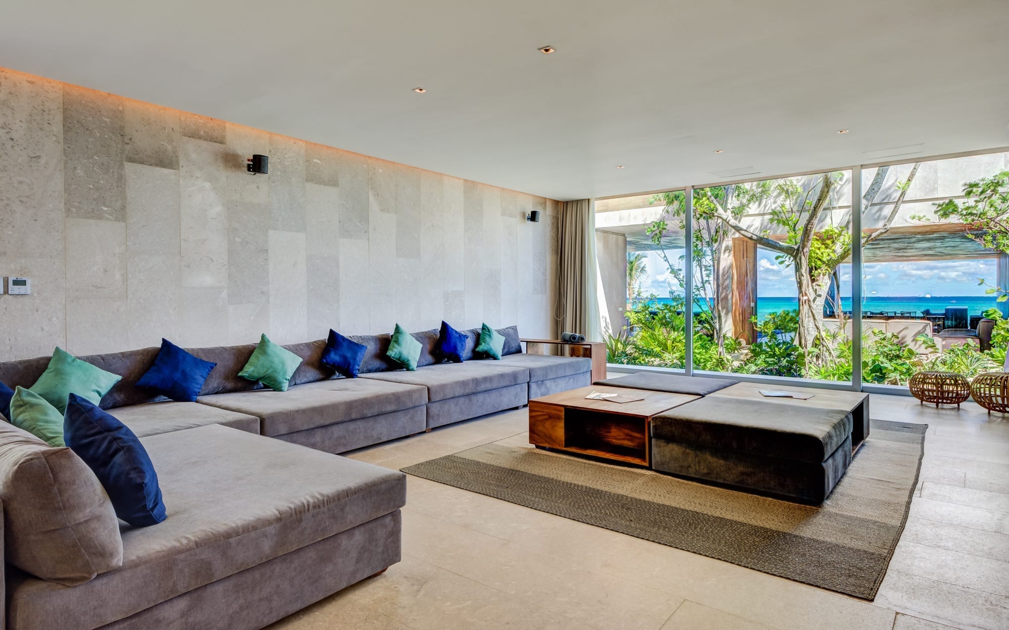 Generous in scale, the villa is designed to host up to 20 guests across seven large bedrooms, allowing groups to stay together comfortably under one roof. Three master suites face the ocean, while the remaining rooms look onto the gardens, creating a balance between open seascape and verdant calm. The overall layout supports both shared time and quiet retreat, with spaces arranged to accommodate families, couples, and friends traveling together.