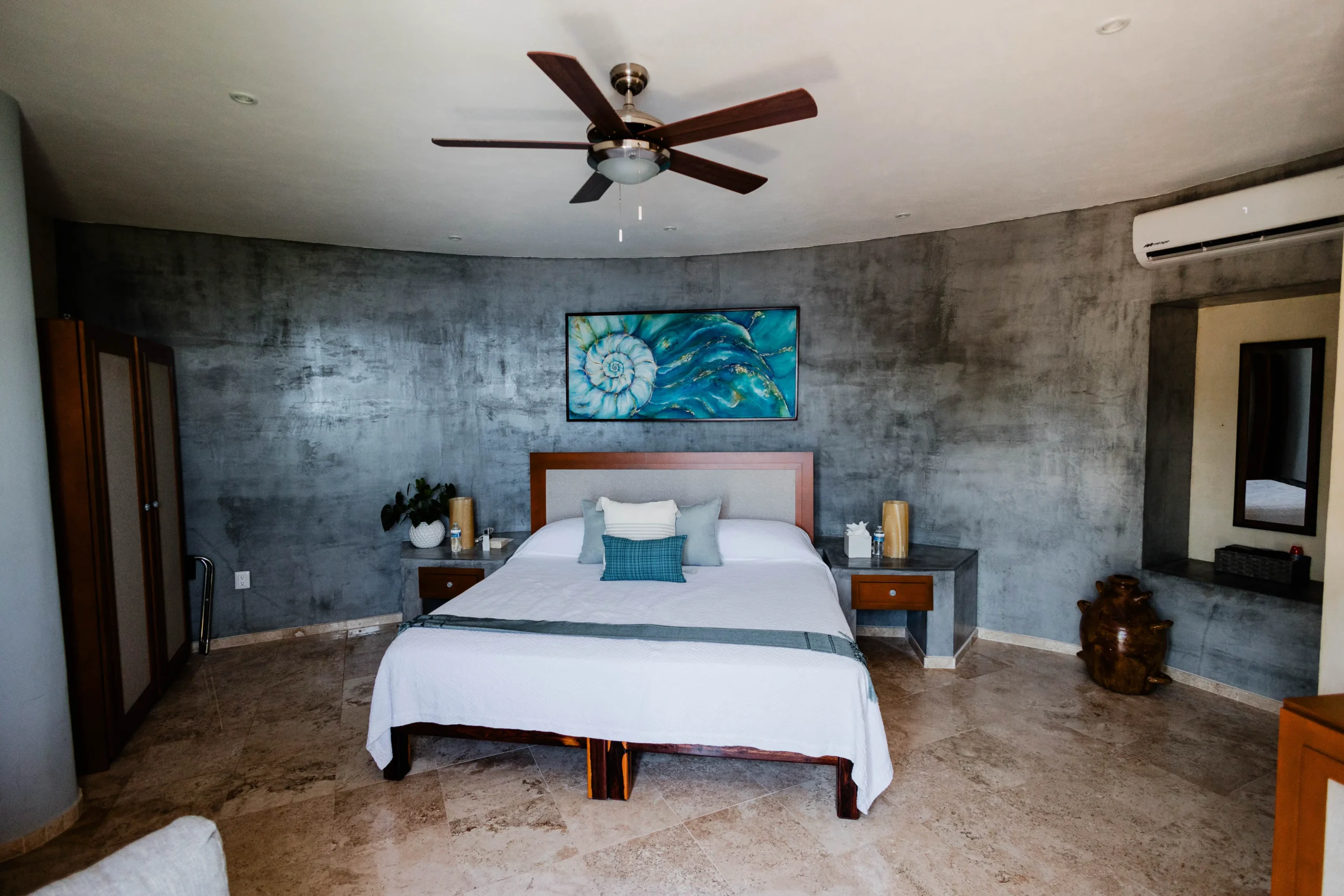 King-size bed, en-suite bathroom with shower and toilet, closet, air conditioning, Wi-Fi, ocean and Los Arcos views.