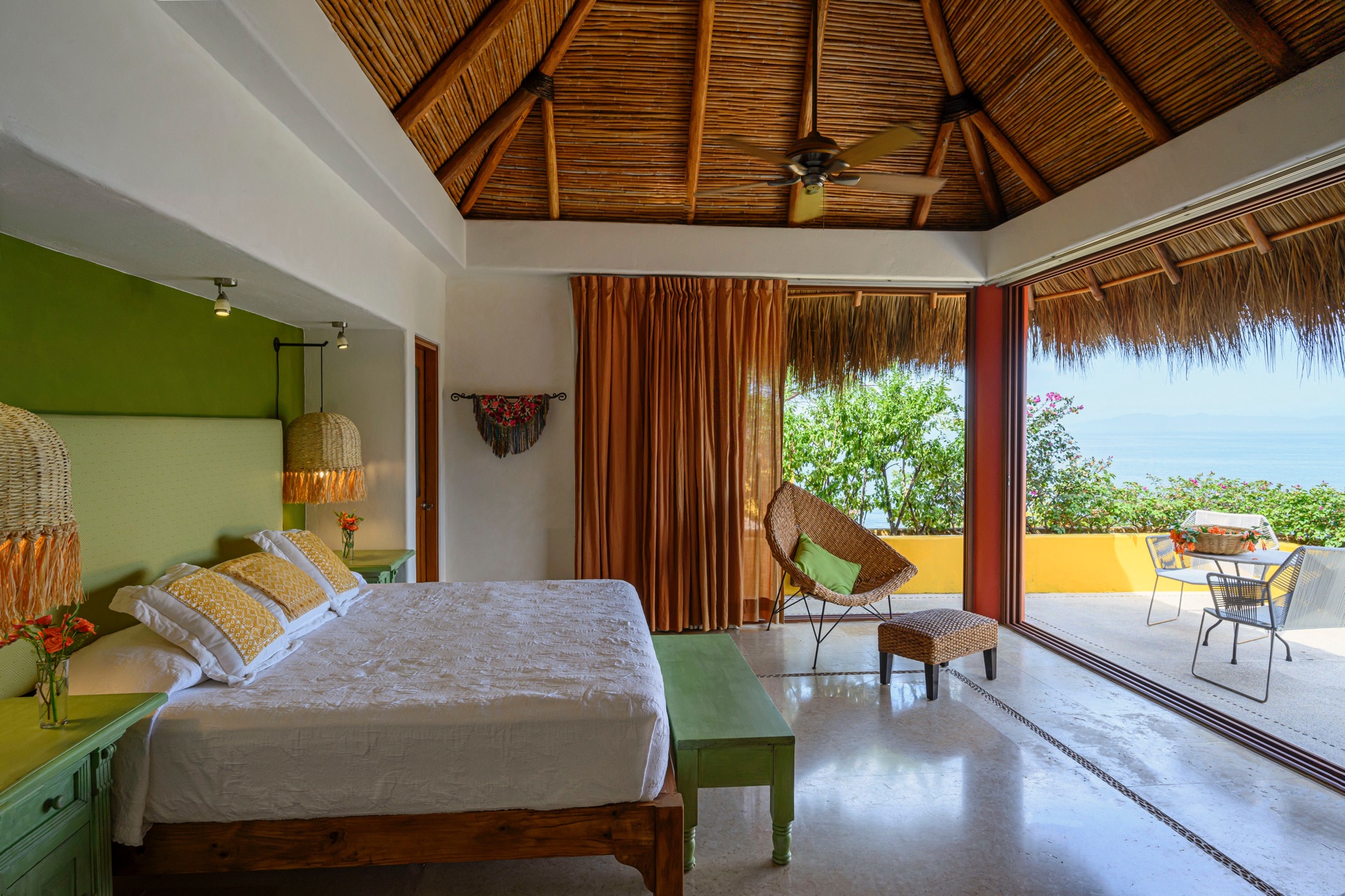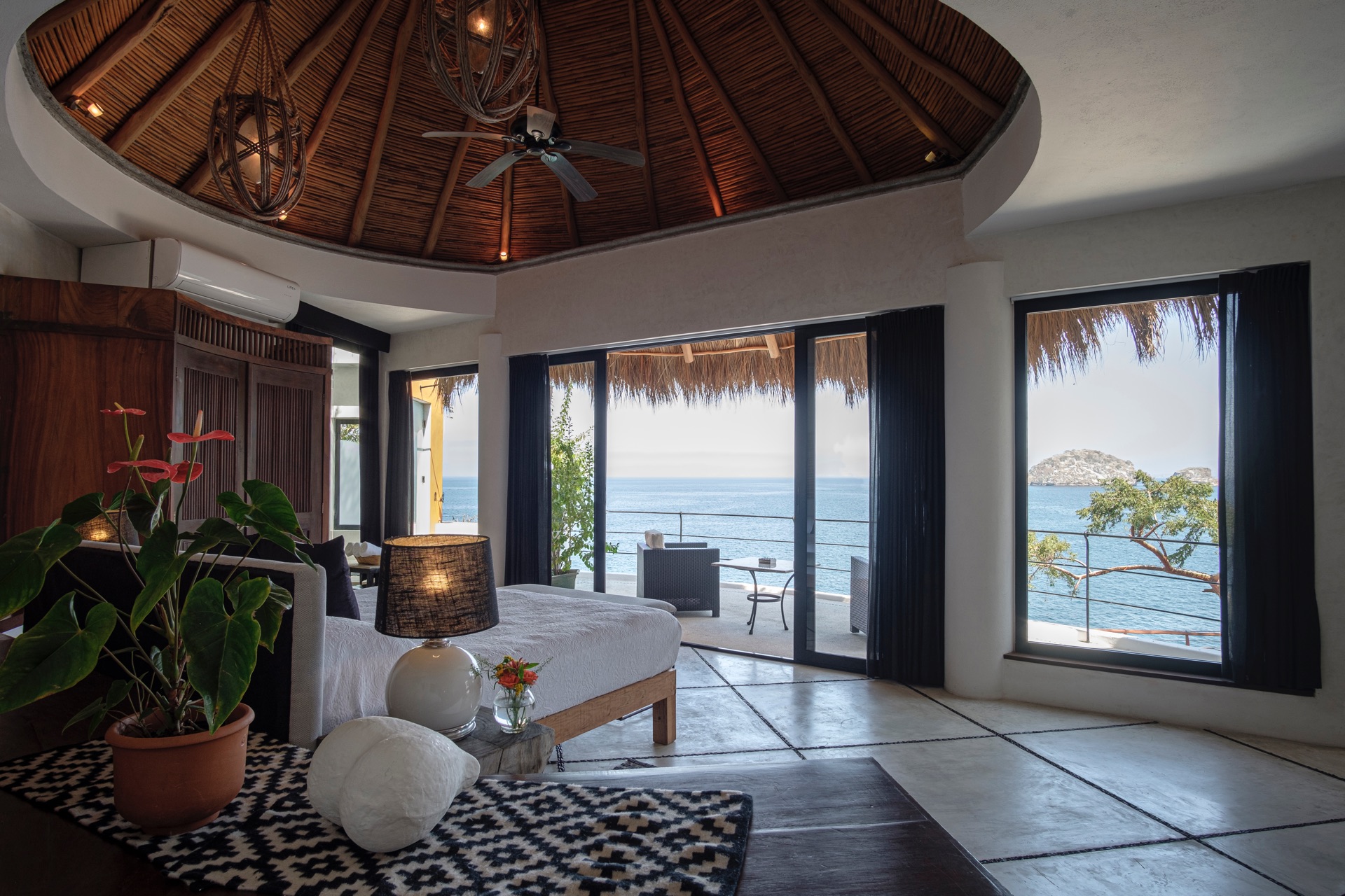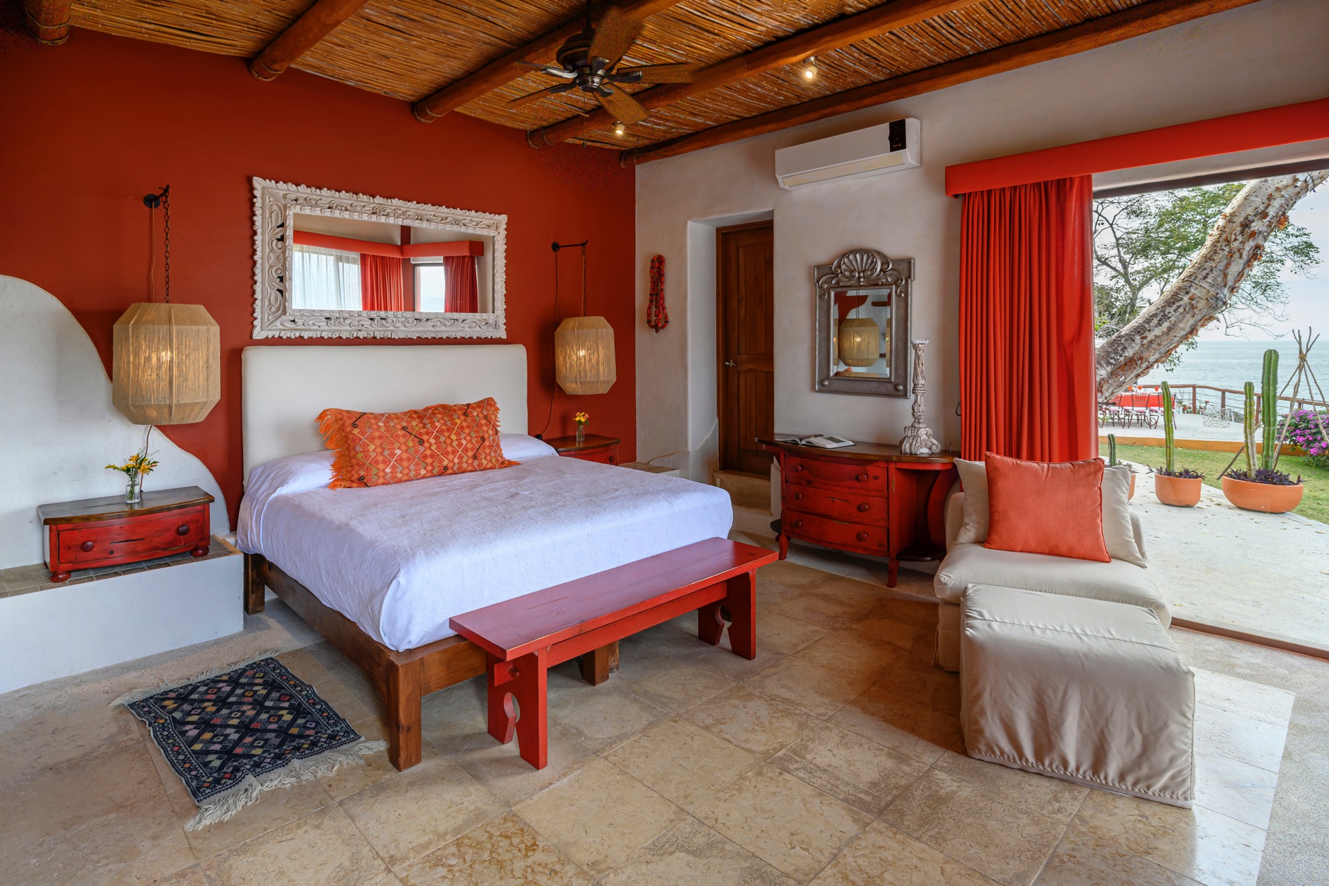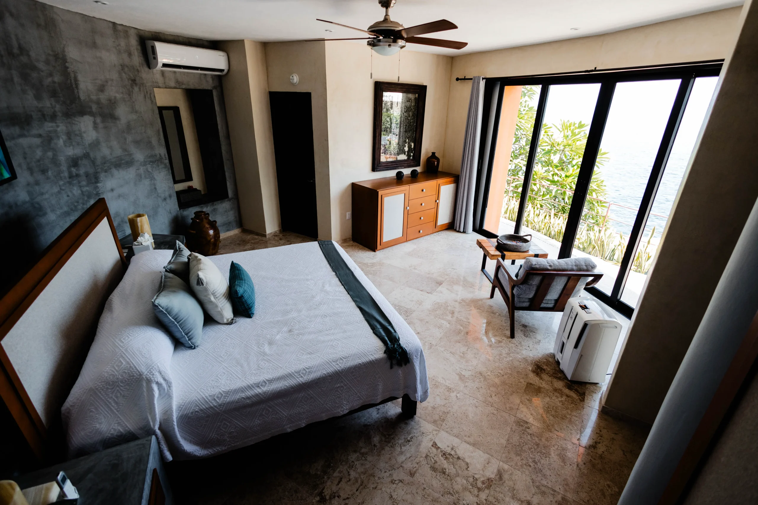 King-size bed, en-suite bathroom with double vanity, terrace with lounge chairs, ceiling fan, air conditioning, ocean and Los Arcos views.
