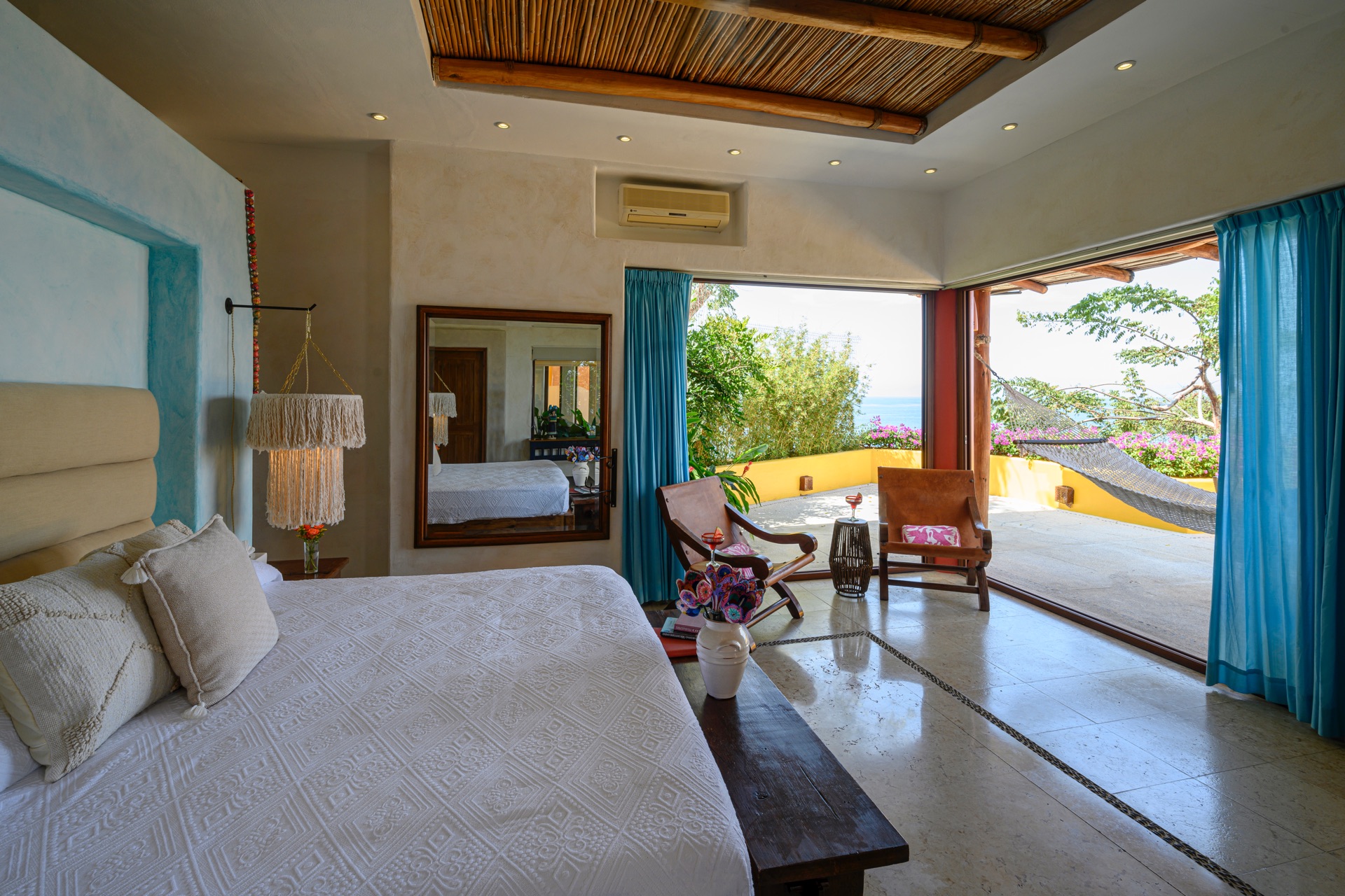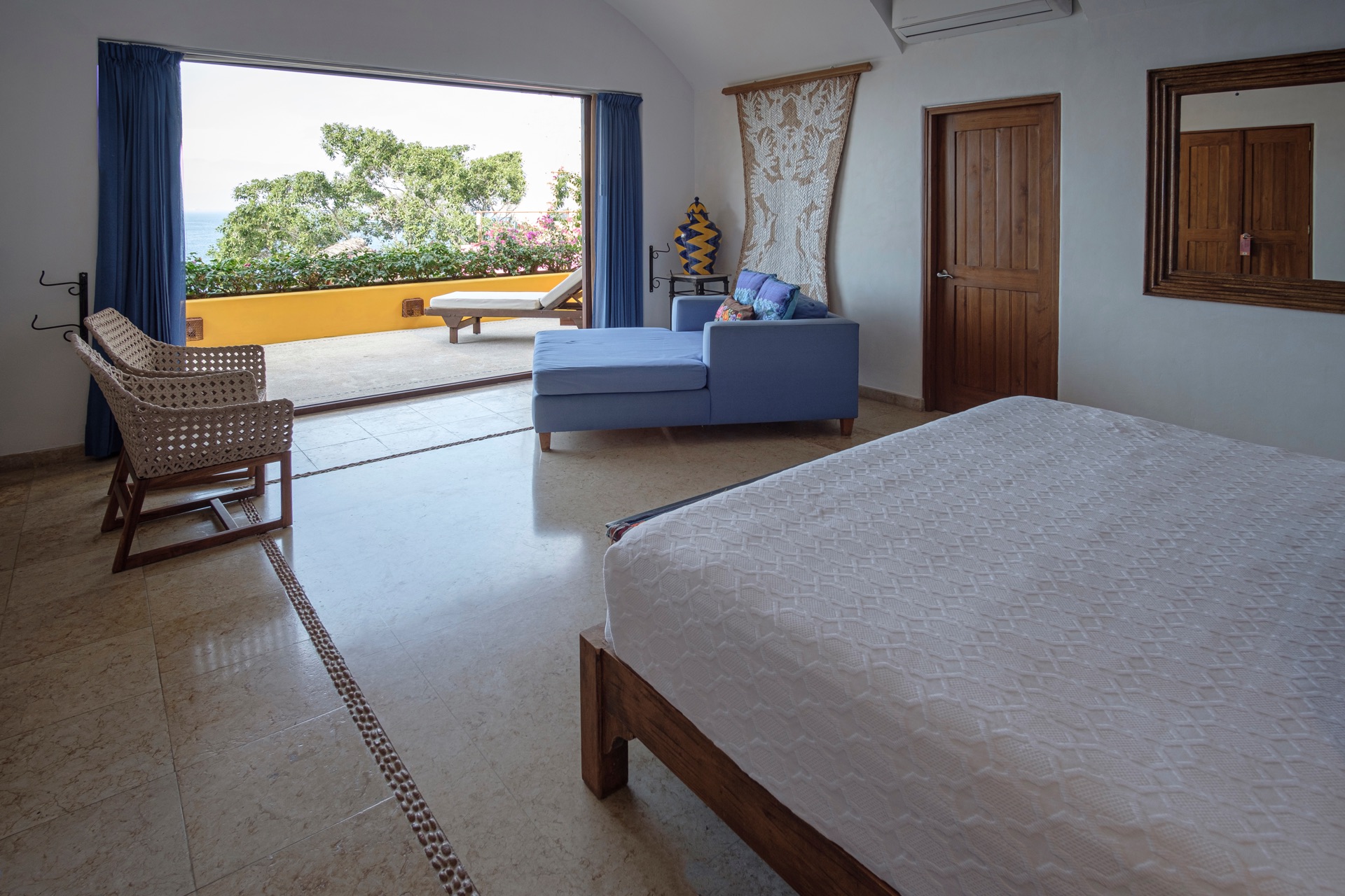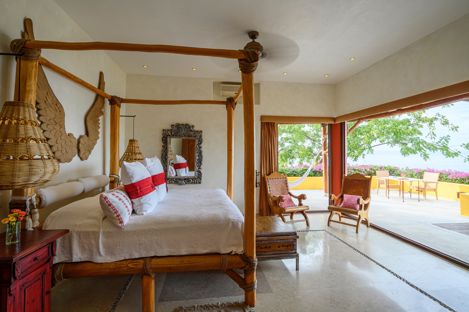 King-size bed, en-suite bathroom with double vanity, terrace with lounge chairs, ceiling fan, air conditioning, ocean and Los Arcos views.