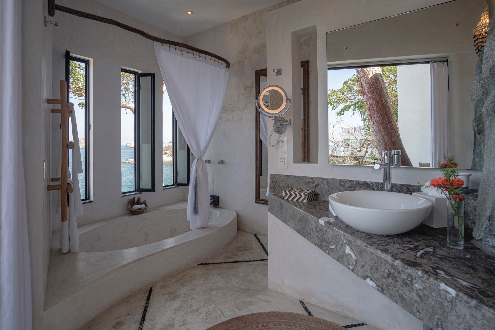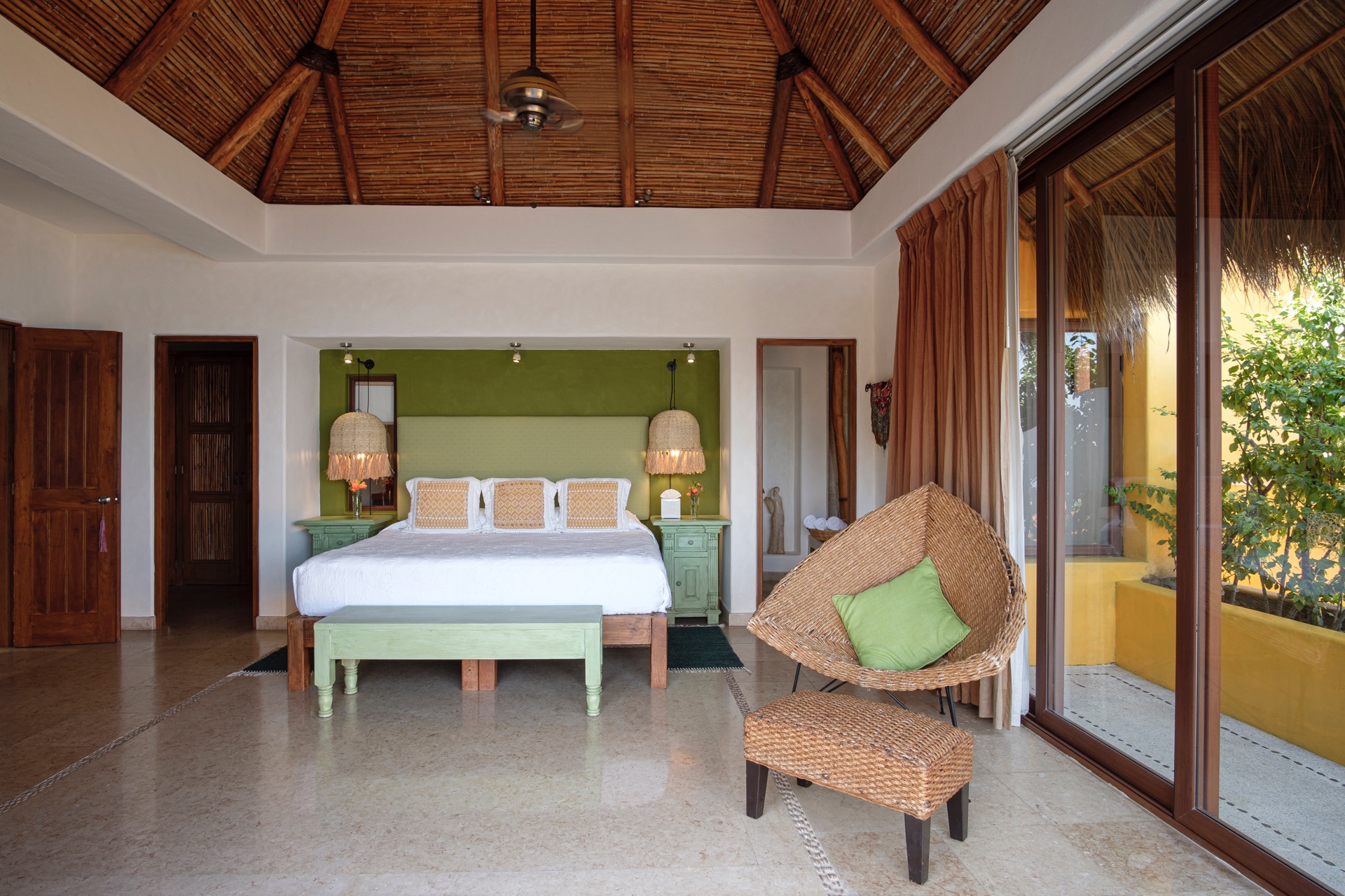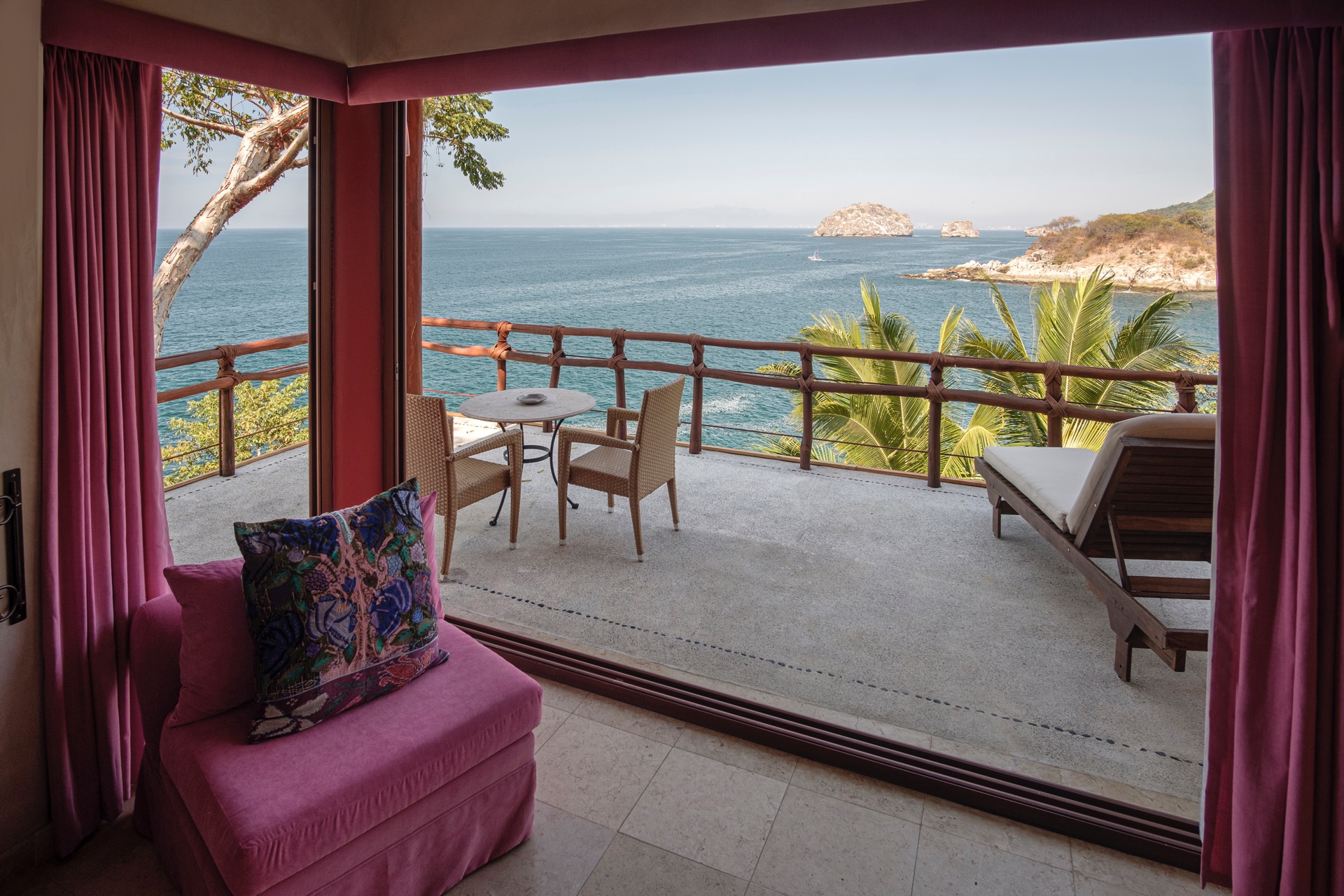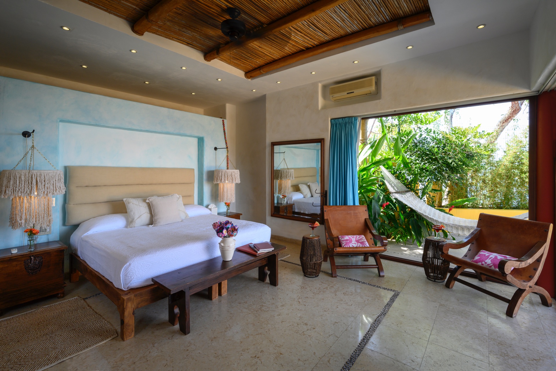 King-size bed, en-suite bathroom with double vanity, terrace with lounge chairs, ceiling fan, air conditioning, ocean and Los Arcos views.