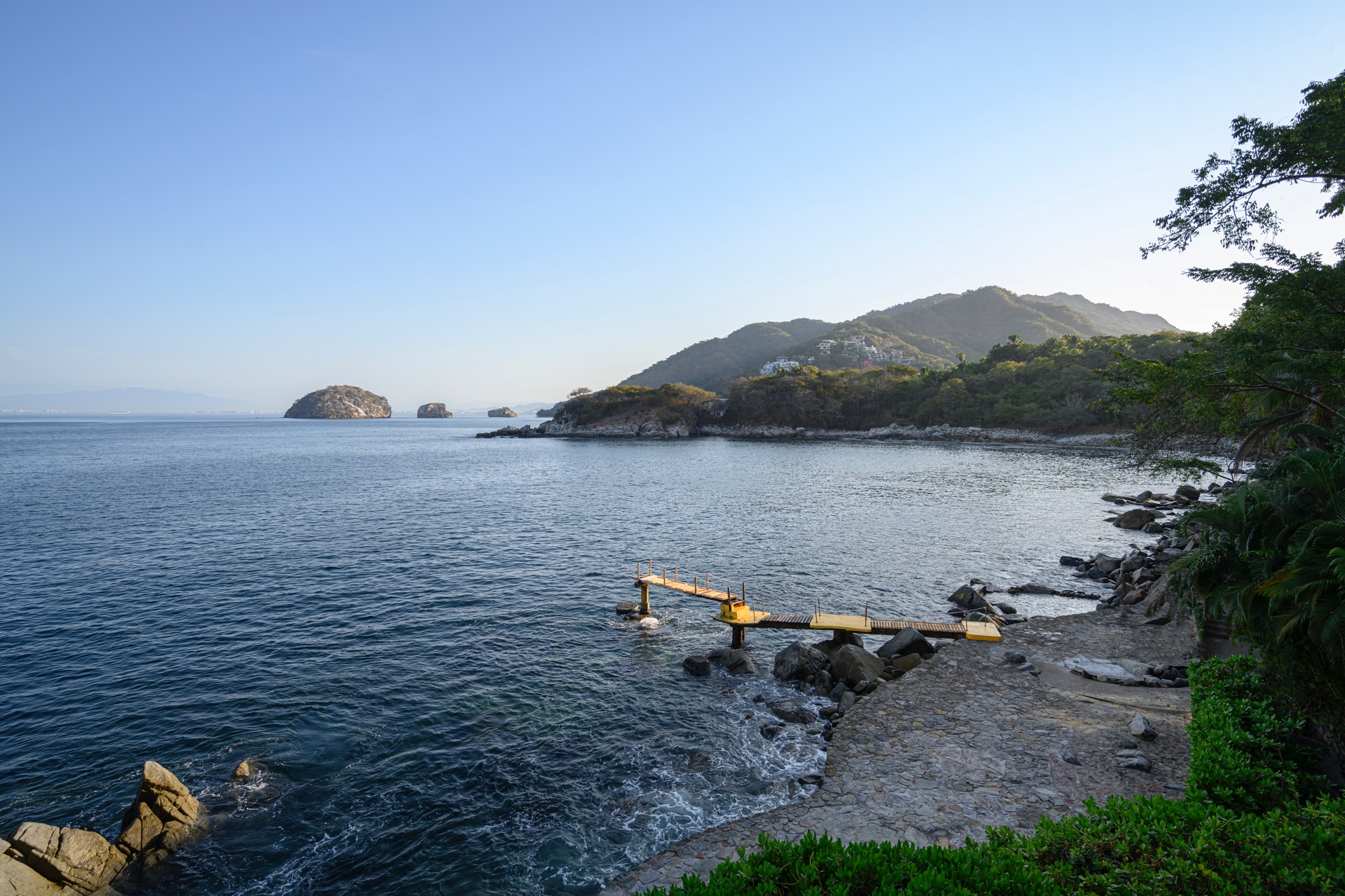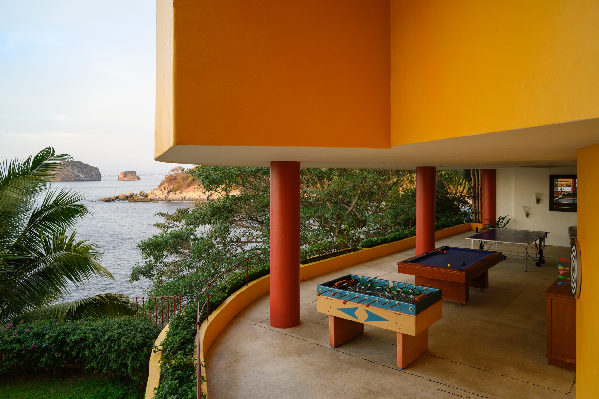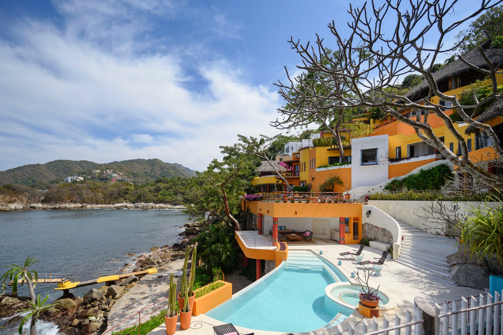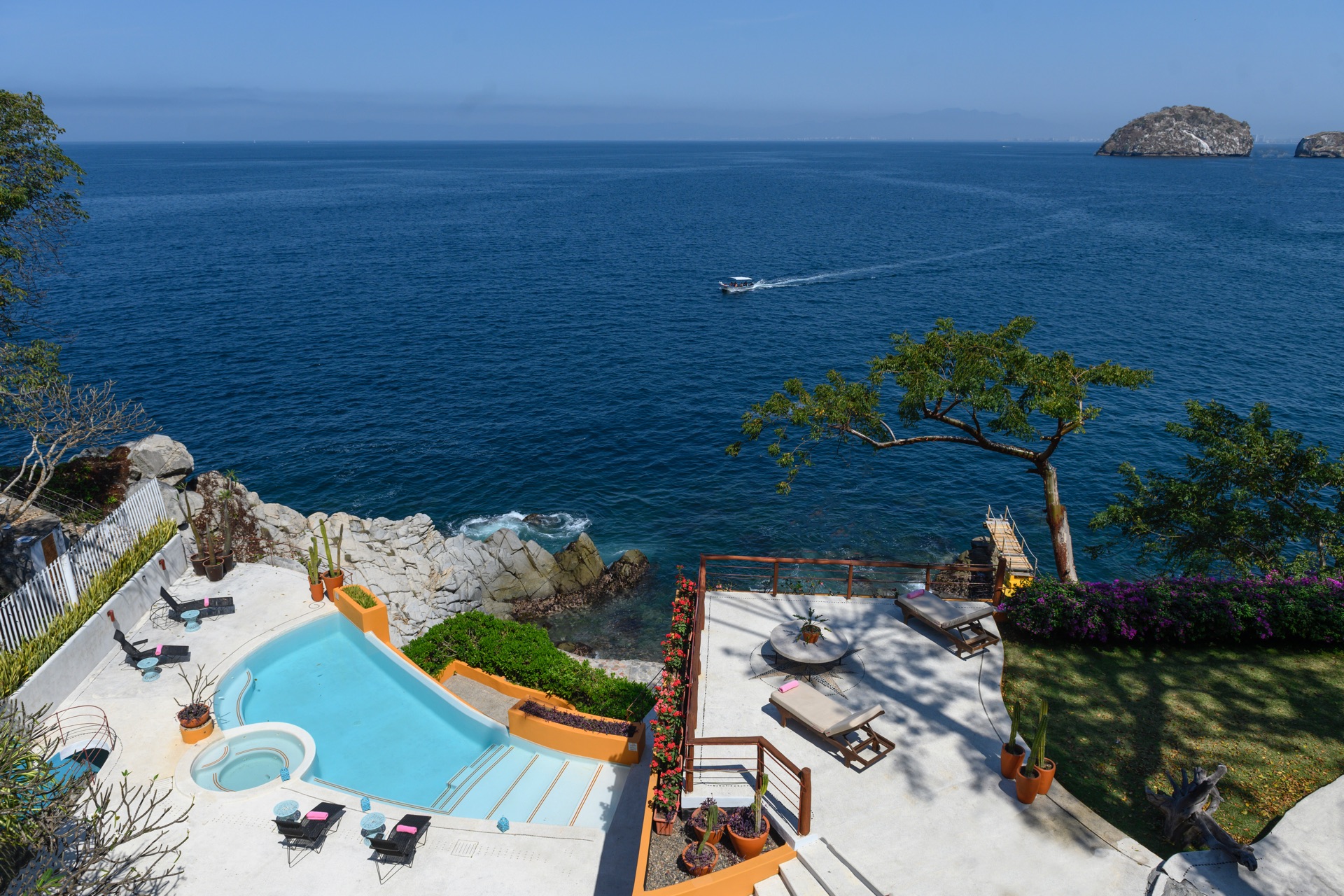 The villa is set along the city’s exclusive south shore, just past Mismaloya Beach, in an environment defined by greenery, water, and a strong sense of seclusion. Outdoor areas are oriented around the coastline, with terraces, gardens, and a private pier shaping the connection to the sea. The atmosphere is that of a private compound, with distinct zones for quiet relaxation, socializing, and events, all framed by the natural landscape.