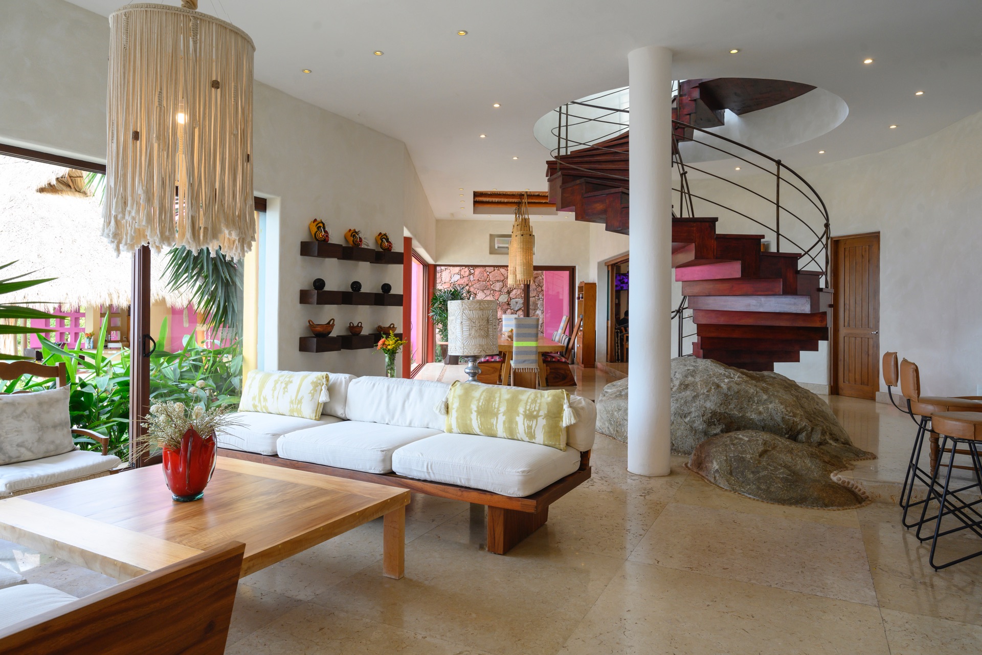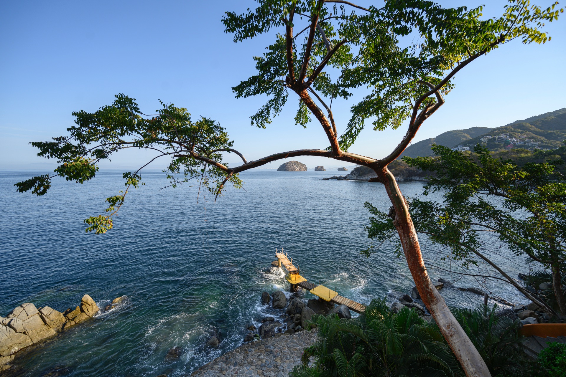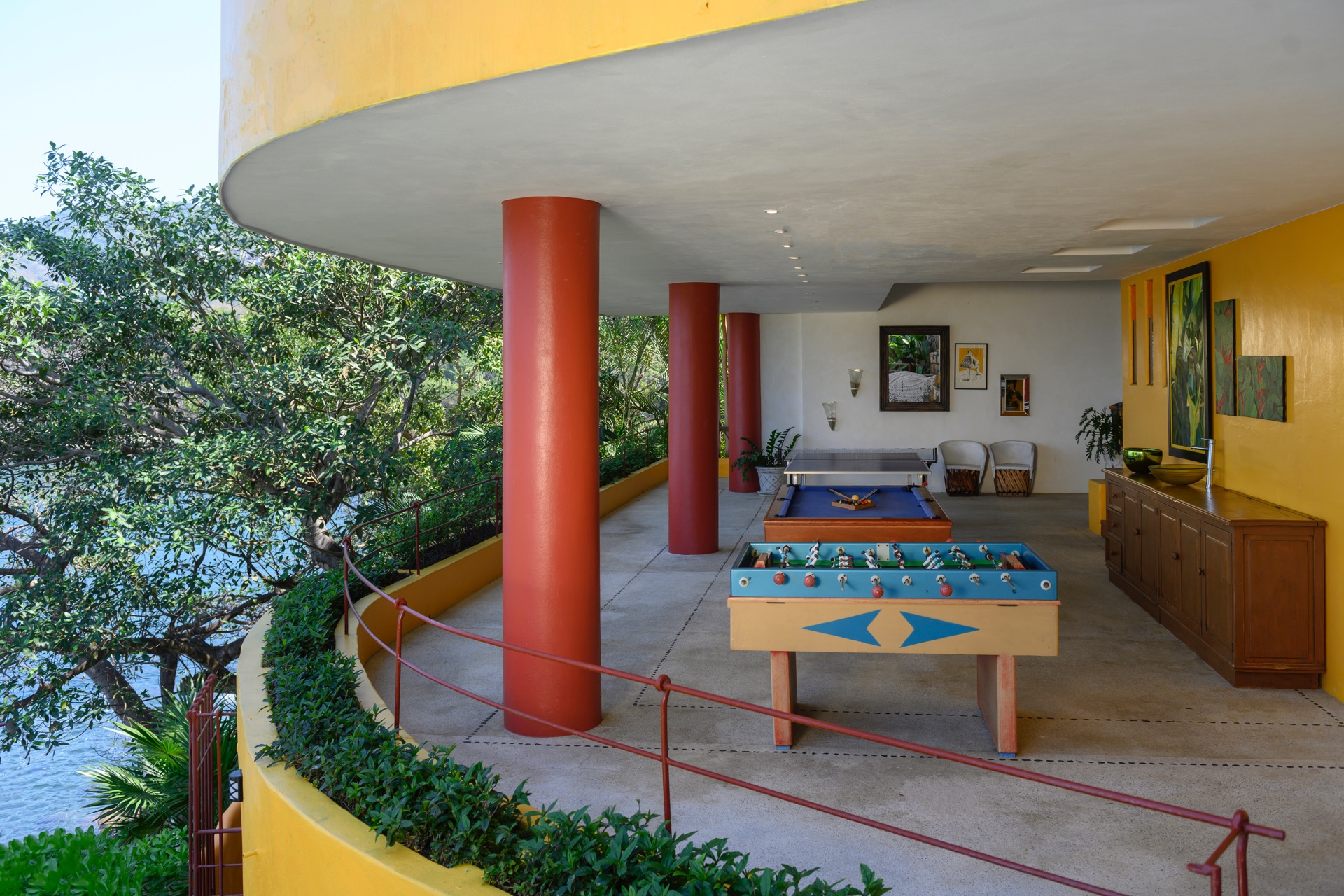 The villa is set along the city’s exclusive south shore, just past Mismaloya Beach, in an environment defined by greenery, water, and a strong sense of seclusion. Outdoor areas are oriented around the coastline, with terraces, gardens, and a private pier shaping the connection to the sea. The atmosphere is that of a private compound, with distinct zones for quiet relaxation, socializing, and events, all framed by the natural landscape.