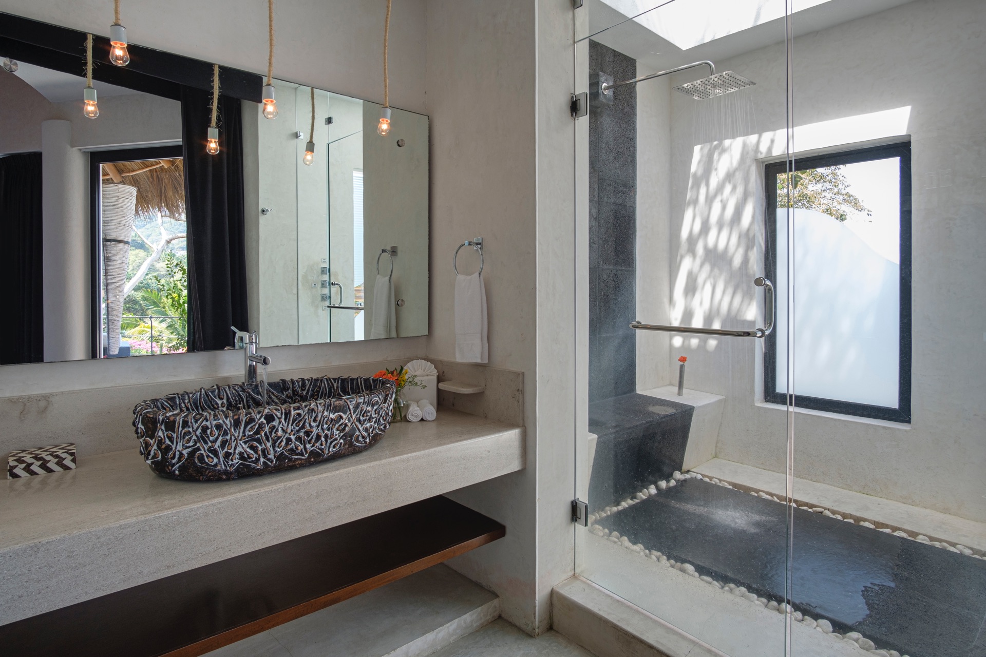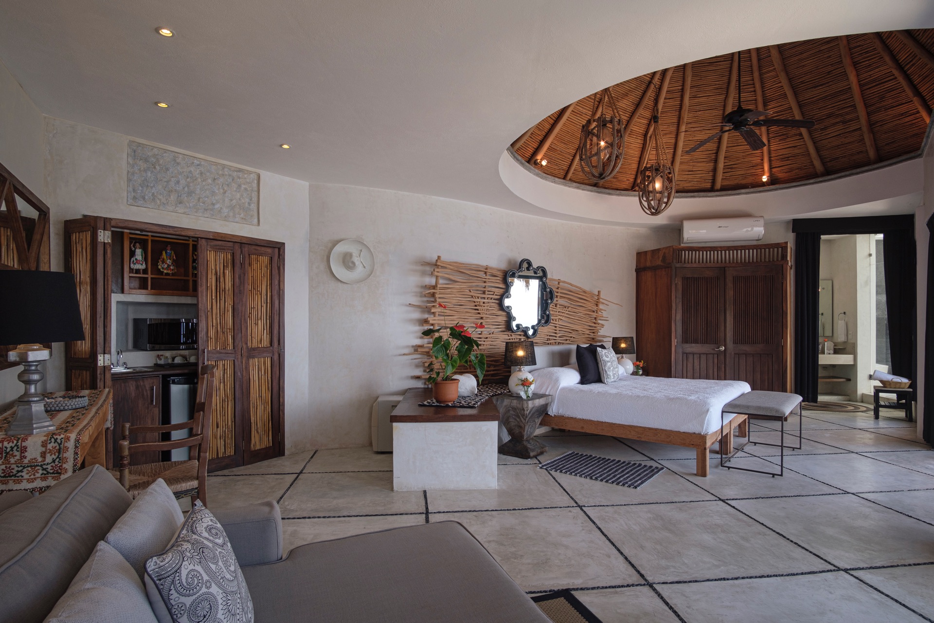 King-size bed, en-suite bathroom with indoor and outdoor shower, living area, terrace.