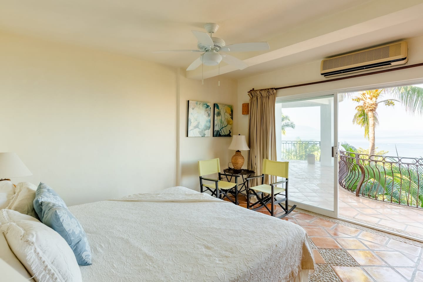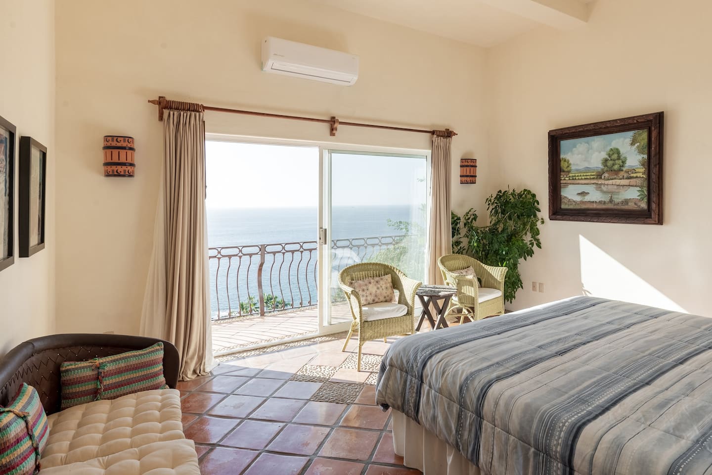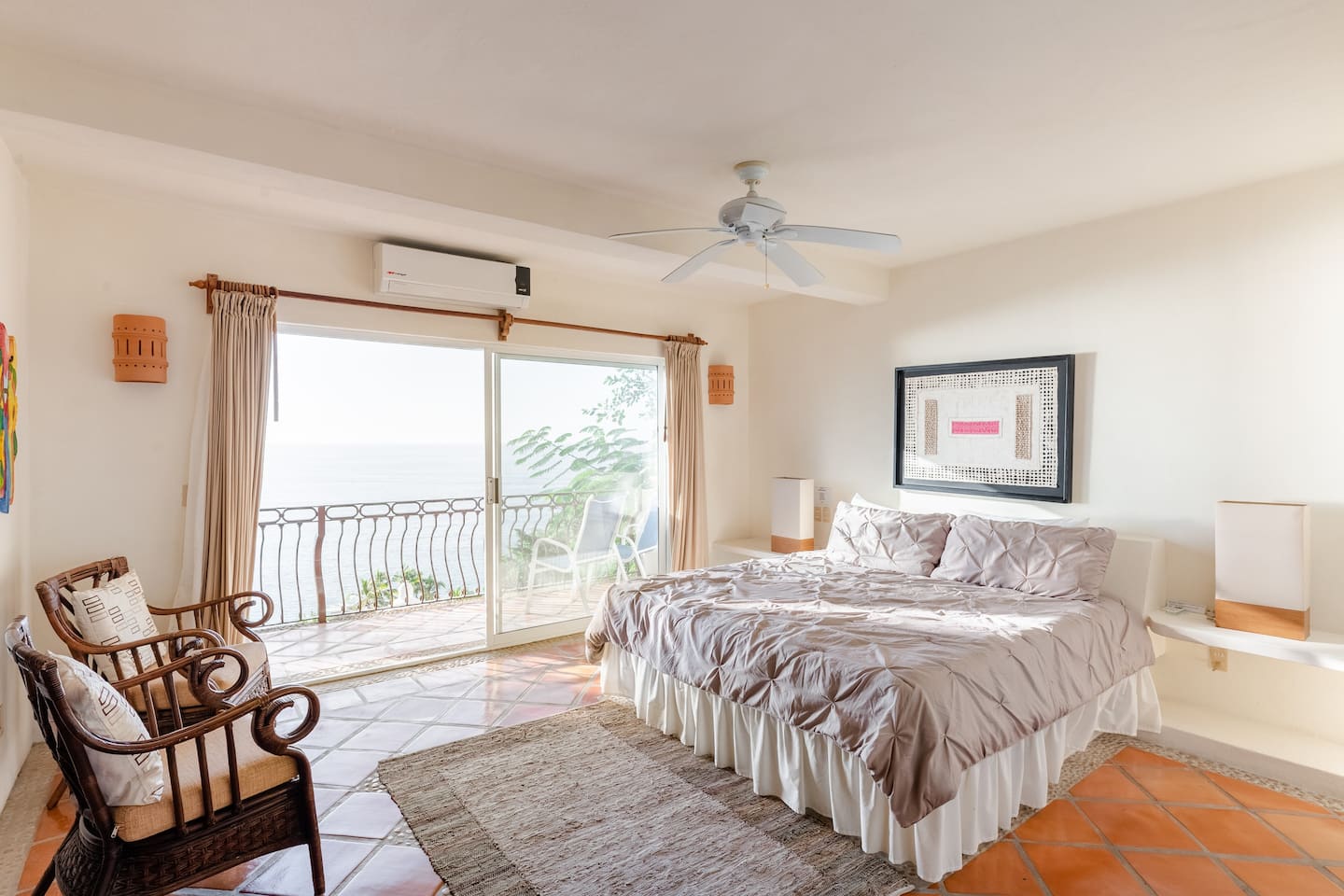 It features a king-sized bed, A/C, and an en-suite bathroom, offering stunning ocean views.