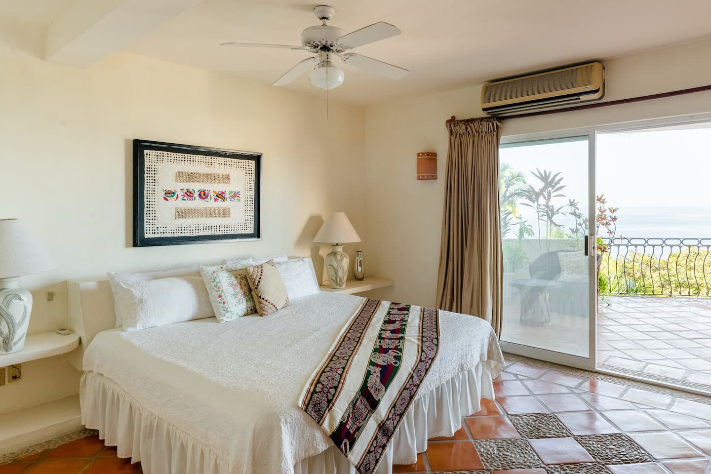 Another room with a king-sized bed, A/C, en-suite bathroom, and ocean view.