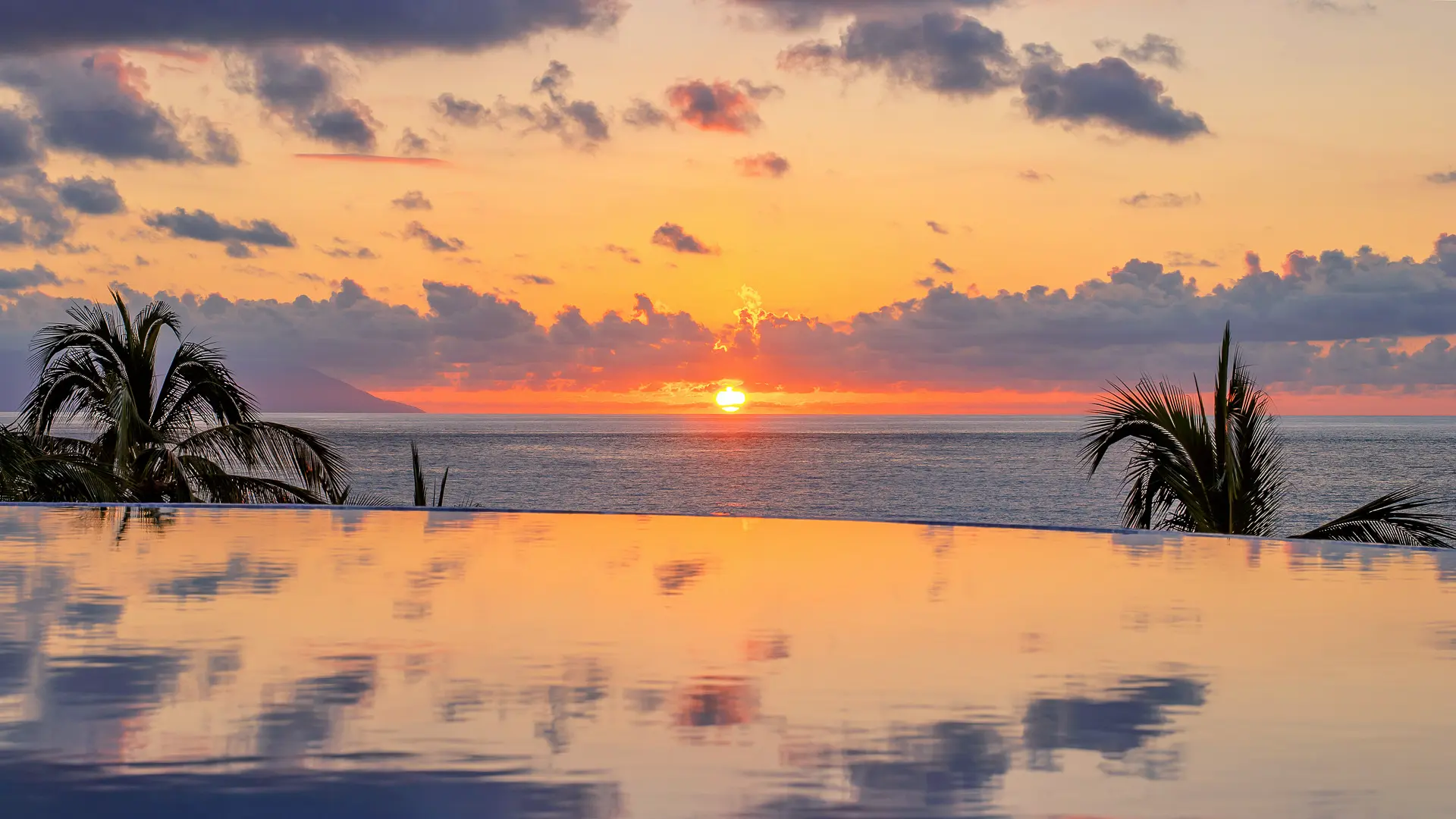 A stunning infinity pool, seemingly blending into the ocean, anchors the villa’s outdoor space and enhances its tranquil ambiance.