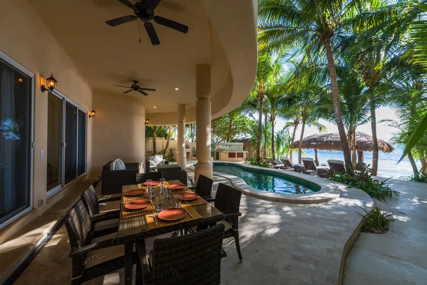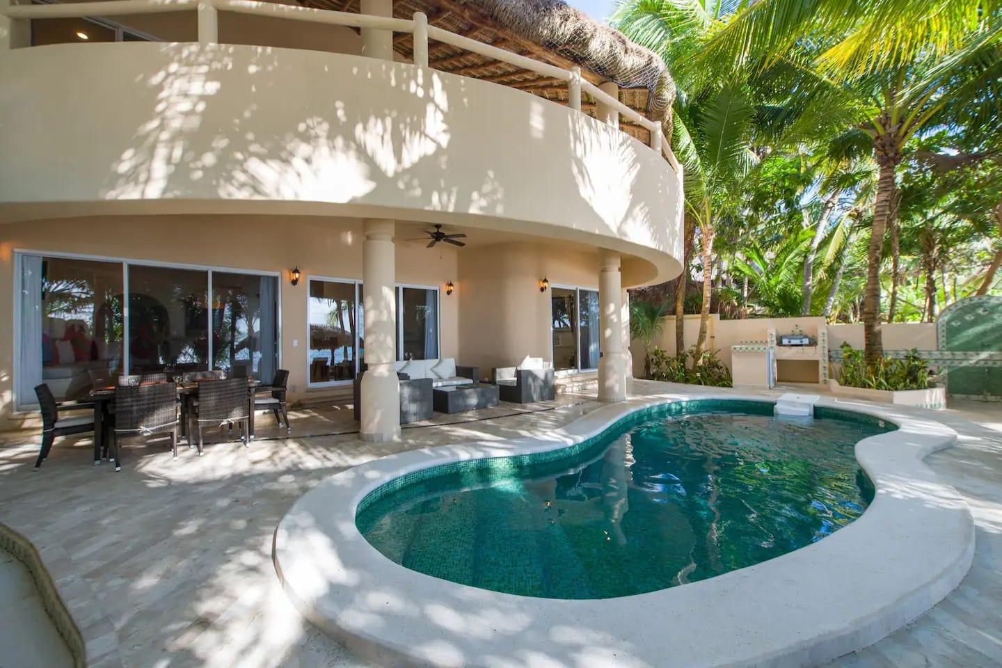 Days tend to unfold between the shaded pool patio, the beach, and the airy interiors. The outdoor dining area lends itself to unhurried breakfasts and quiet early mornings, while the built-in grill encourages casual cookouts that carry from afternoon into evening. Sun loungers, a beach palapa, and direct access to the calm waters of Soliman Bay support a simple, beach-centered lifestyle, whether guests prefer to be in the water, by the pool, or relaxing with a drink and the sea breeze.