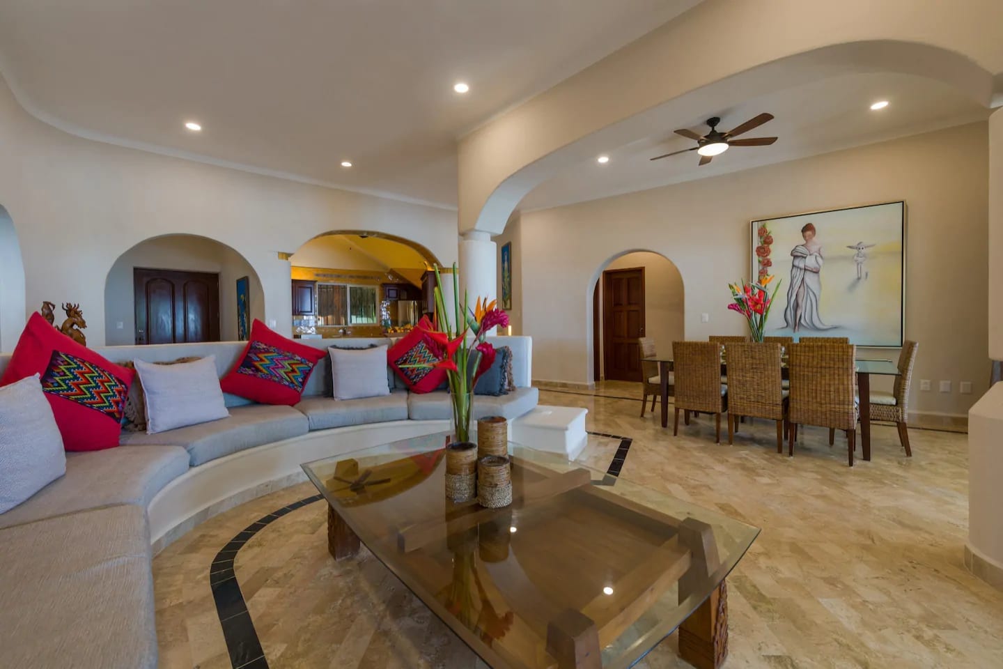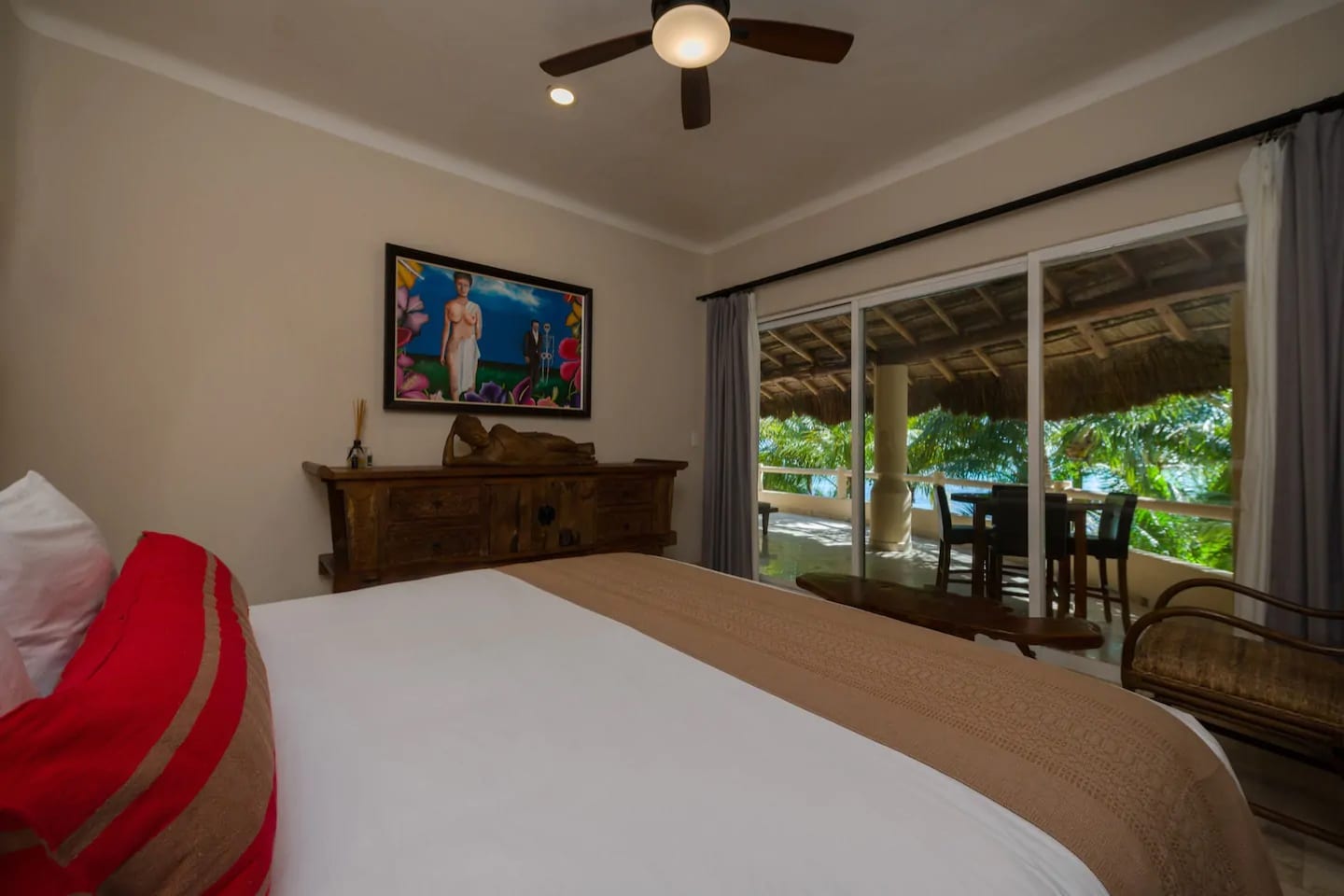 Inside, an open-plan layout brings together a cozy living area, a formal dining room, and a fully equipped kitchen into one sociable space. Large glass sliders extend this central hub toward the pool terrace and beach, allowing the house to feel spacious yet cohesive. With five bedrooms arranged across multiple levels, including a rooftop suite, the villa comfortably accommodates families or small groups who appreciate both togetherness and the option of retreating to more private corners.