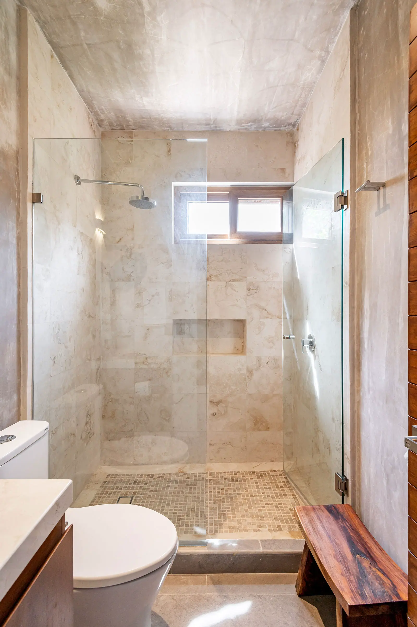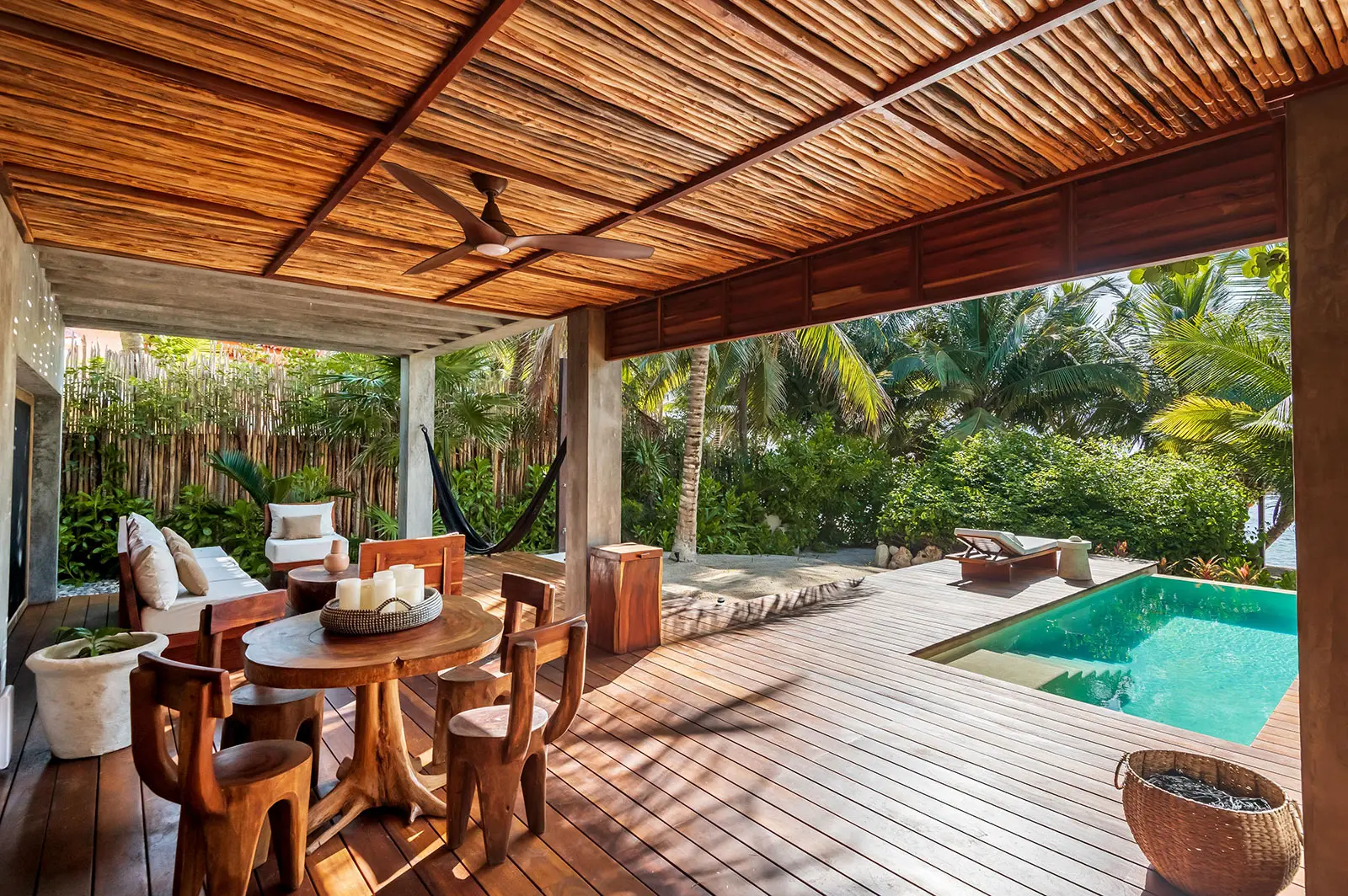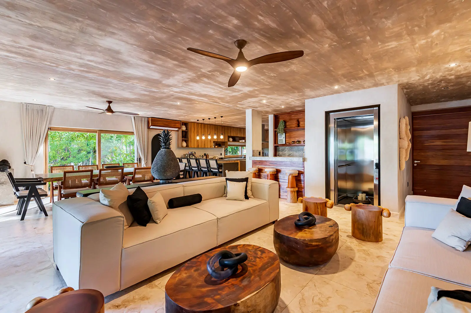Designed for larger parties, the property accommodates up to 20 guests in nine expansive bedrooms, offering generous proportions and a thoughtful distribution of space. The interiors are anchored in chukum style, where smooth grey cement surfaces are softened by locally sourced wooden accents. This combination creates a cohesive aesthetic that runs throughout the villa, giving each area a contemporary yet grounded feel suited to extended stays with family or friends.