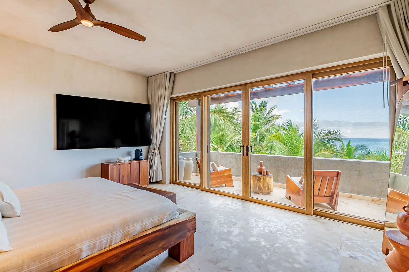 King size bed, 2 Bathrobes, Air conditioning, Bose speaker, Ceiling fan, Closet, Dual vanity, Ensuite bathroom with shower, Hairdryer, Large shared terrace with ocean view, Ocean view, Organic toiletries, Safety box, Sofa, TV, Wifi access, Window screen