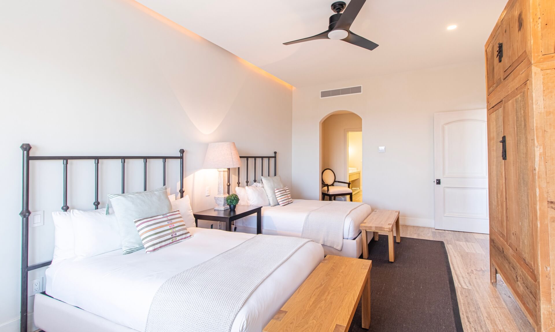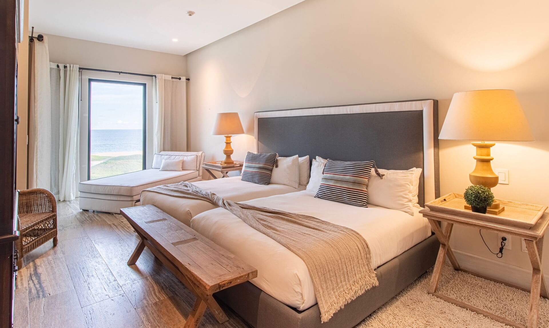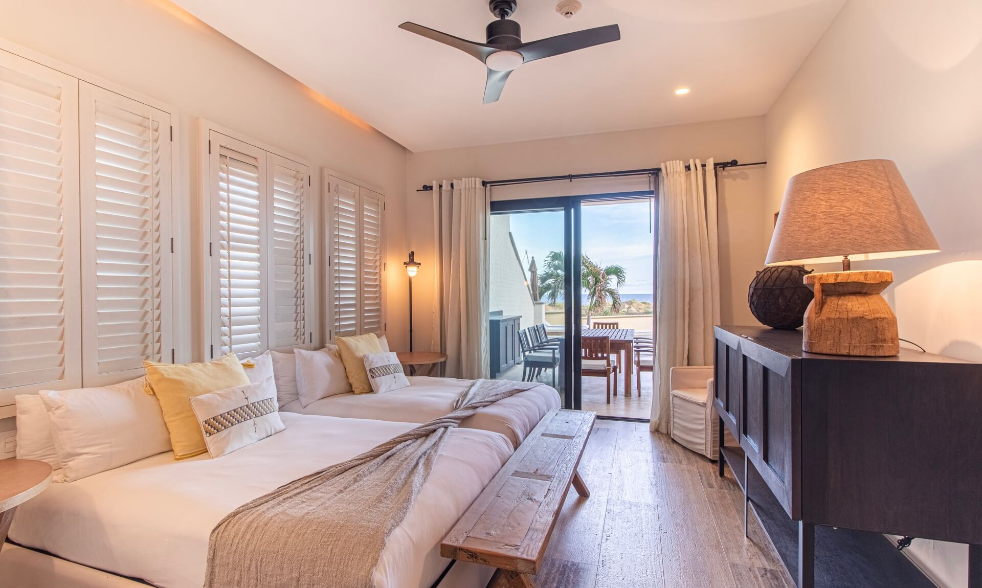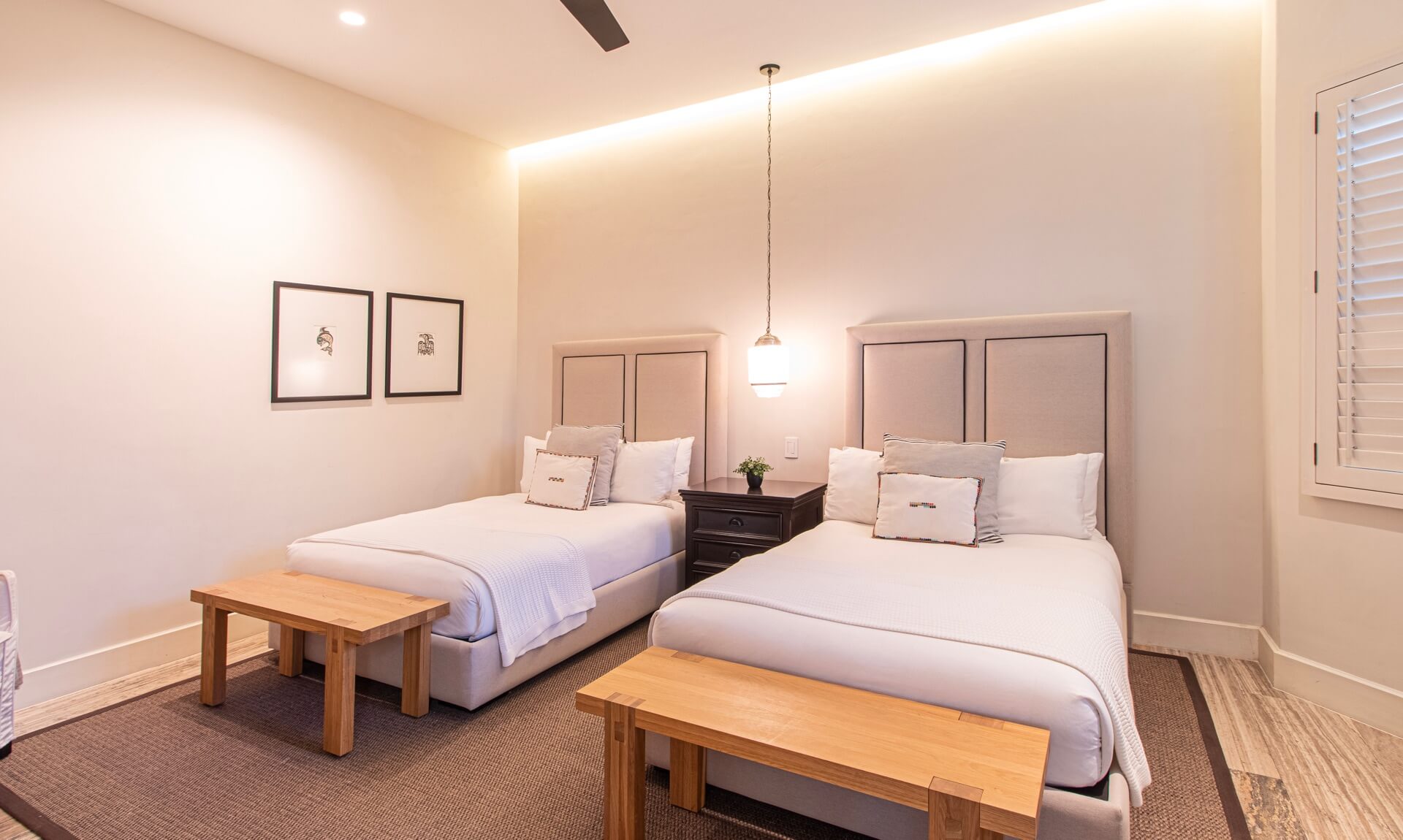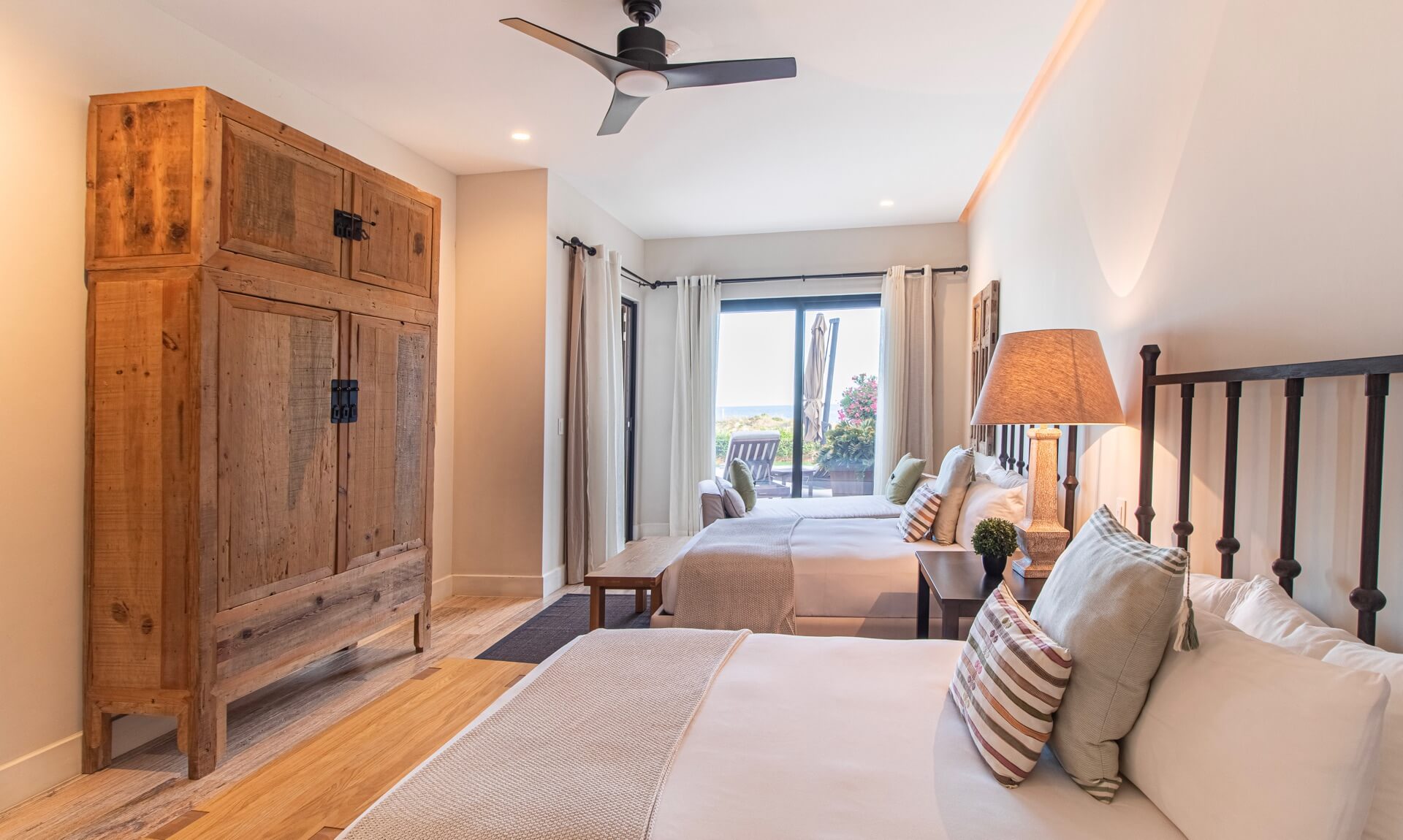 The Second Suite includes two double beds, a private bathroom, pool access, and beautiful ocean views.