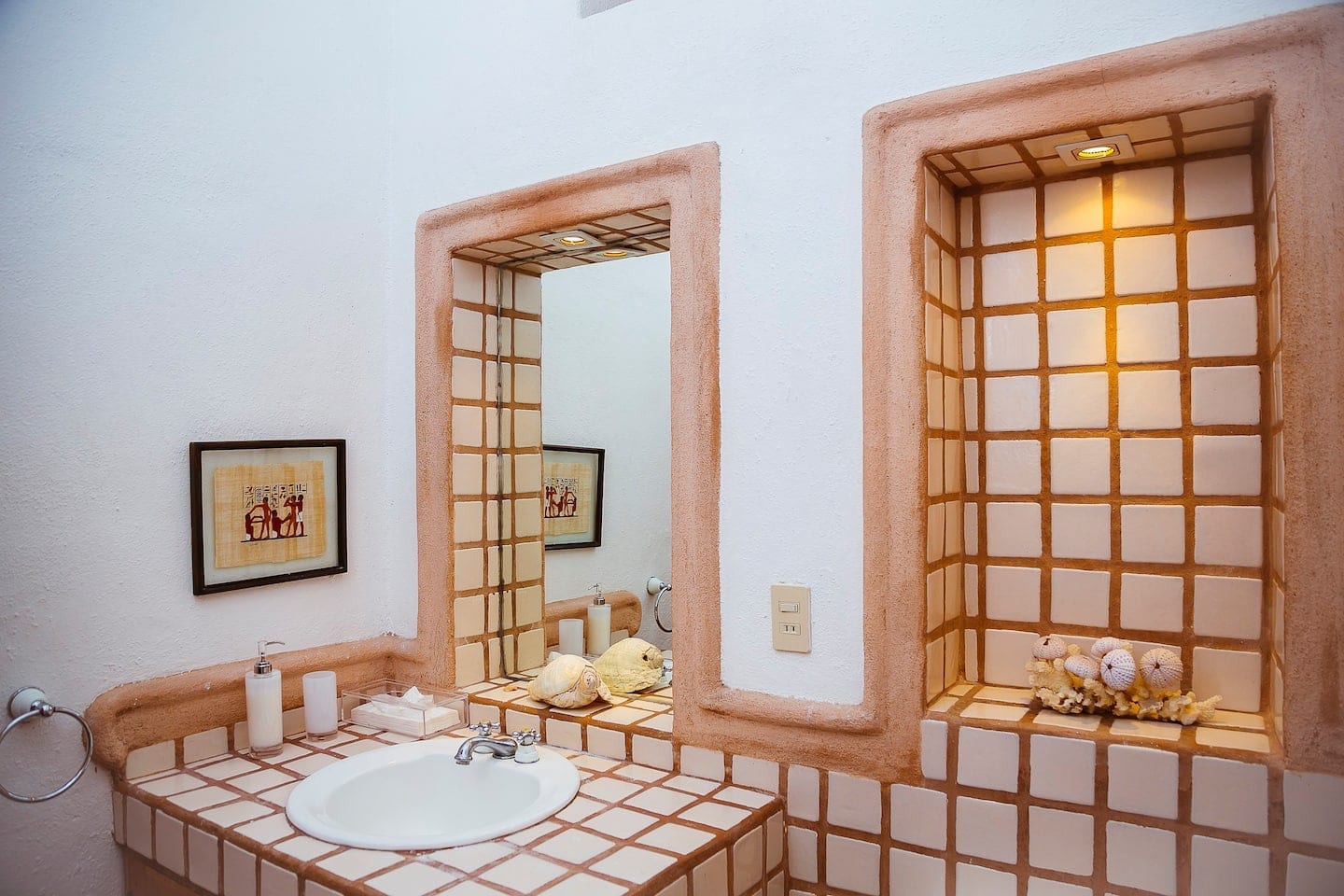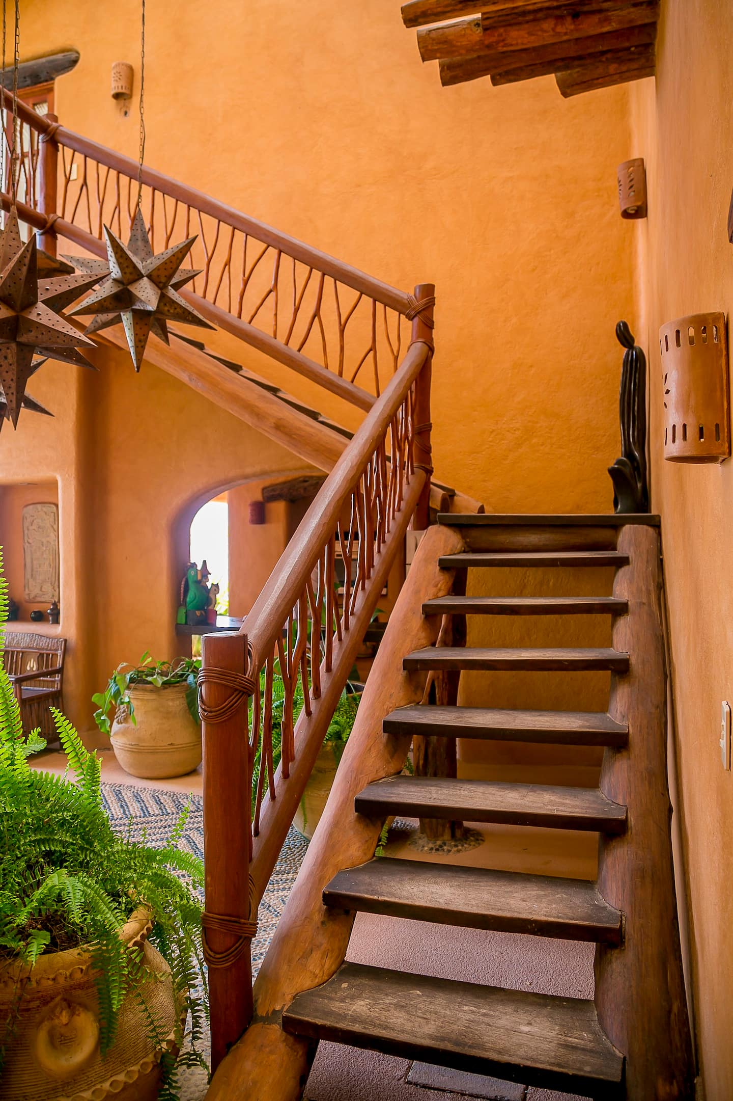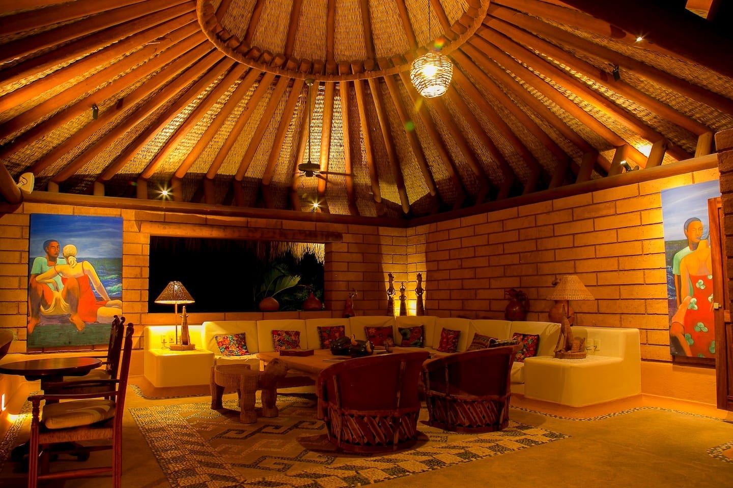 Luxuriate in a living room where rustic Mexican architecture converges with modern comforts, providing an optimal space for relaxation and entertainment.