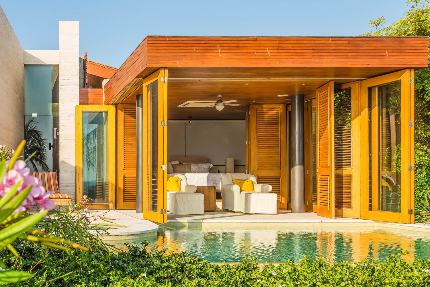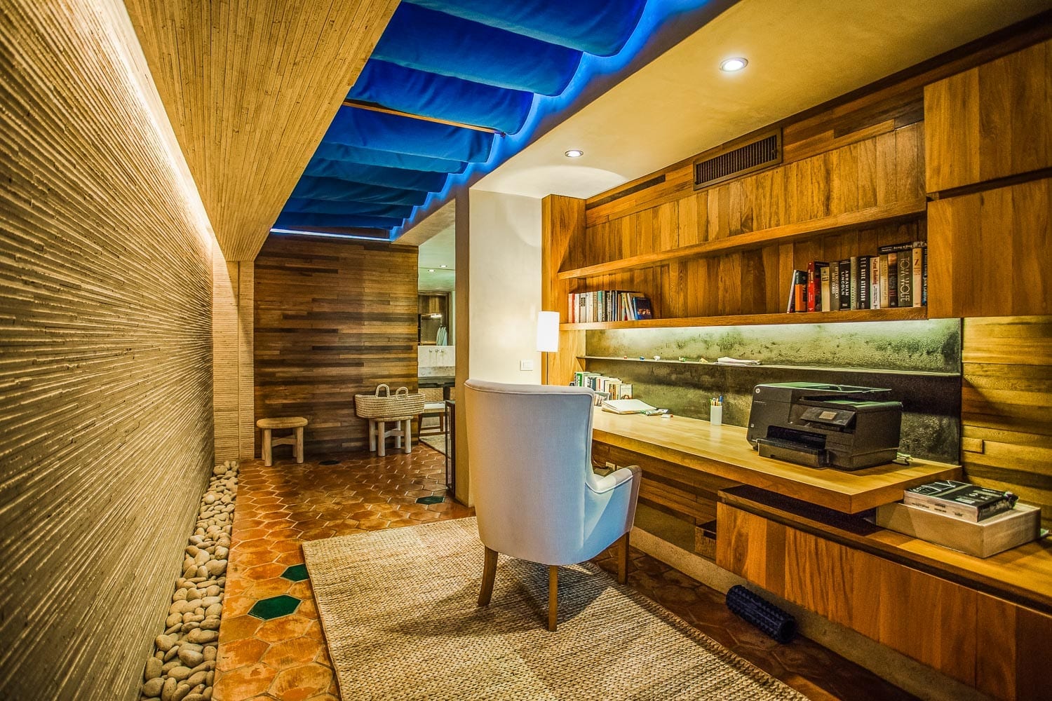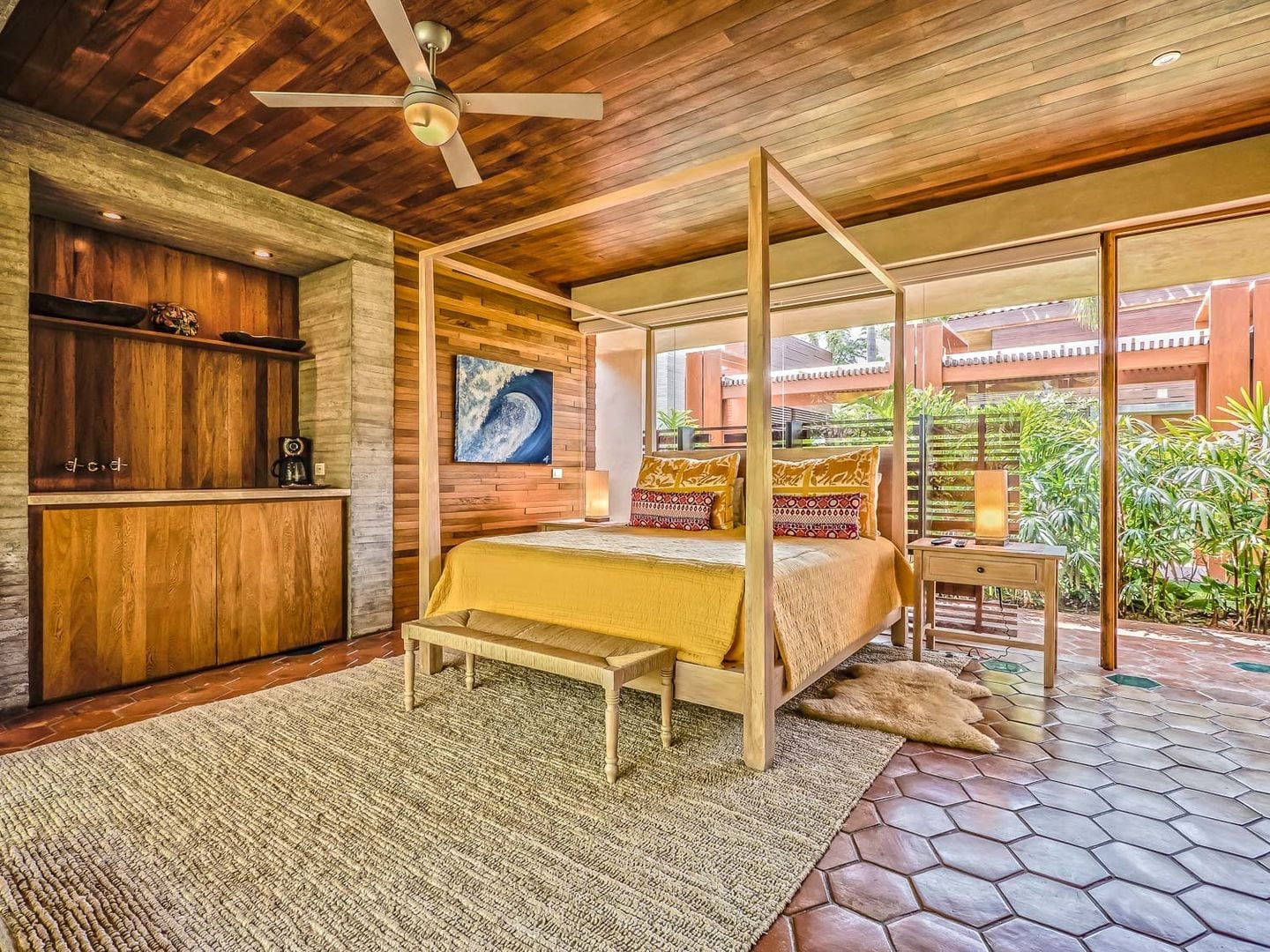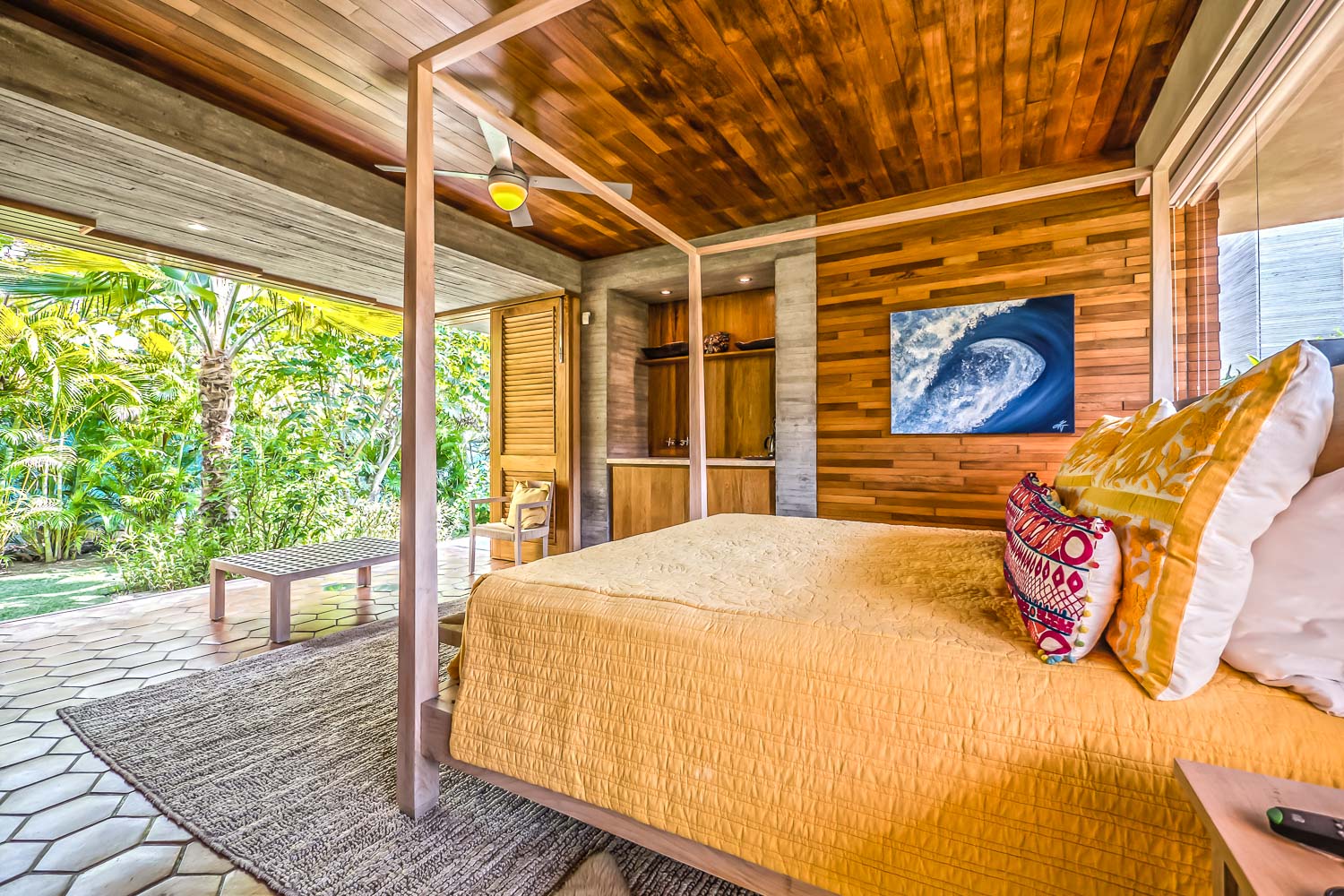 The villa doesn’t stop impressing there. Find your peaceful corner in one of the garden’s secret nooks. For those who work on the go, two office areas await. Feel like a refreshing drink? Head to the wet bar. Fitness enthusiasts will appreciate the top-tier exercise room. And to ensure your stay is as smooth as possible, we’ve got air conditioning, Wi-Fi, a six-seater golf cart, and more. A private chef crafts delectable meals daily while housekeeping keeps the villa pristine. Round-the-clock security gives you peace of mind.
