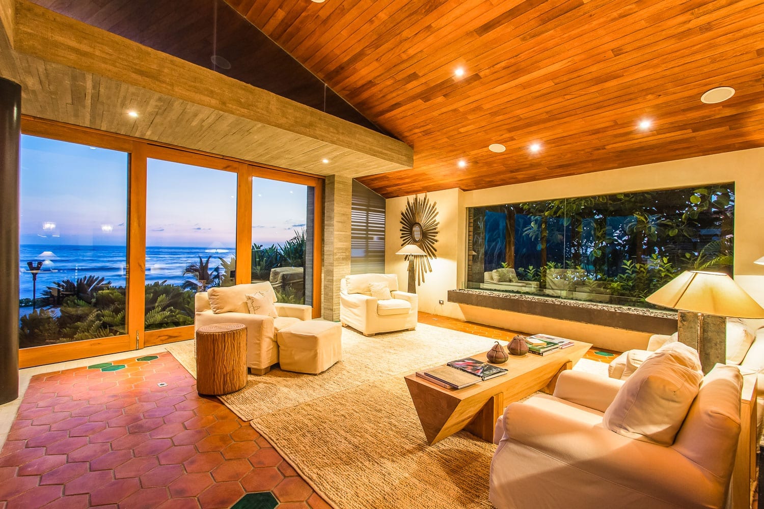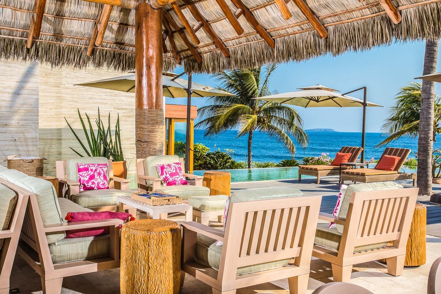 Adjacent to the kitchen, the spacious living and dining areas beckon. Picture this: sitting elegantly with ocean vistas, sharing stories, and making memories. Slide open the glass doors, and you’re on the expansive terrace. Sheltered under a thatched palapa, this outdoor haven boasts plush sofas. And just a few steps away? An alfresco dining space, an infinity pool, and endless ocean horizons.