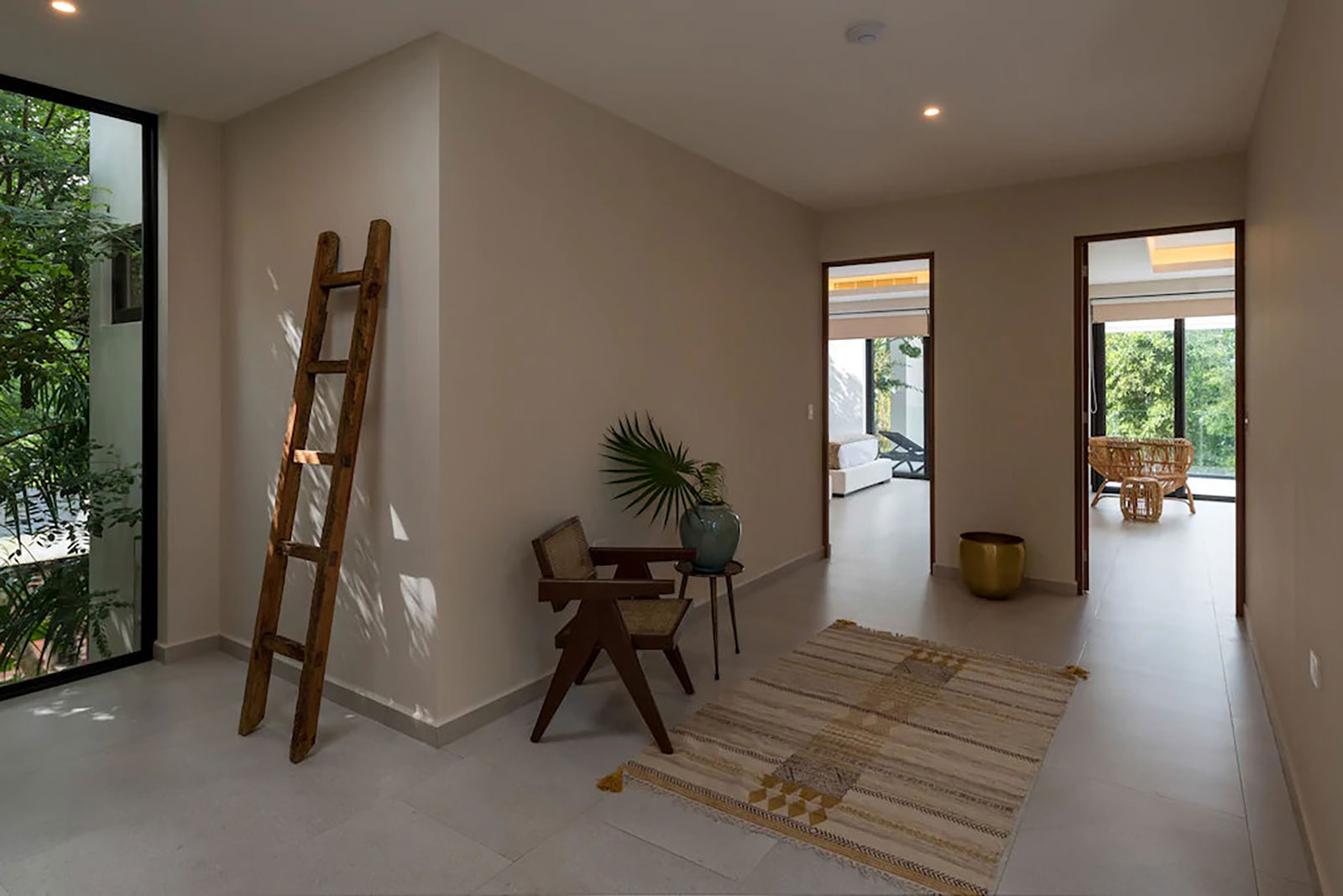 With two queen-size beds and a private balcony overlooking the villa’s lush gardens, this suite provides a tranquil retreat for guests. The en-suite bathroom features a walk-in shower and luxury toiletries, ensuring ultimate comfort.