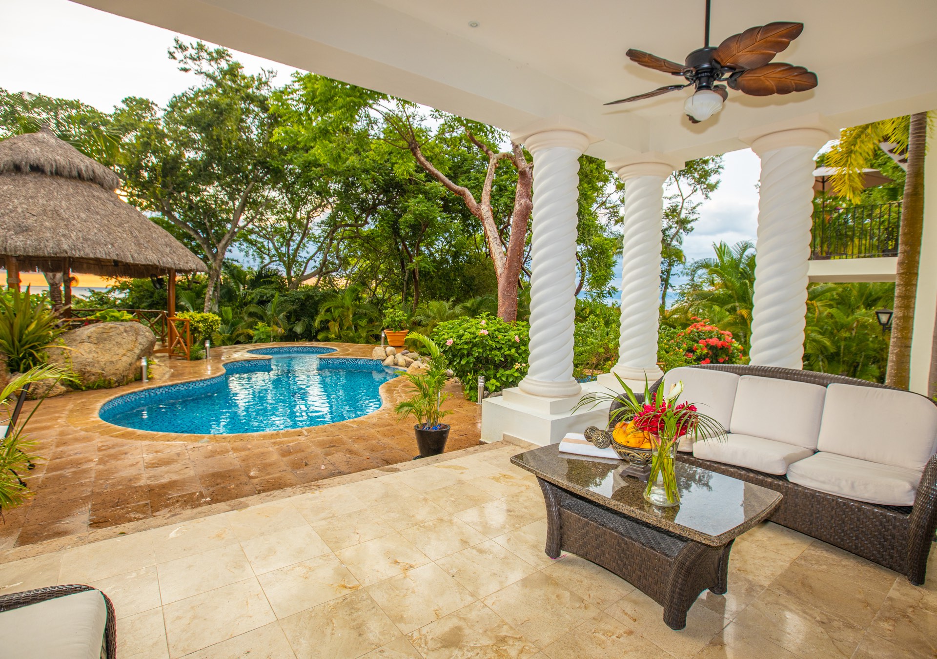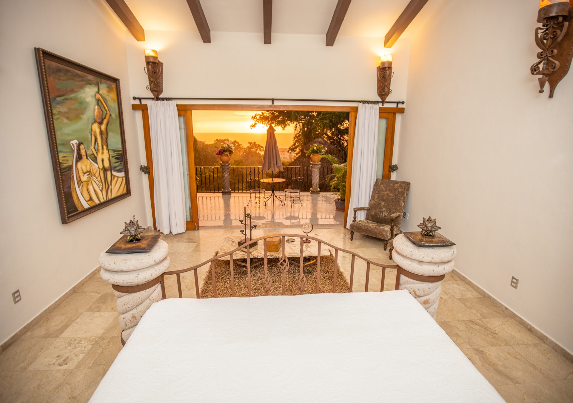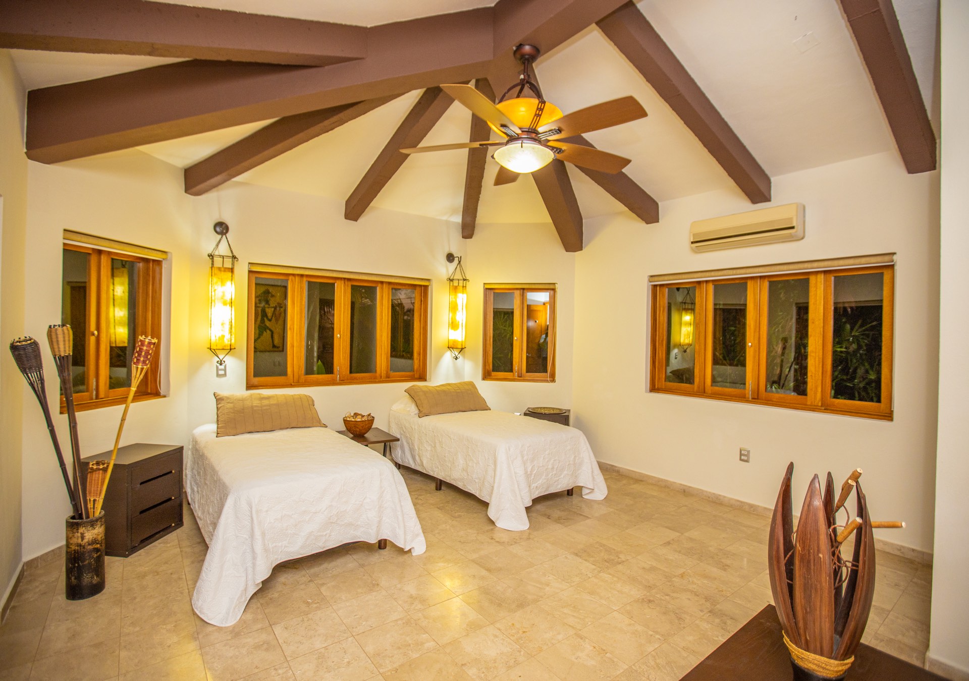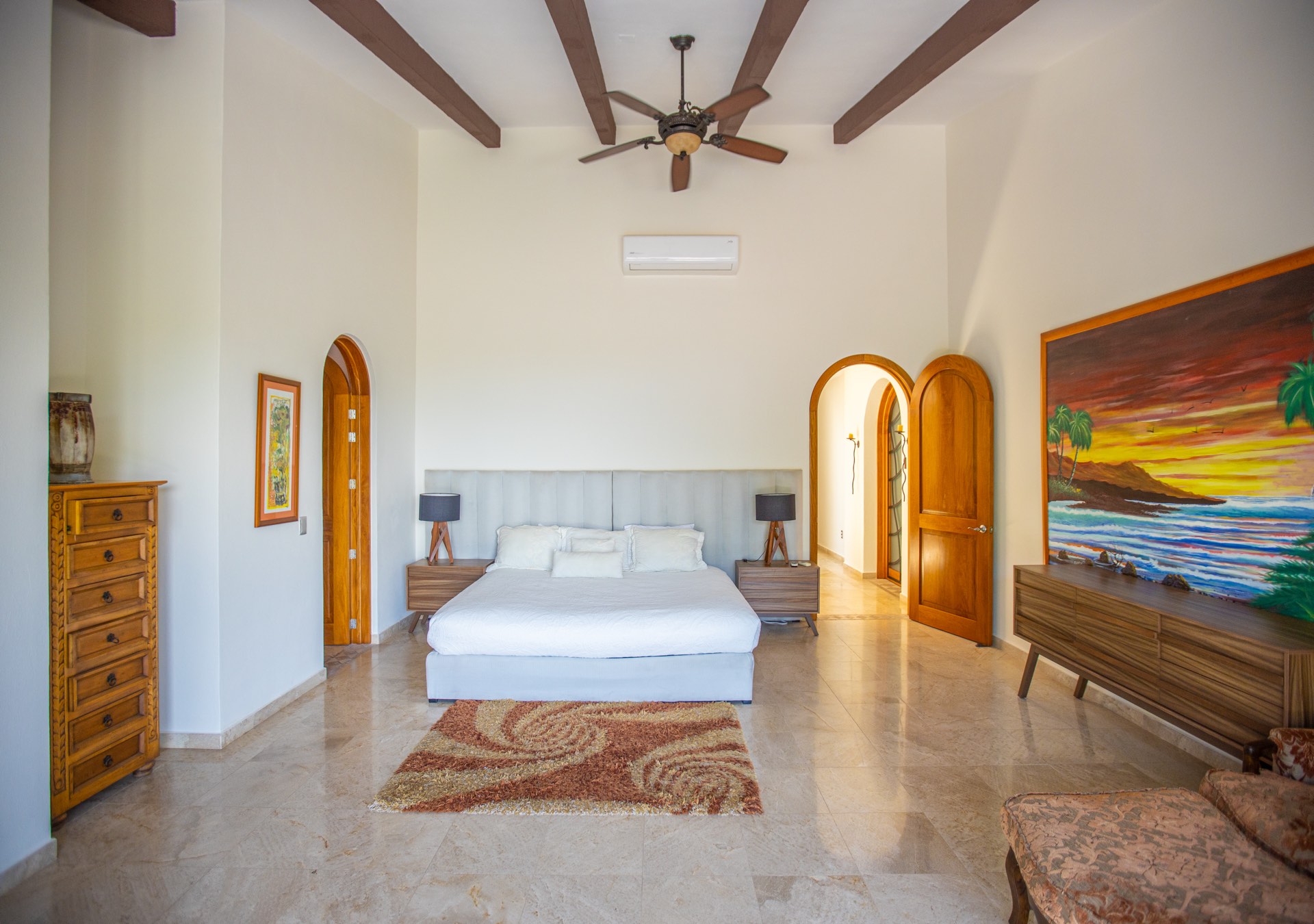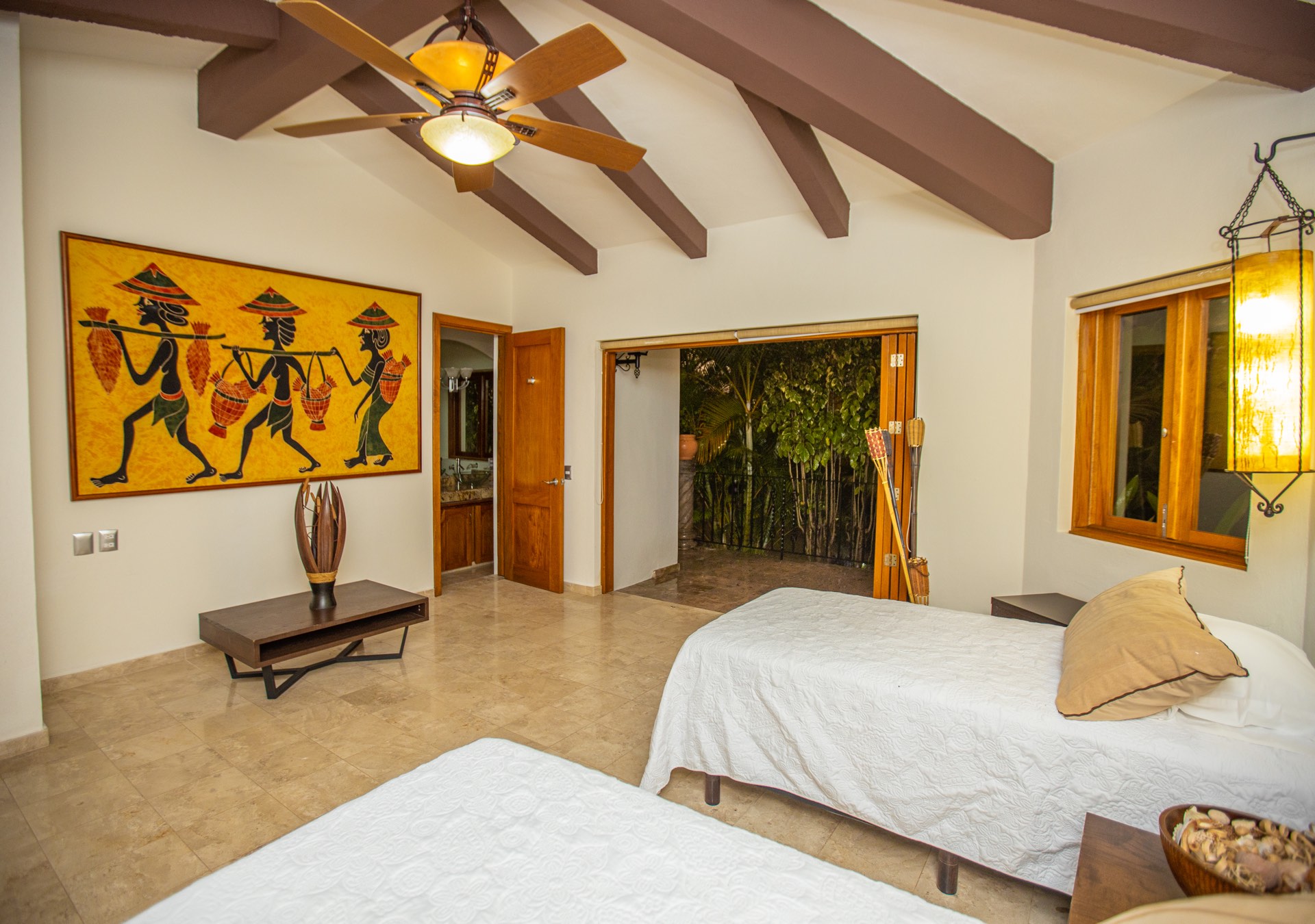The upper-level houses five bedrooms, each featuring vaulted ceilings. Two of these rooms, fitted with king-sized beds, share a terrace that offers sweeping ocean views. A uniquely designed suite showcases a queen bed and a private balcony with a swing bench. Additionally, two suites provide serene views of the mountains, one with a queen bed and the other with a king bed.