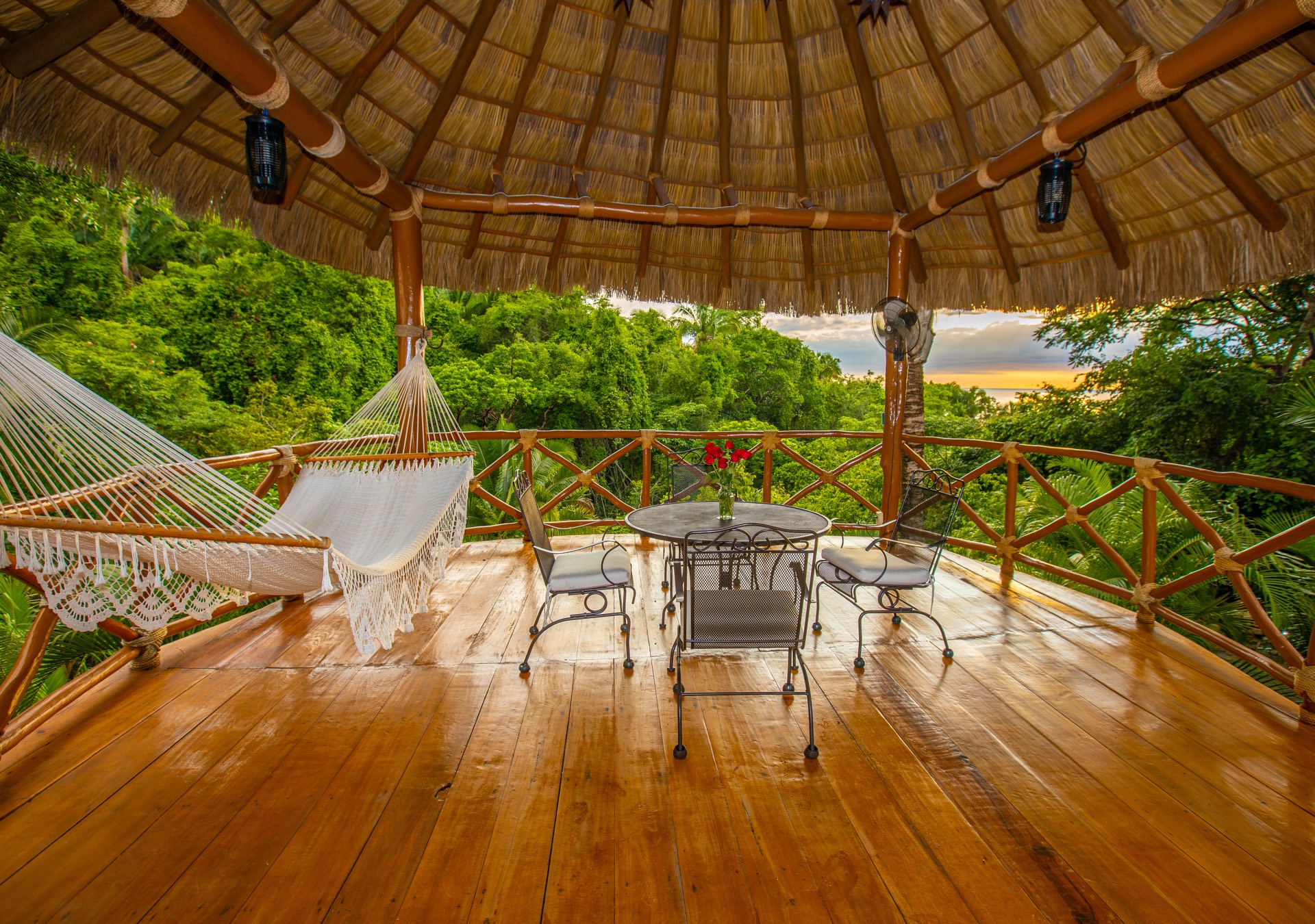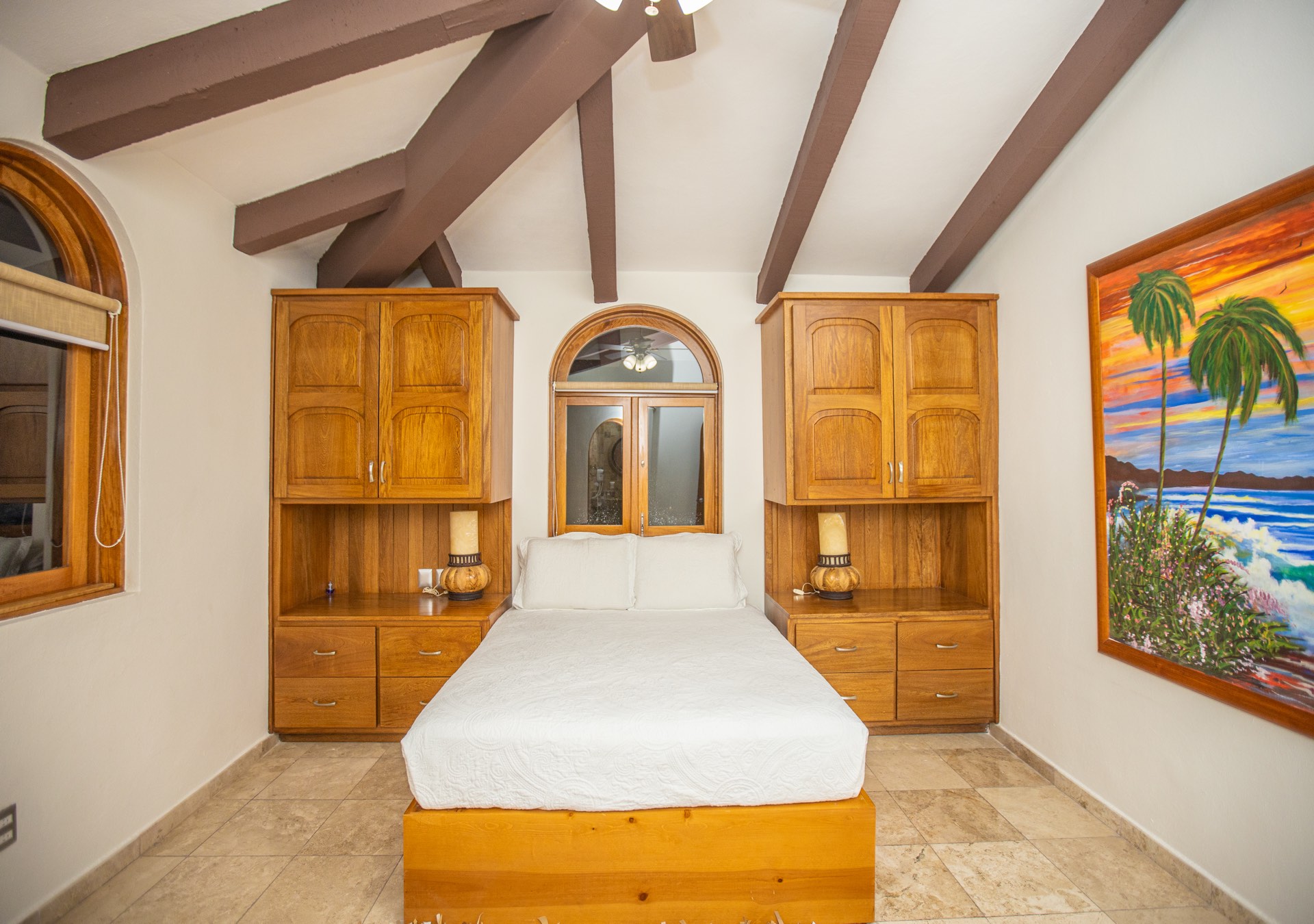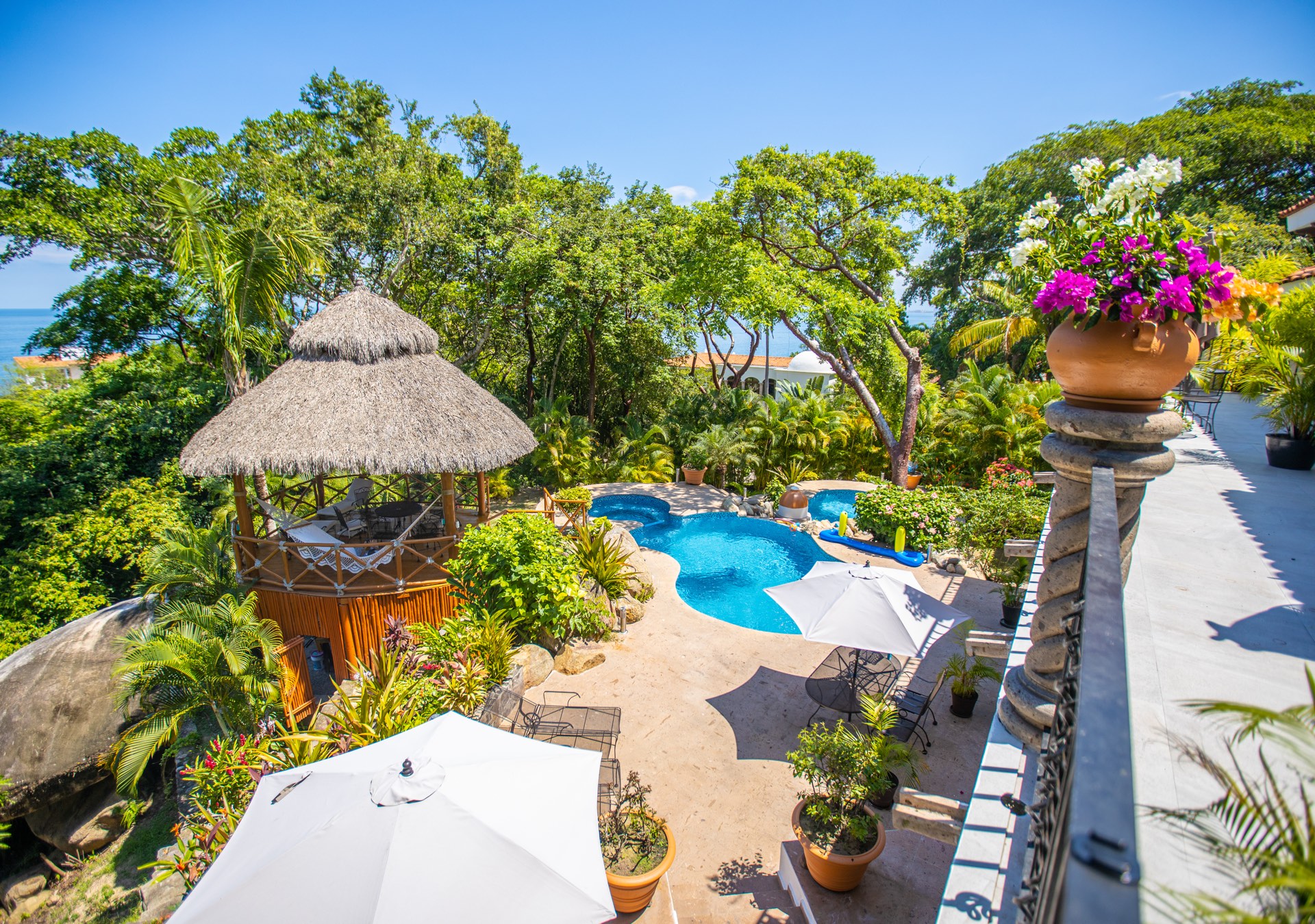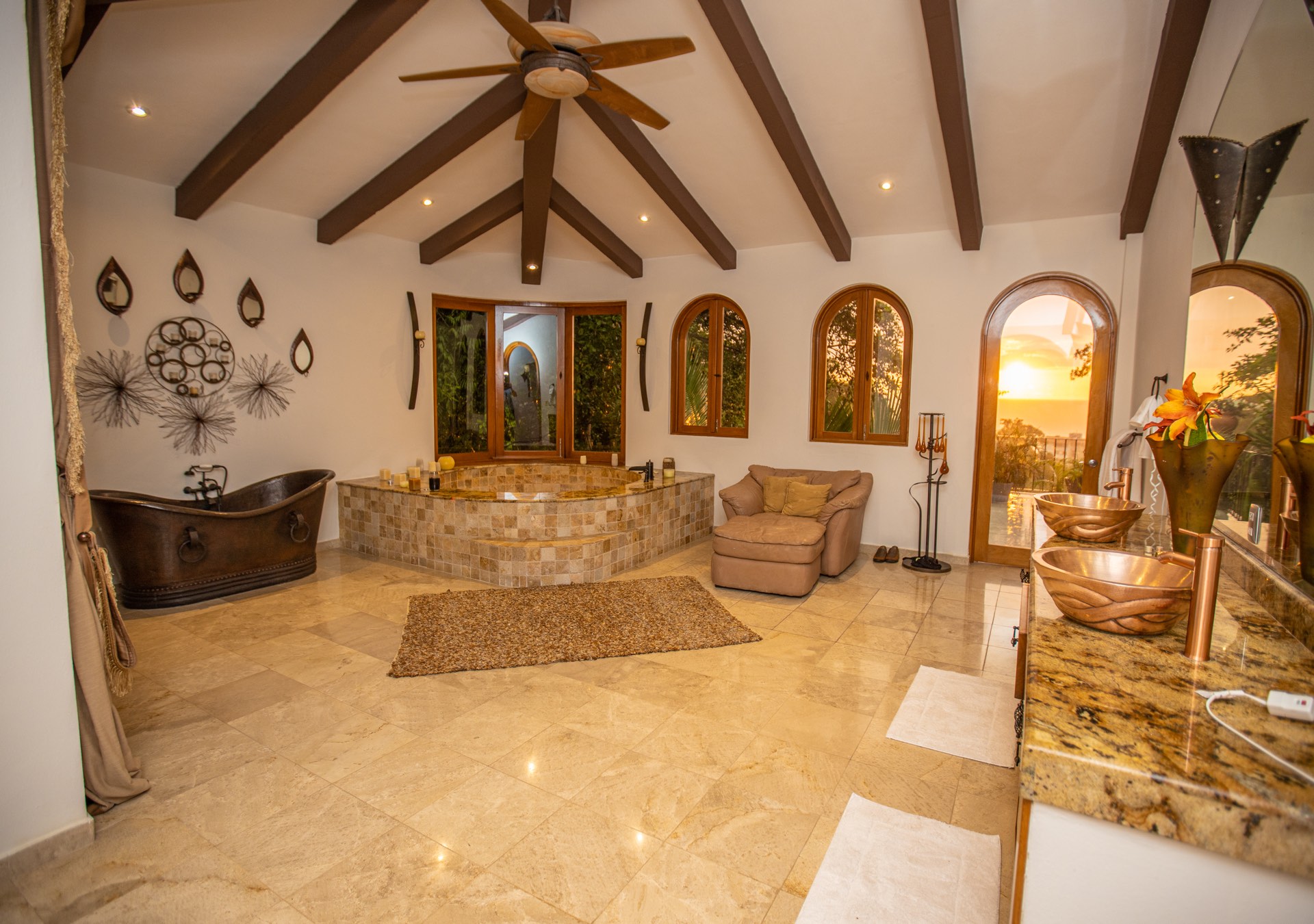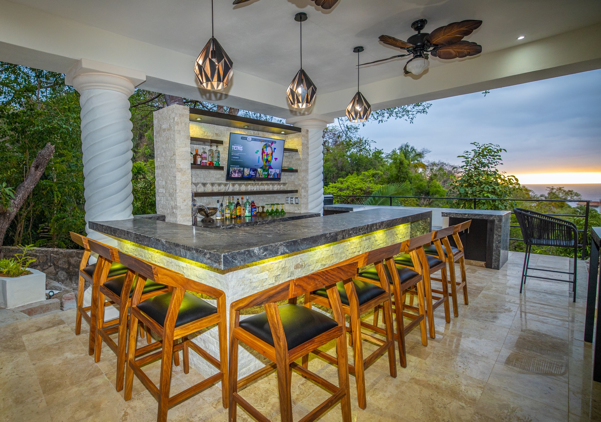 The upper-level houses five bedrooms, each featuring vaulted ceilings. Two of these rooms, fitted with king-sized beds, share a terrace that offers sweeping ocean views. A uniquely designed suite showcases a queen bed and a private balcony with a swing bench. Additionally, two suites provide serene views of the mountains, one with a queen bed and the other with a king bed.