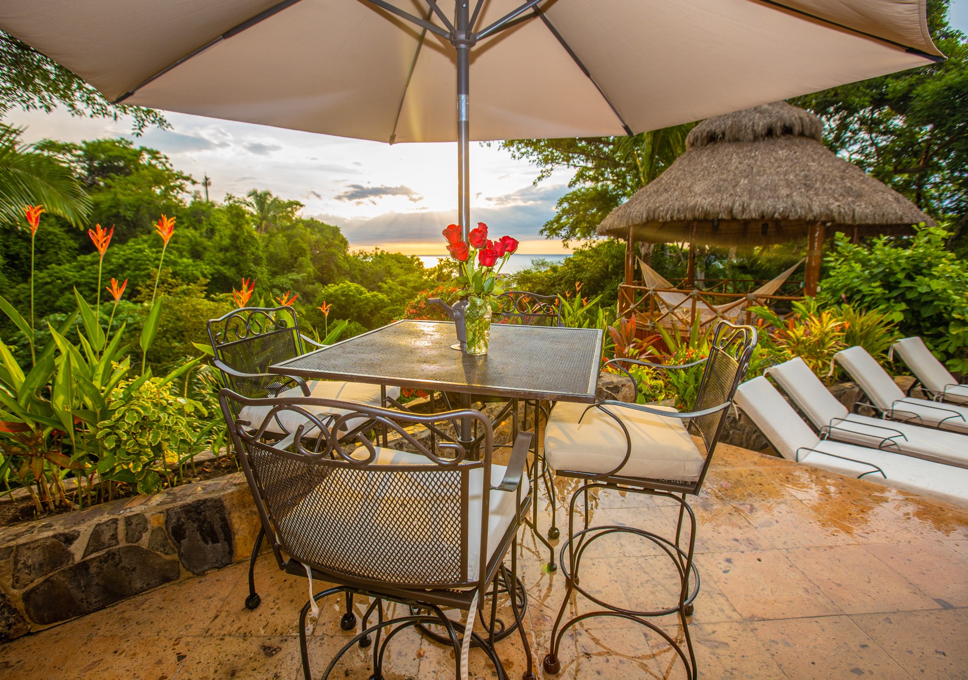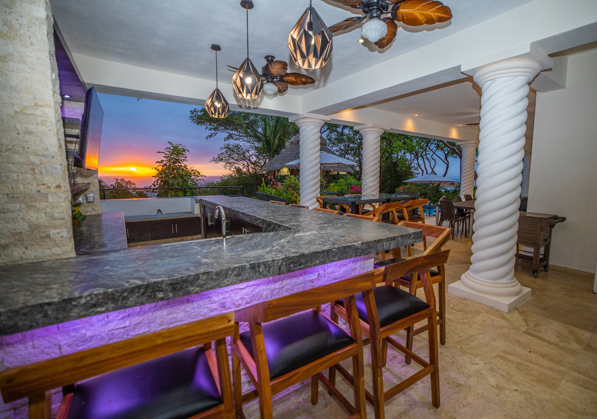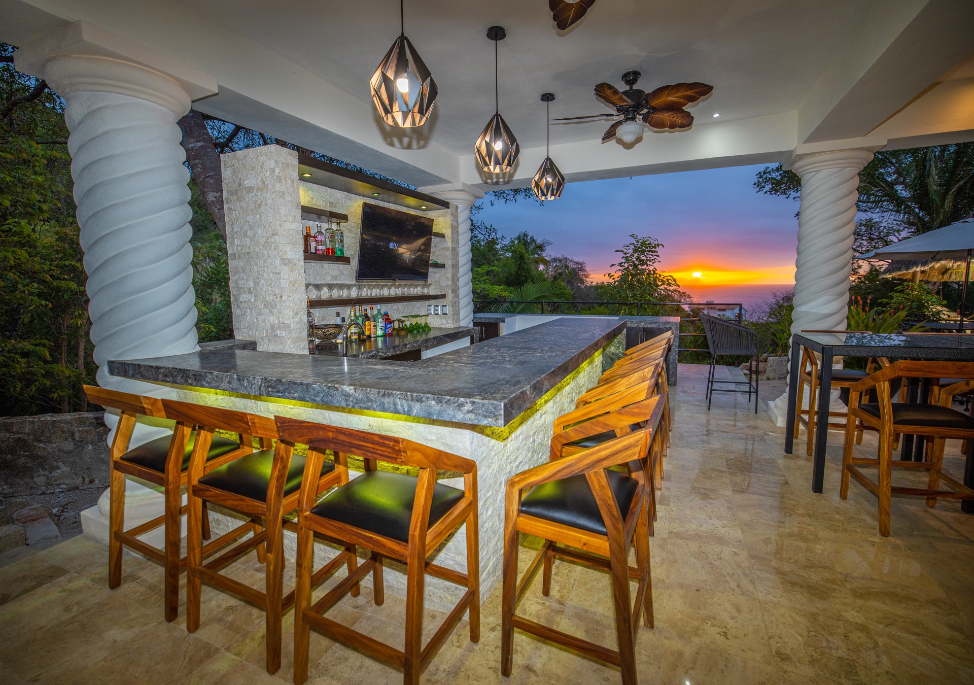 Ocean vistas have been magnified by trimming the encompassing vegetation. An elegant outdoor bar has been introduced on the covered terrace. Contemporary furniture pieces have refurbished living, dining, and bedroom areas. Cleanliness and freshness emanate from the new white cotton bedding and white Sunbrella pool cushions. The interior now flaunts a fresh coat of white paint, adding to the villa’s airy ambiance. Culinary enthusiasts will appreciate the upgraded kitchen tools and dishware. Furthermore, the pool has been retiled, and lighting in the garden and pool area has been augmented for evening aesthetics.