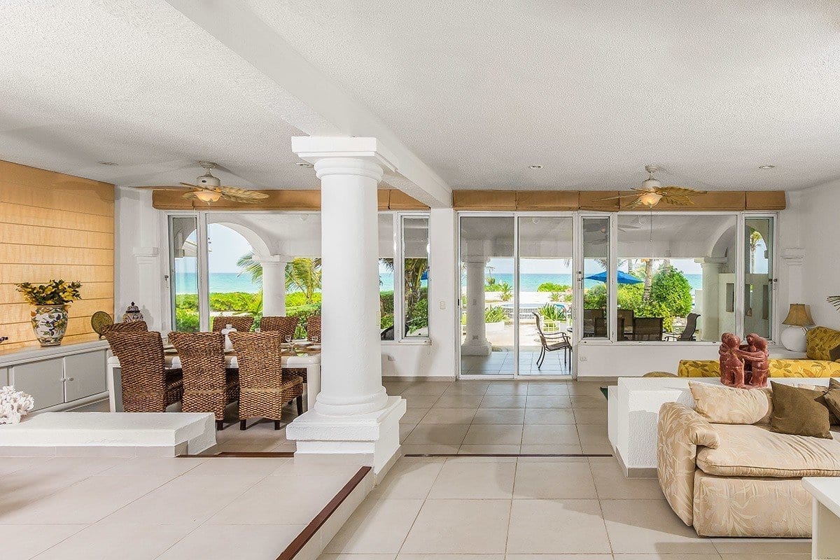 Elegant living and dining areas that seamlessly blend into a terrace, leading to a private pool, Jacuzzi, and direct beach access.