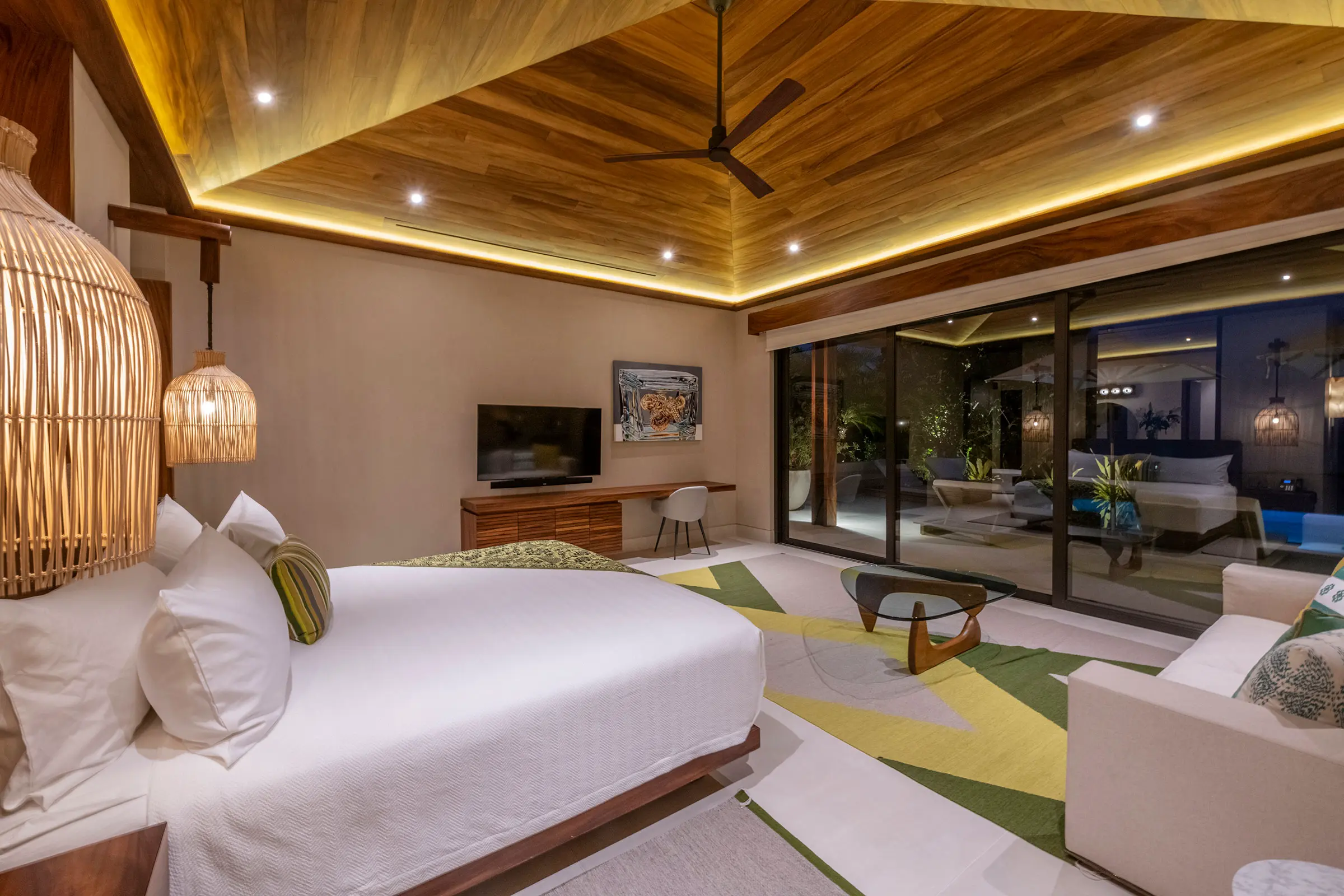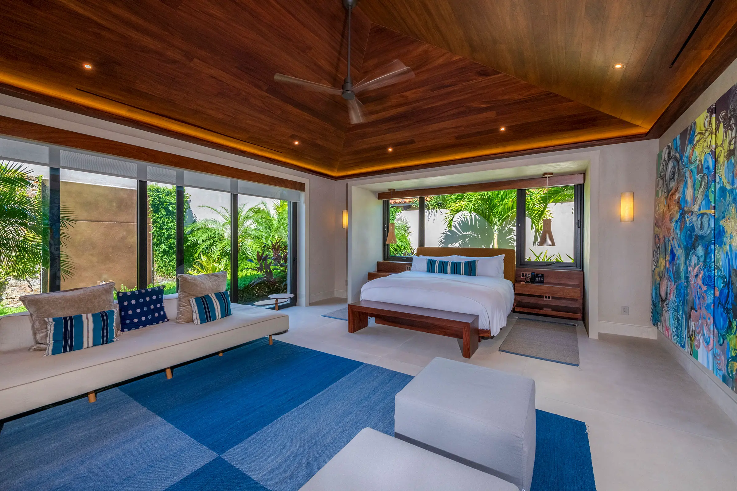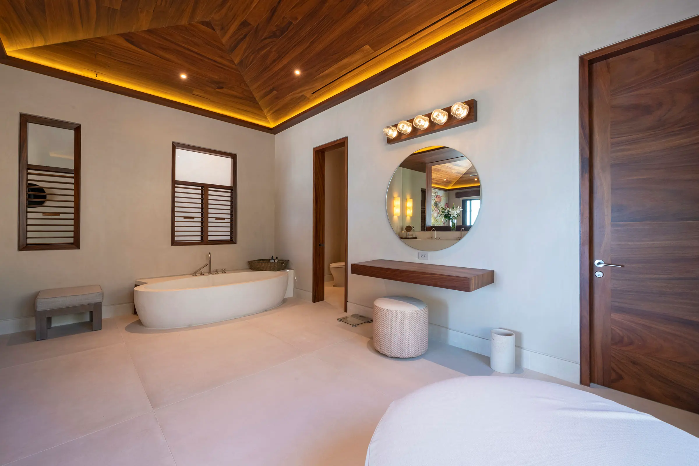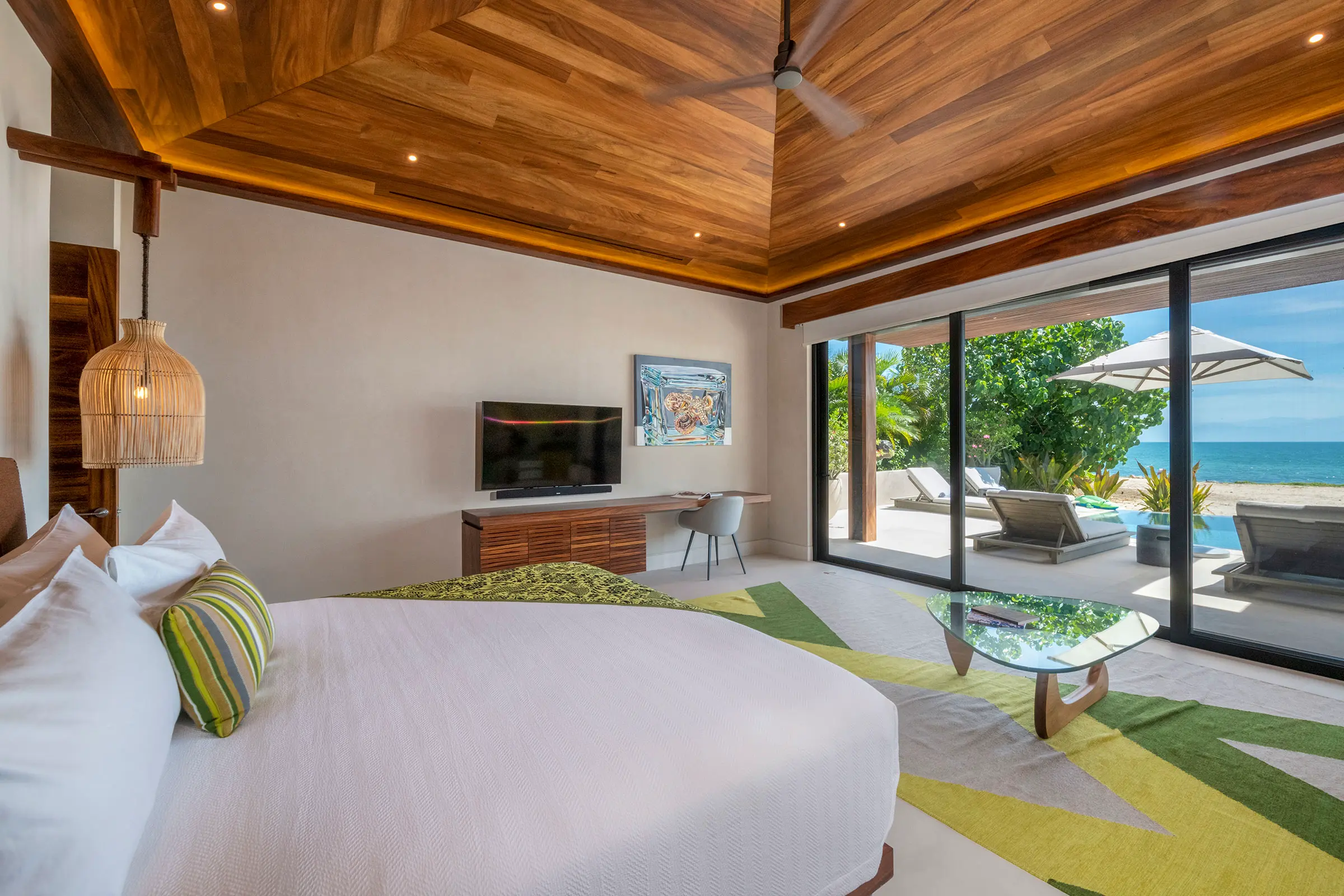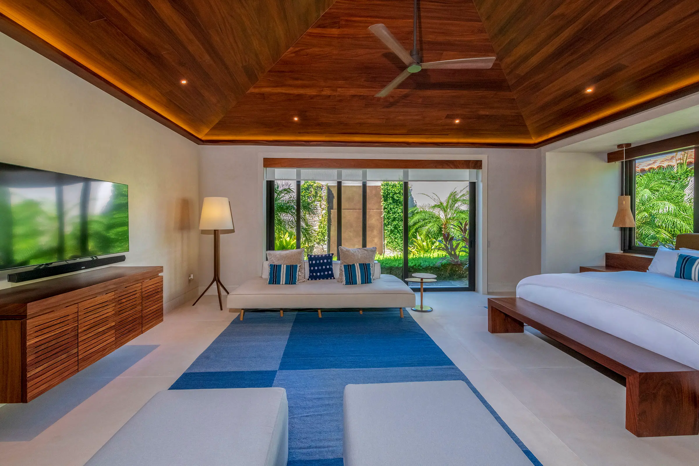 The Master Suite offers a king-size bed, ocean views, and direct access to the pool and terrace. This luxurious suite also includes a small living room area, a Smart TV, and a spa-like en-suite bathroom with a bathtub, double sink, and indoor and outdoor showers. It is a truly serene space, perfect for unwinding after a day at the beach.