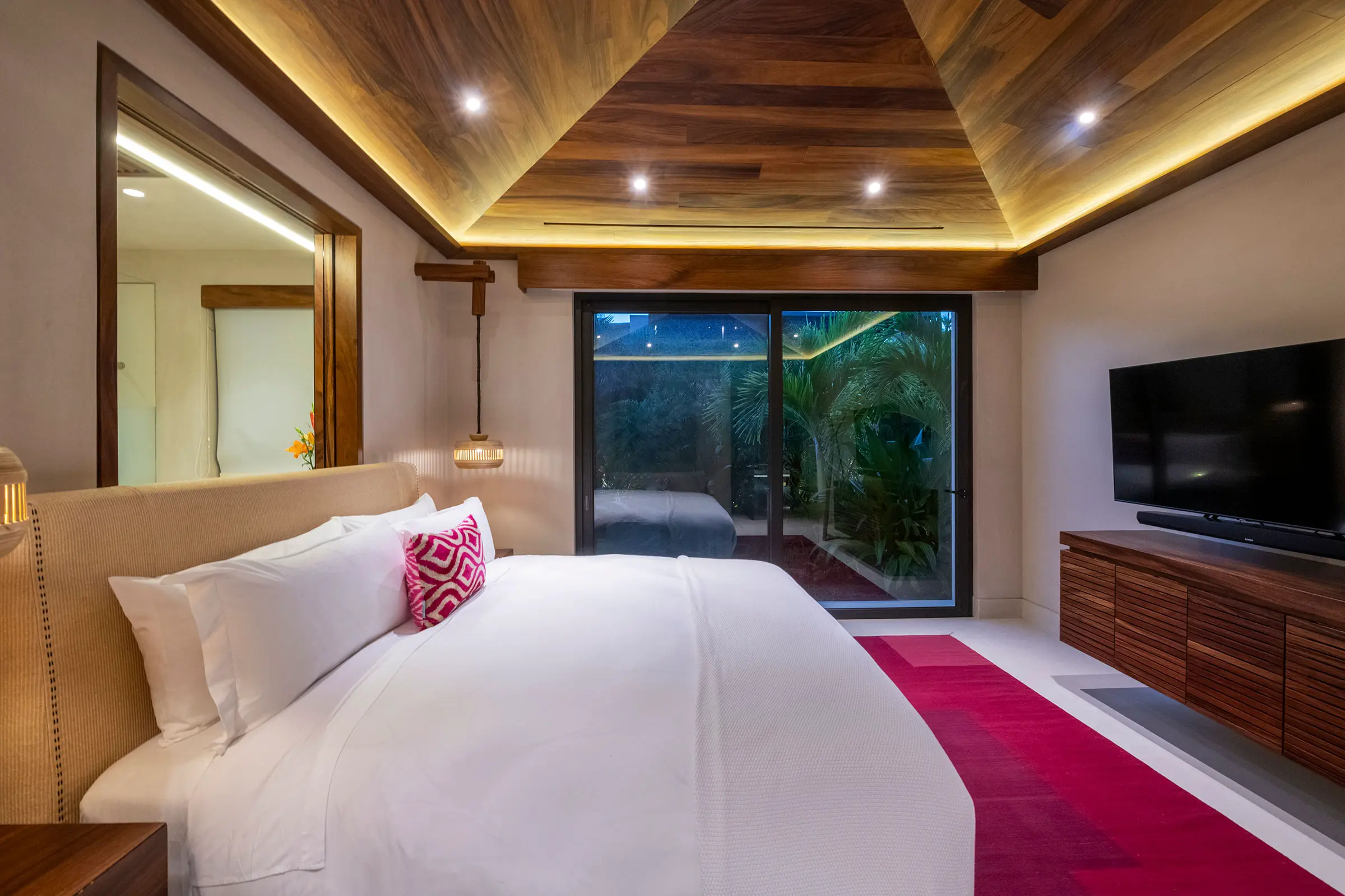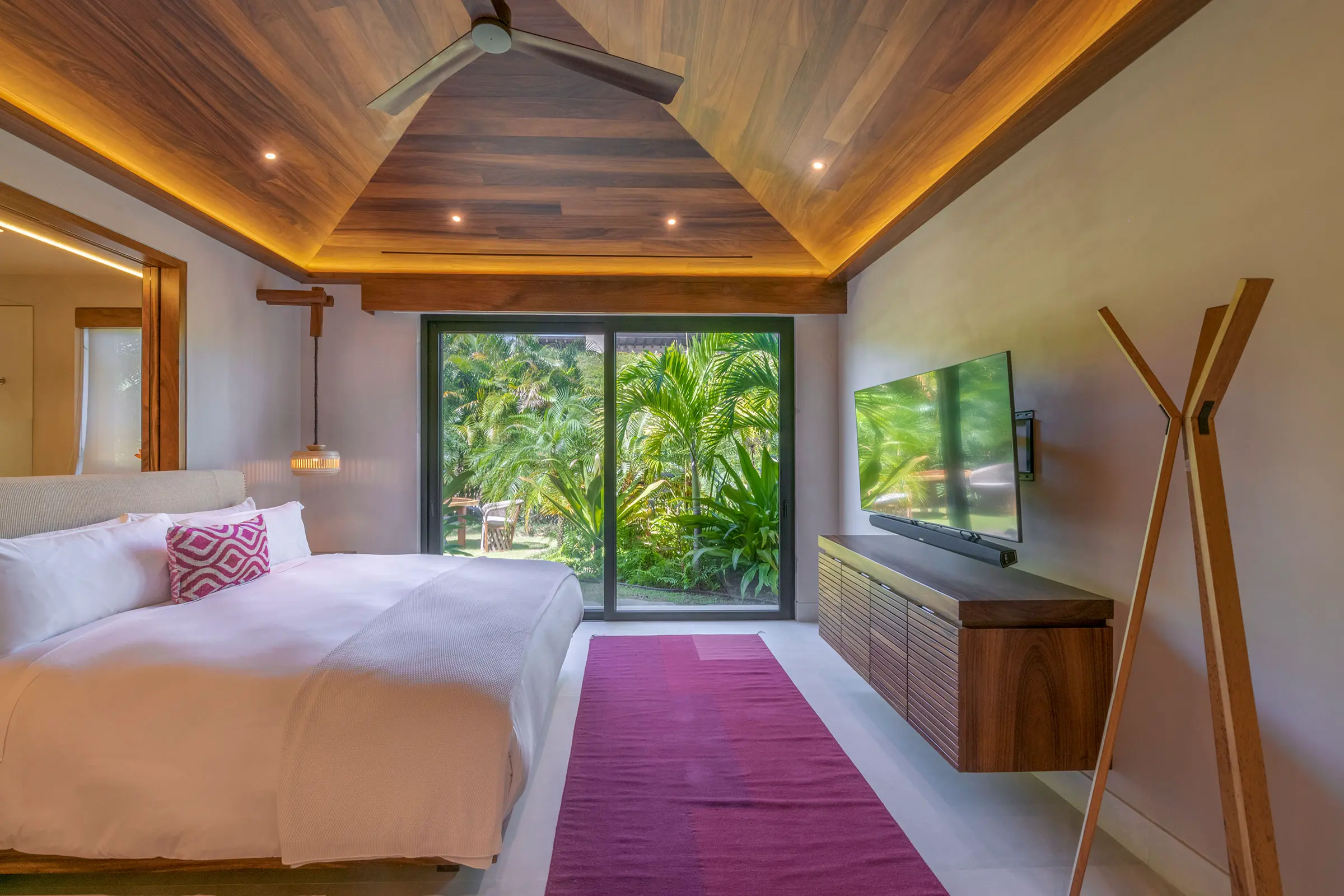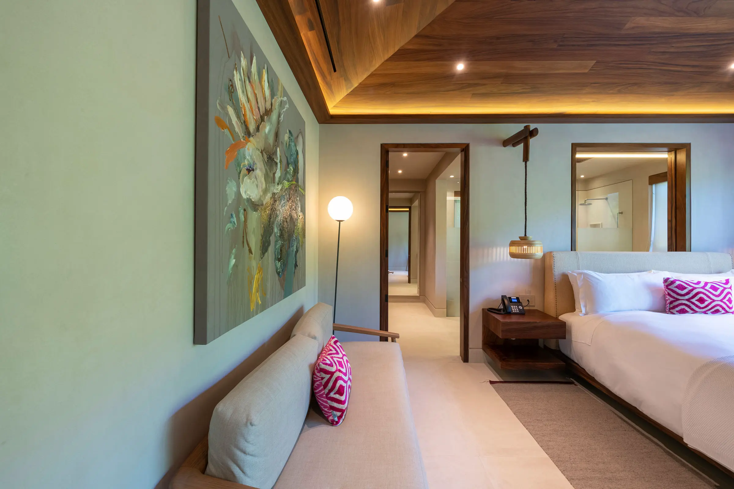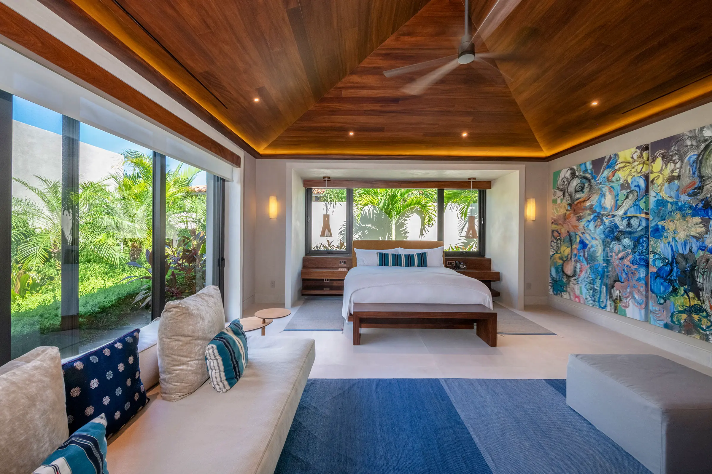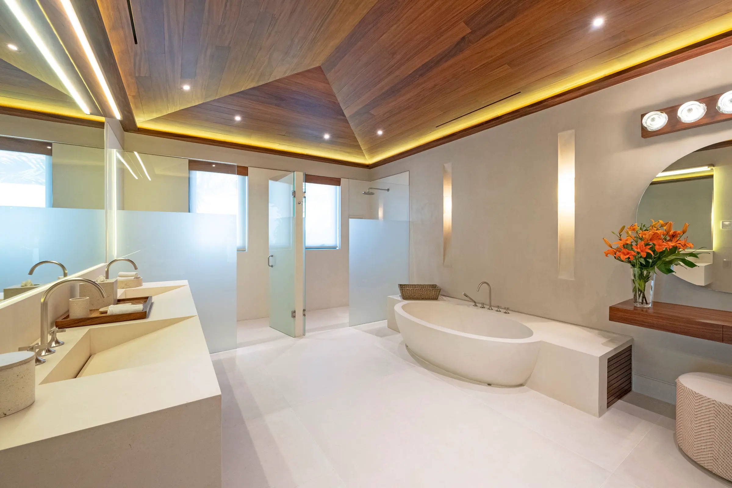 The Master Suite offers a king-size bed, ocean views, and direct access to the pool and terrace. This luxurious suite also includes a small living room area, a Smart TV, and a spa-like en-suite bathroom with a bathtub, double sink, and indoor and outdoor showers. It is a truly serene space, perfect for unwinding after a day at the beach.