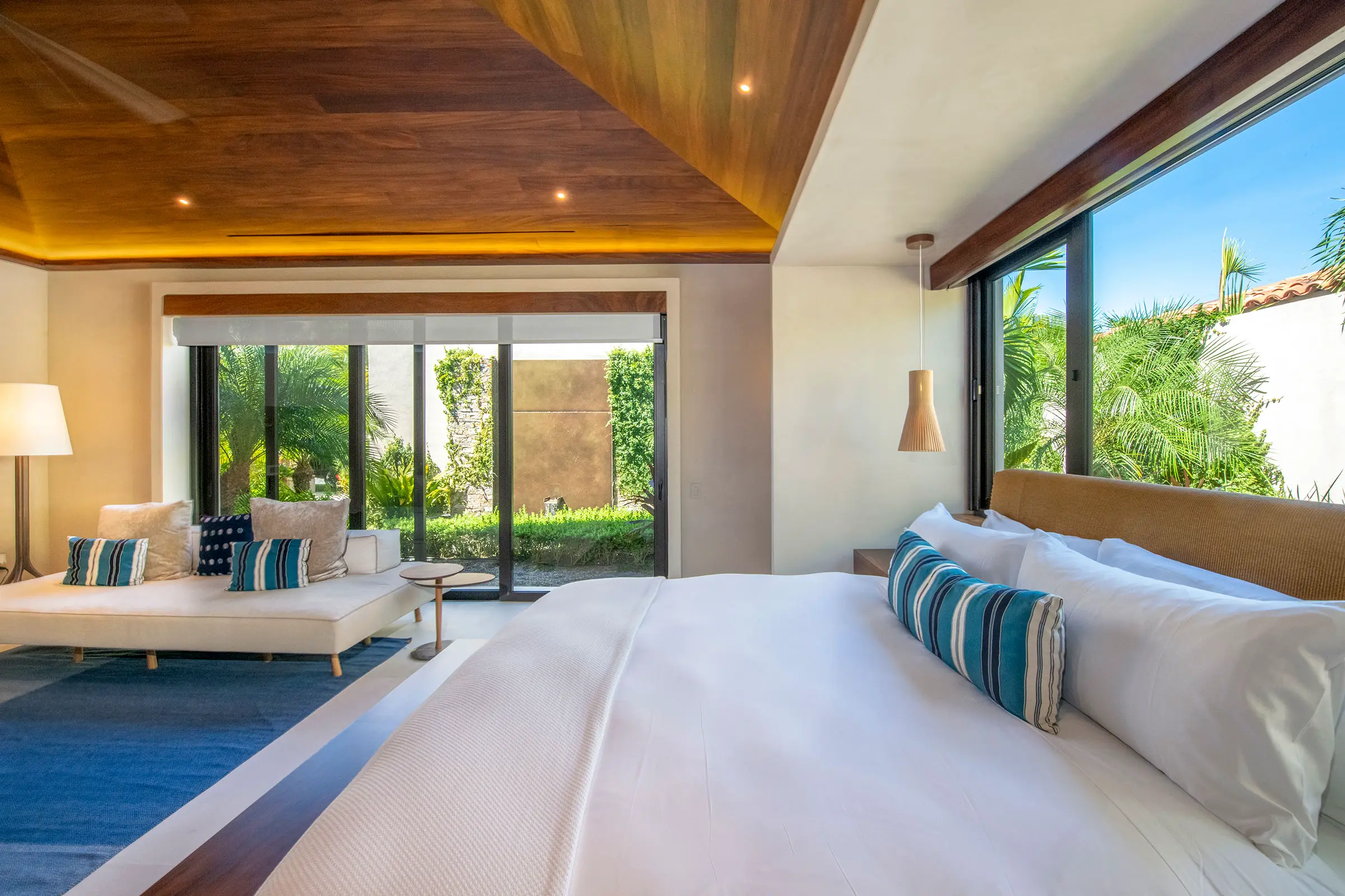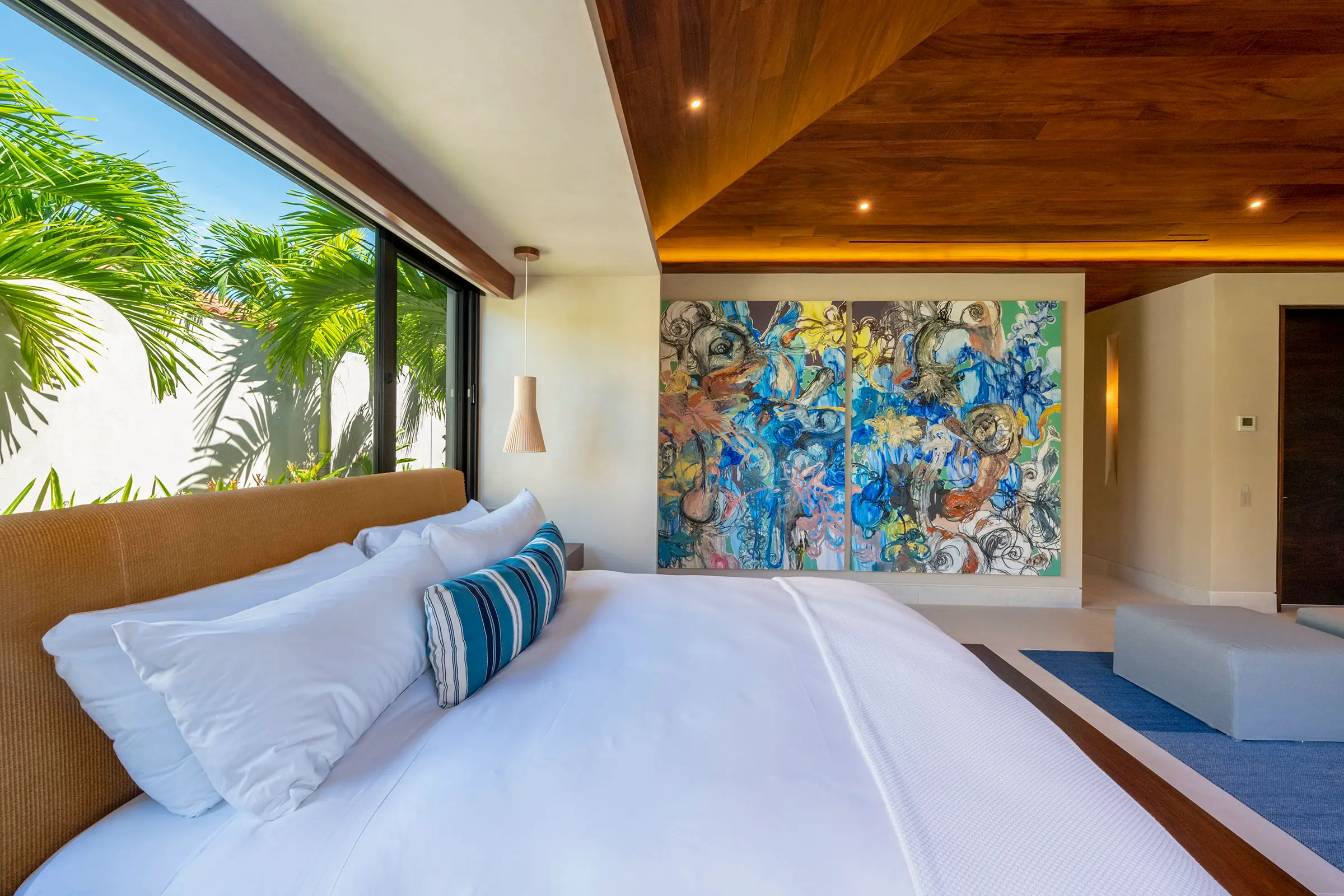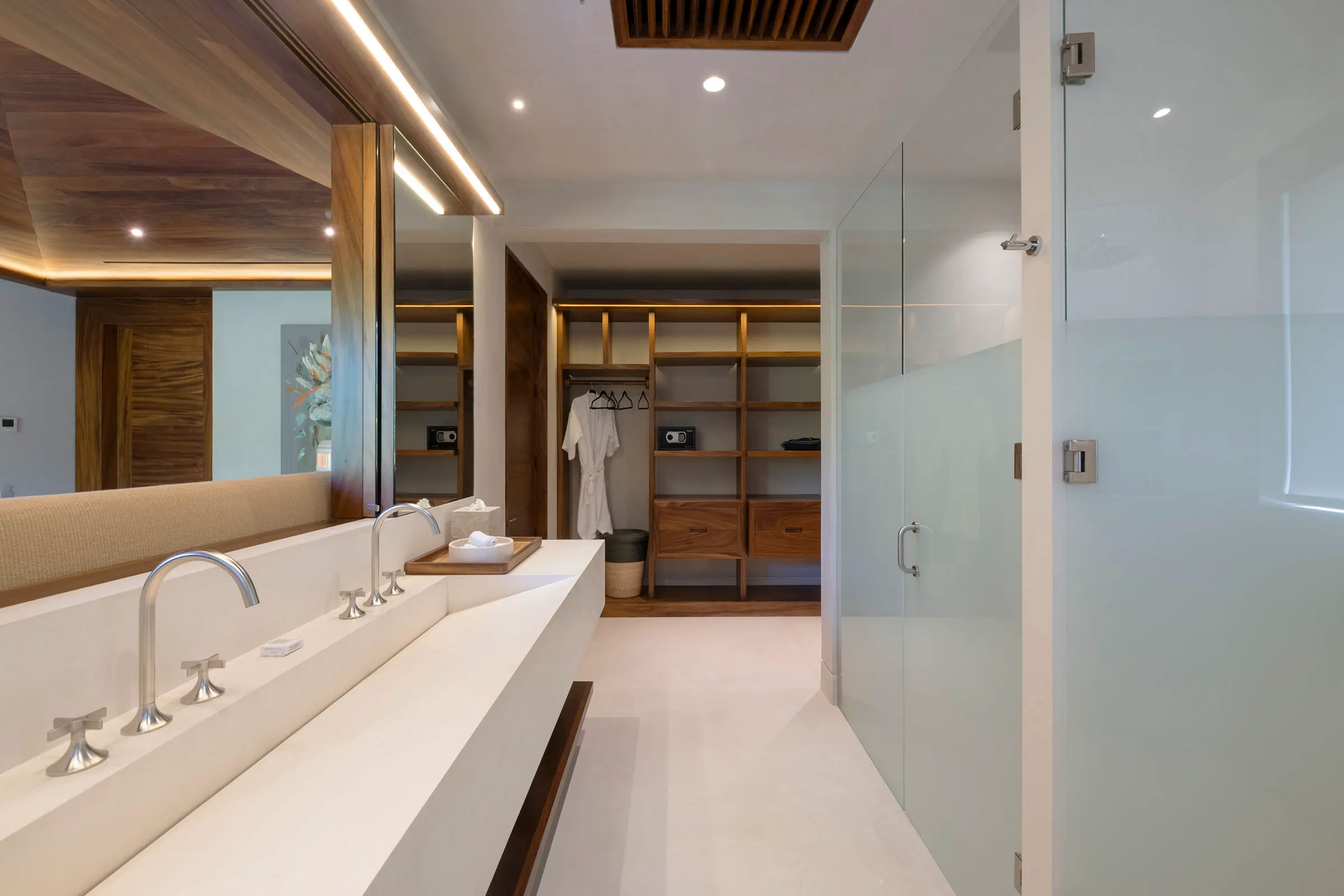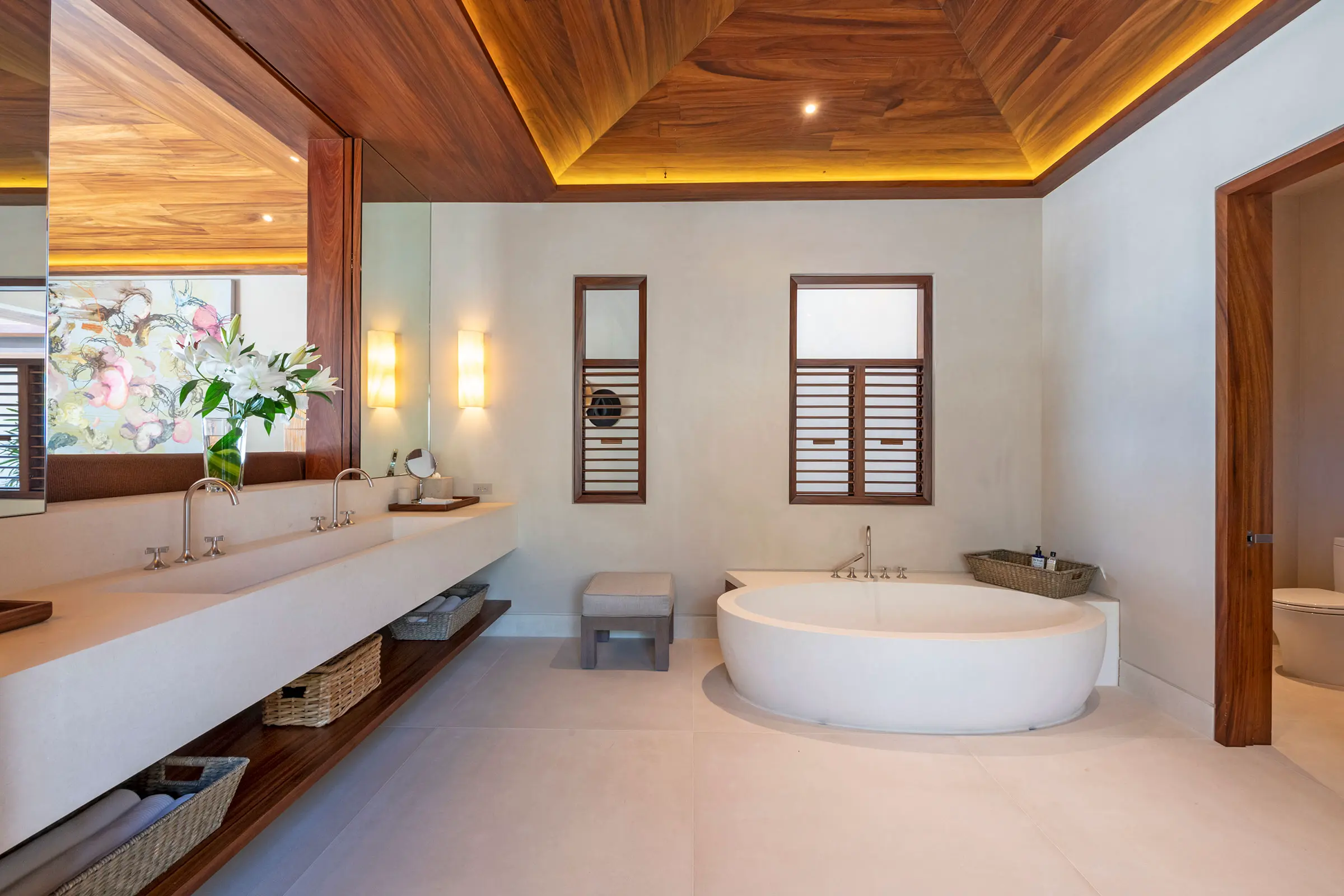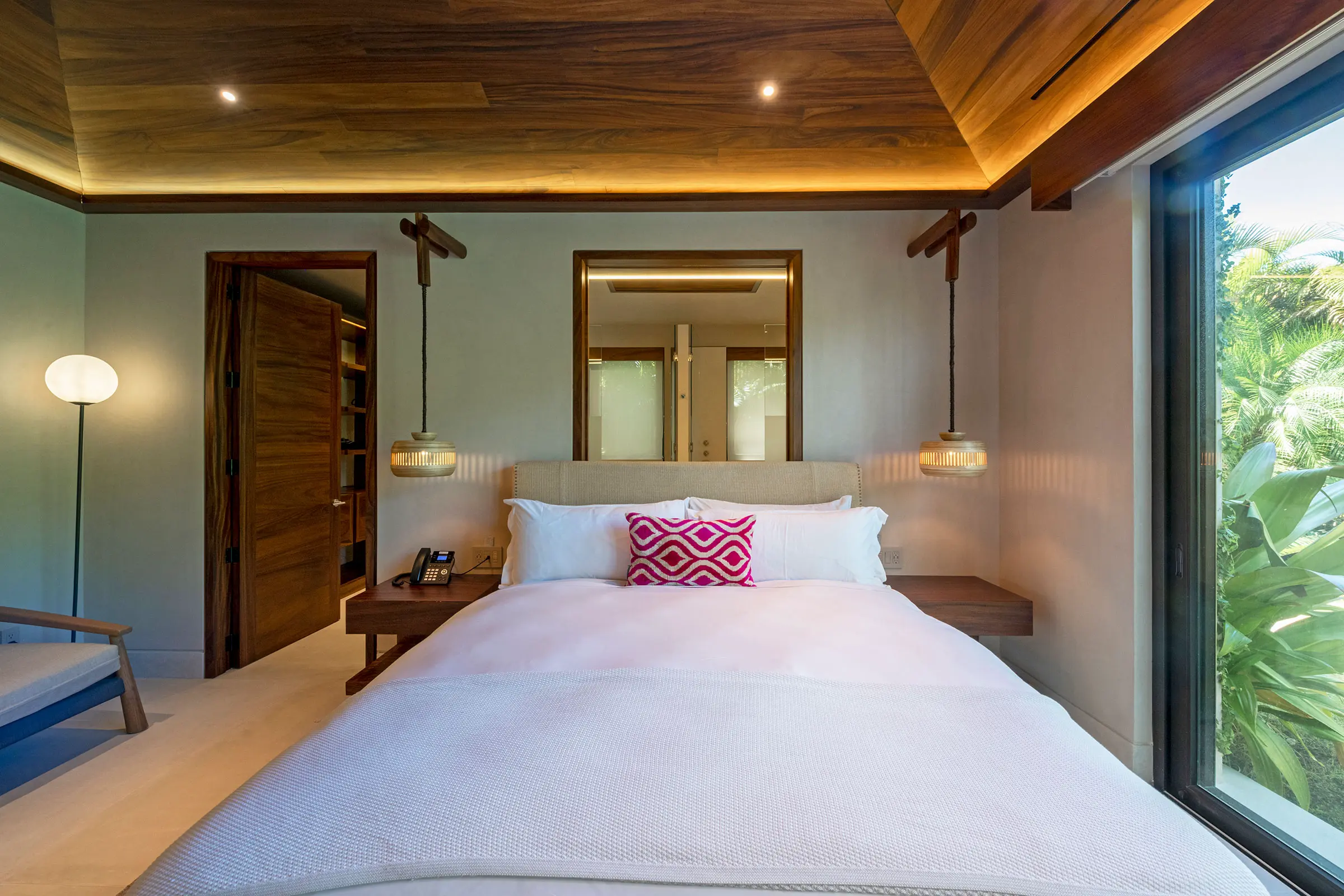 The Master Suite offers a king-size bed, ocean views, and direct access to the pool and terrace. This luxurious suite also includes a small living room area, a Smart TV, and a spa-like en-suite bathroom with a bathtub, double sink, and indoor and outdoor showers. It is a truly serene space, perfect for unwinding after a day at the beach.