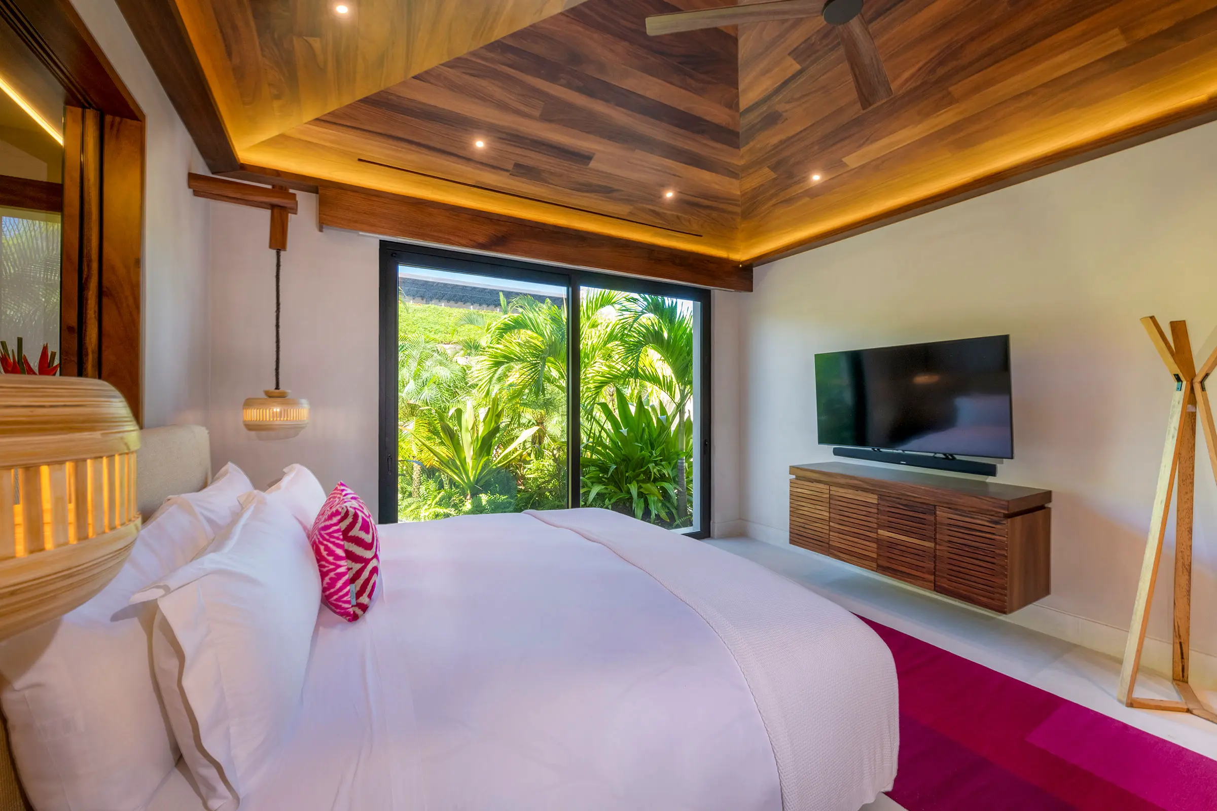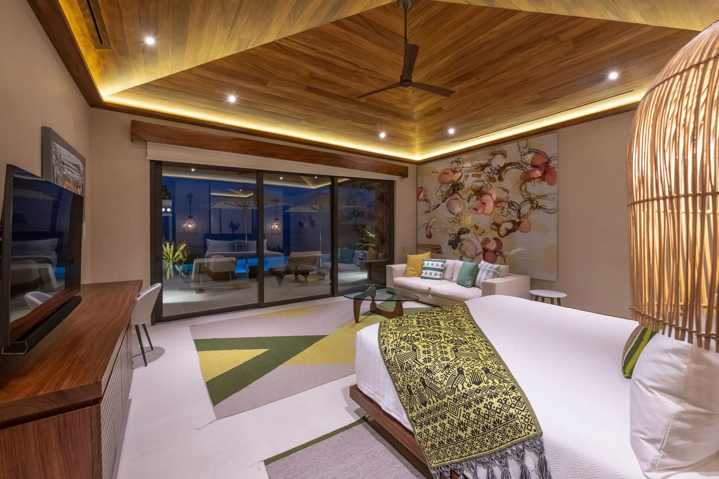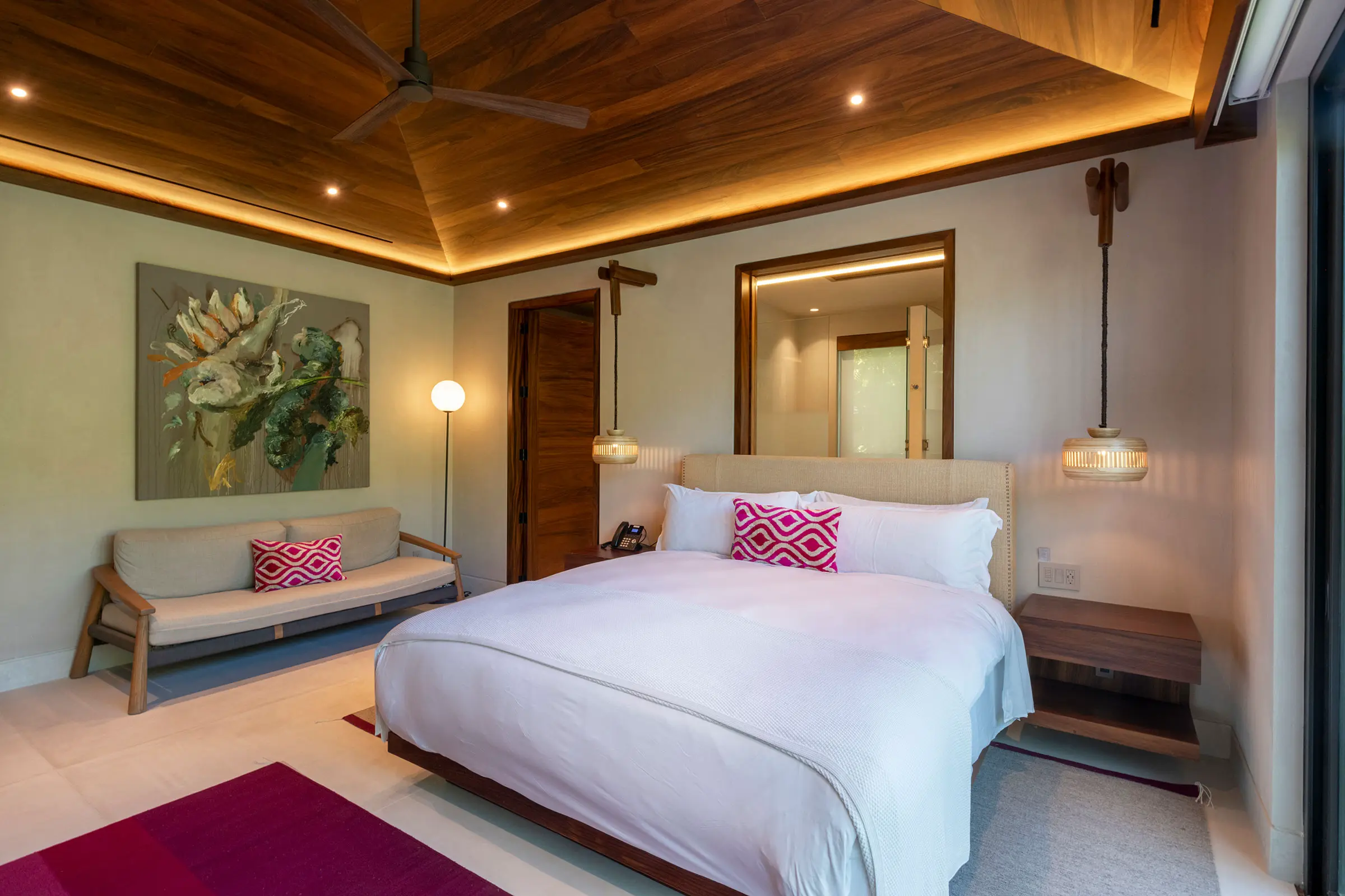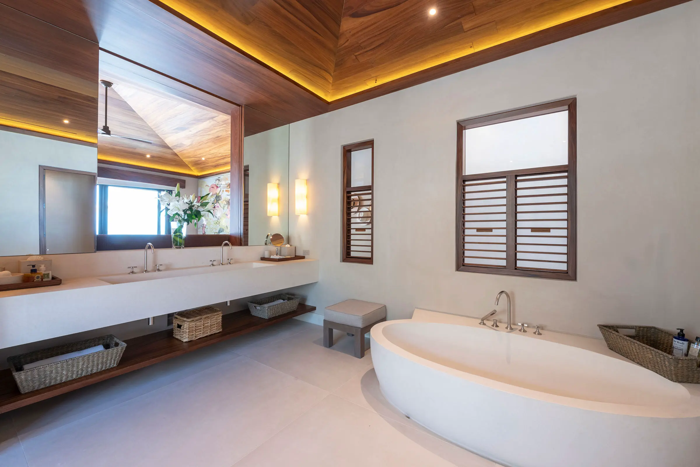 The Master Suite offers a king-size bed, ocean views, and direct access to the pool and terrace. This luxurious suite also includes a small living room area, a Smart TV, and a spa-like en-suite bathroom with a bathtub, double sink, and indoor and outdoor showers. It is a truly serene space, perfect for unwinding after a day at the beach.