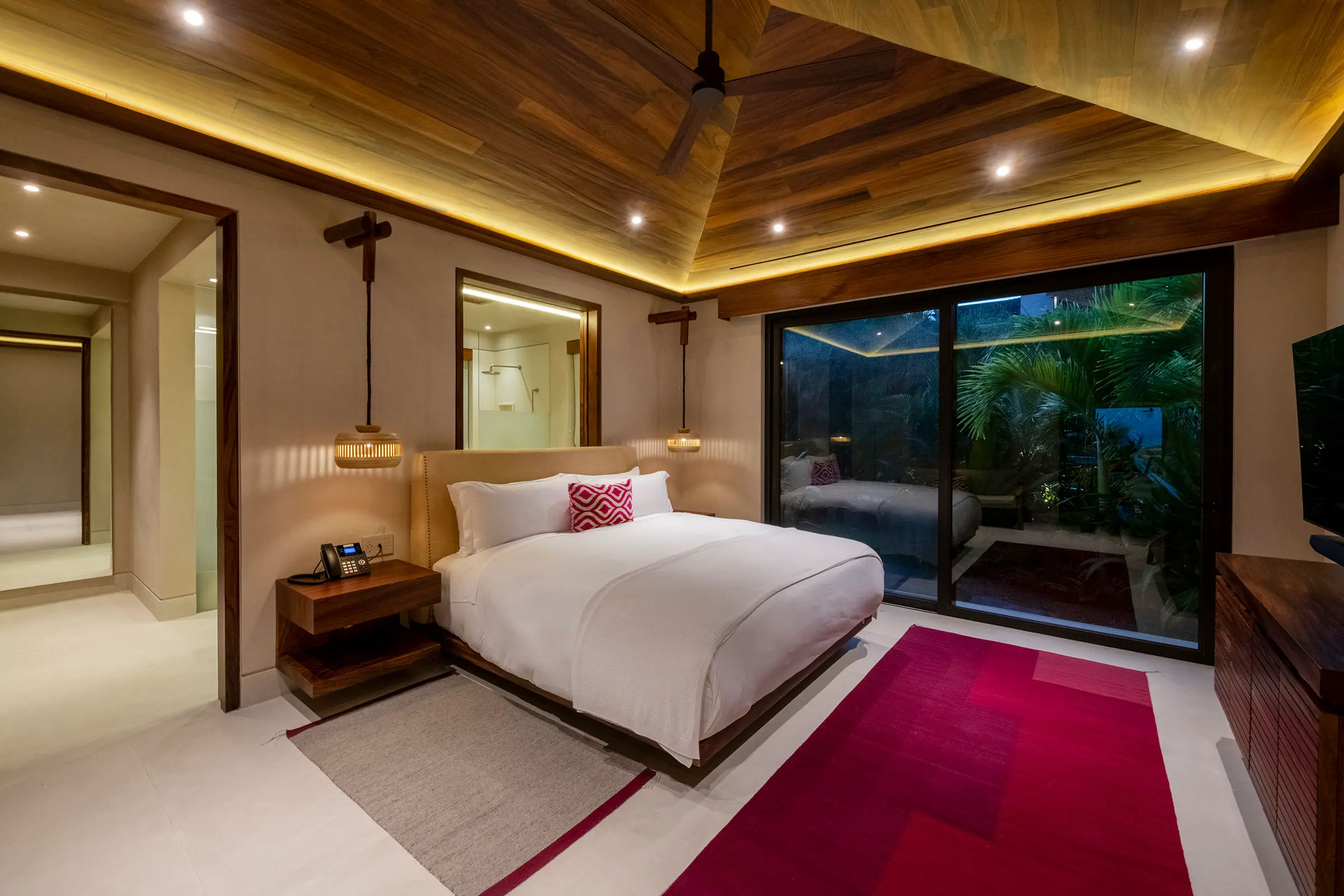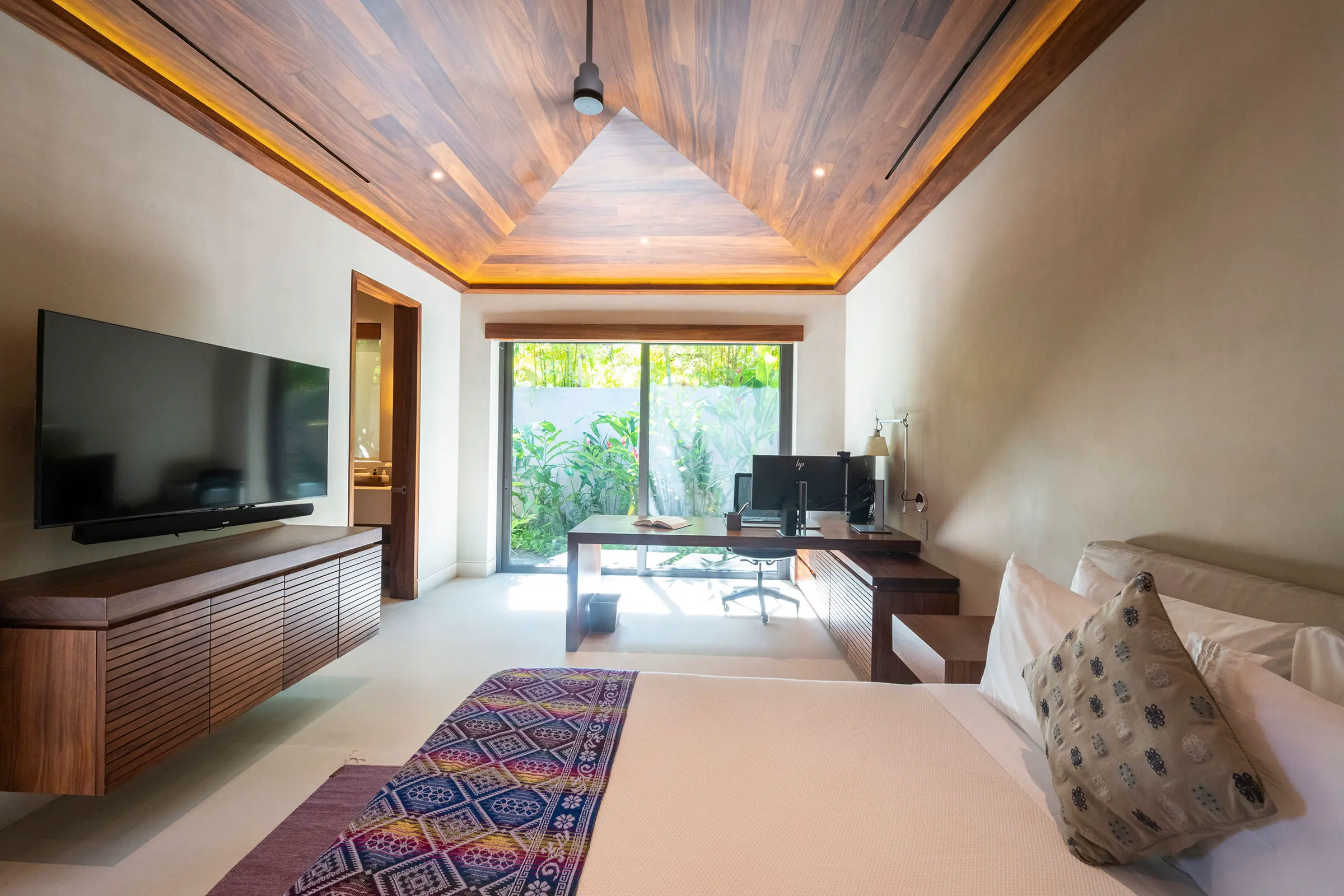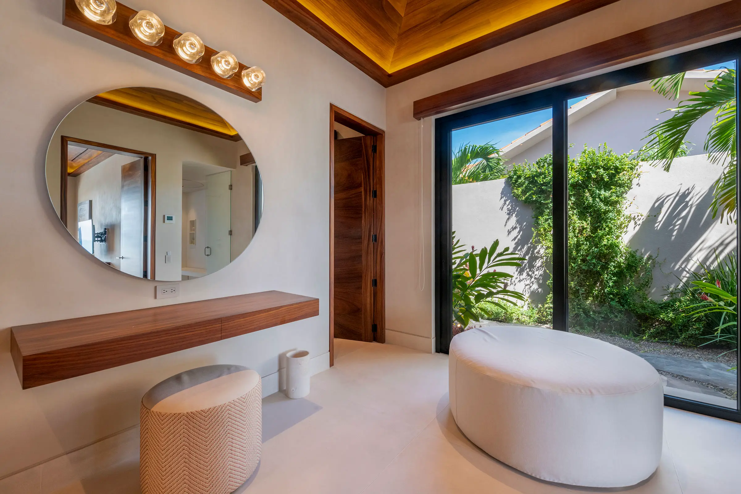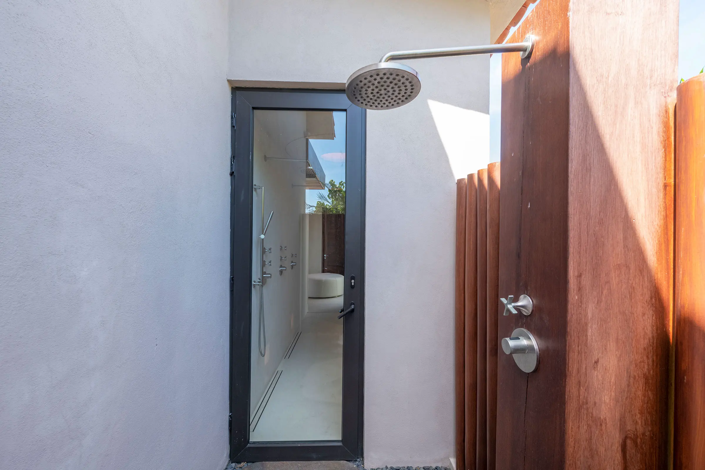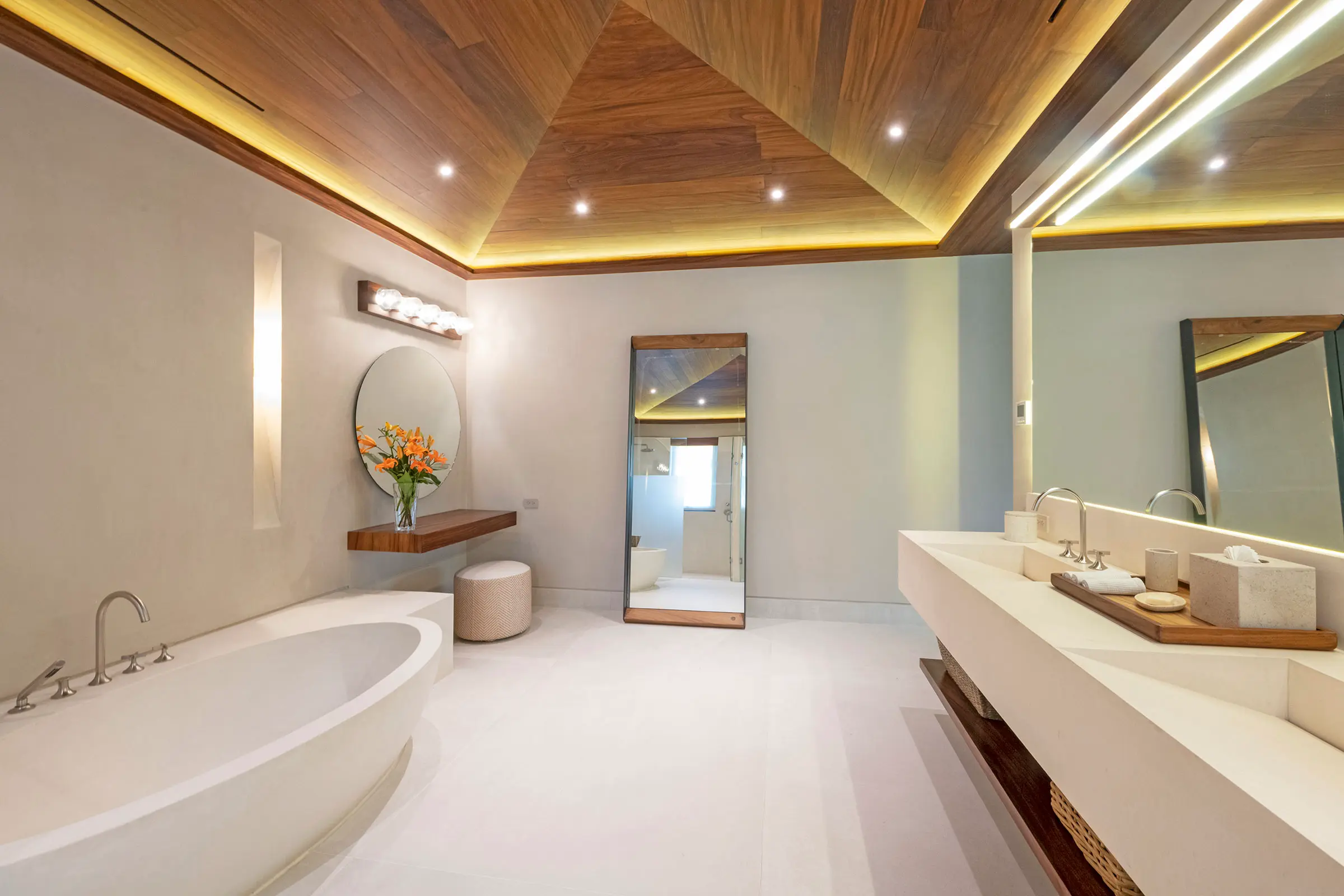 The Master Suite offers a king-size bed, ocean views, and direct access to the pool and terrace. This luxurious suite also includes a small living room area, a Smart TV, and a spa-like en-suite bathroom with a bathtub, double sink, and indoor and outdoor showers. It is a truly serene space, perfect for unwinding after a day at the beach.
