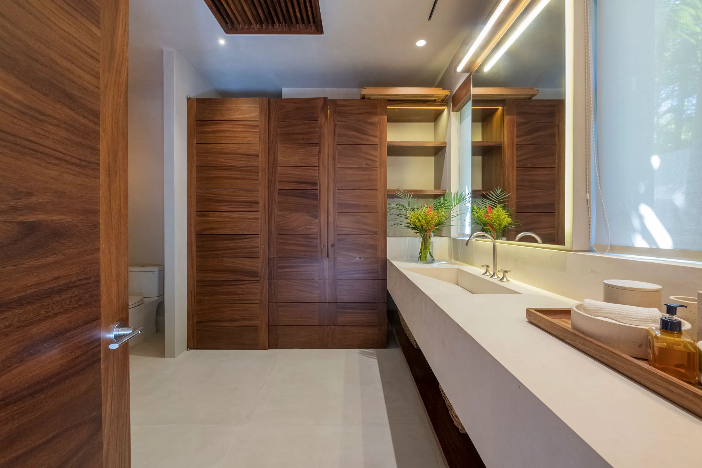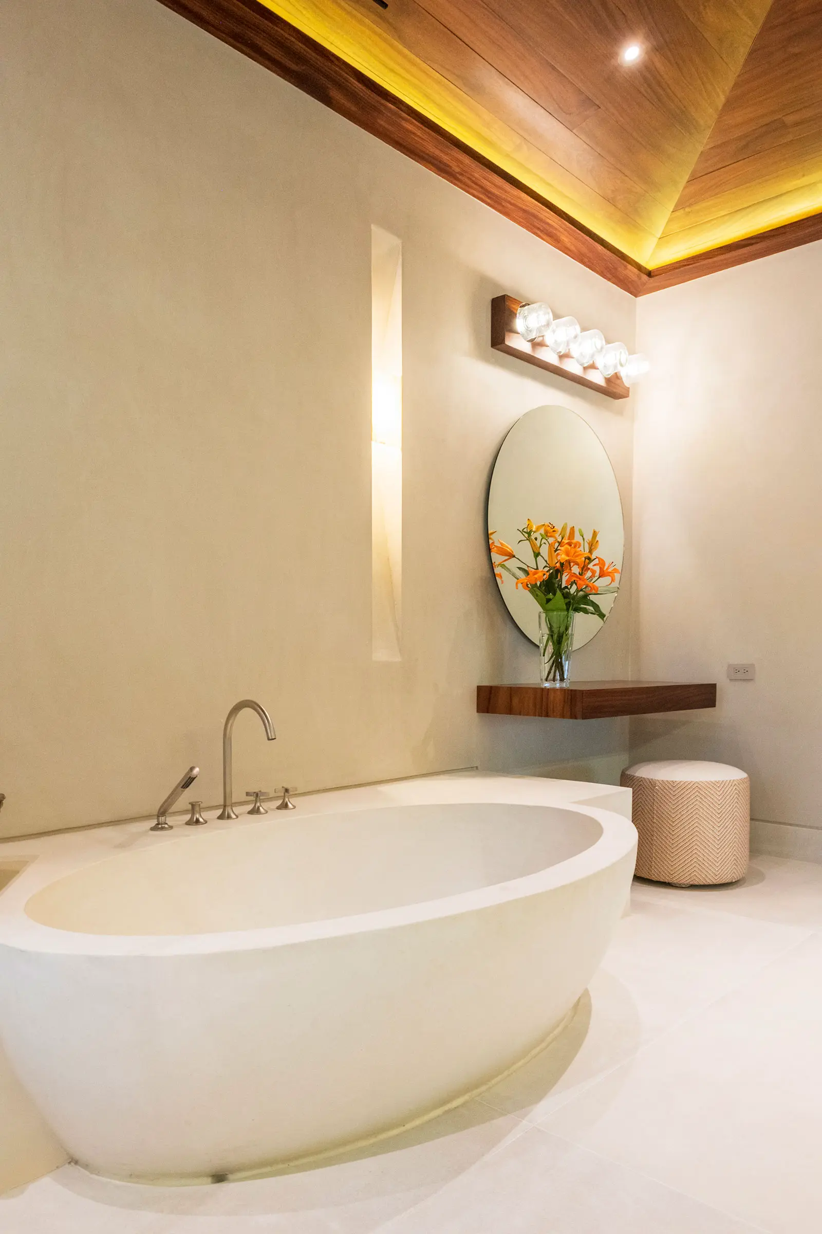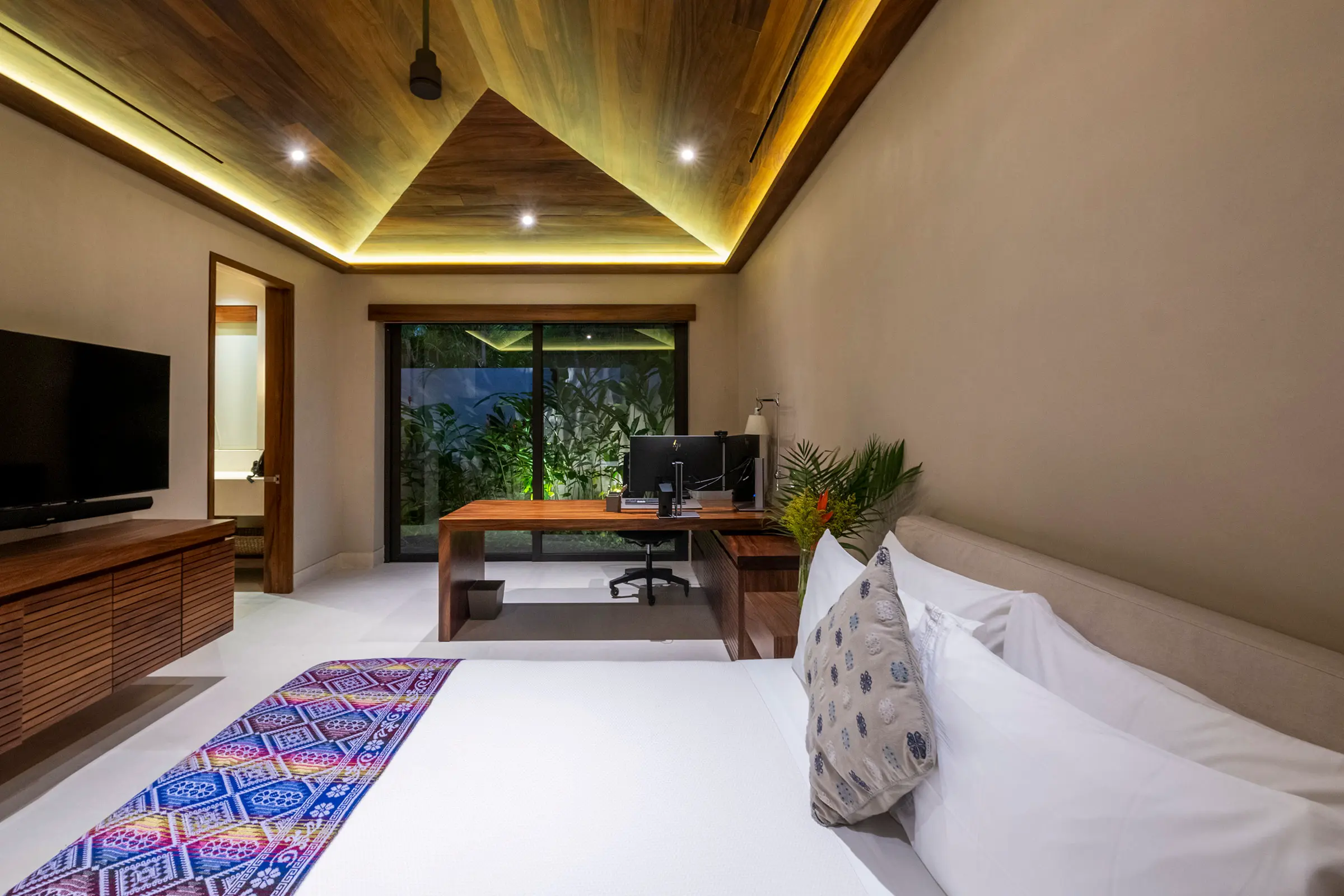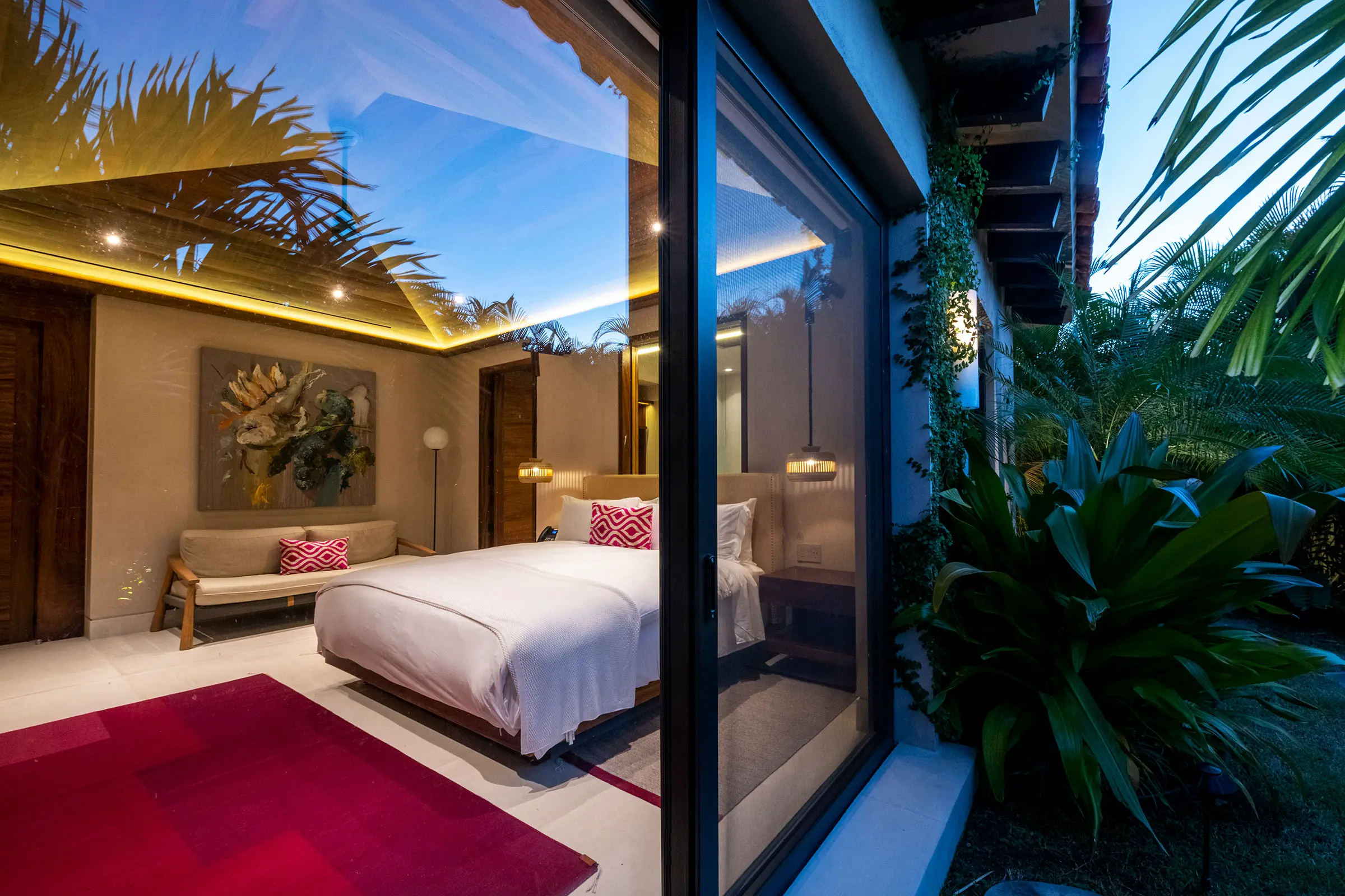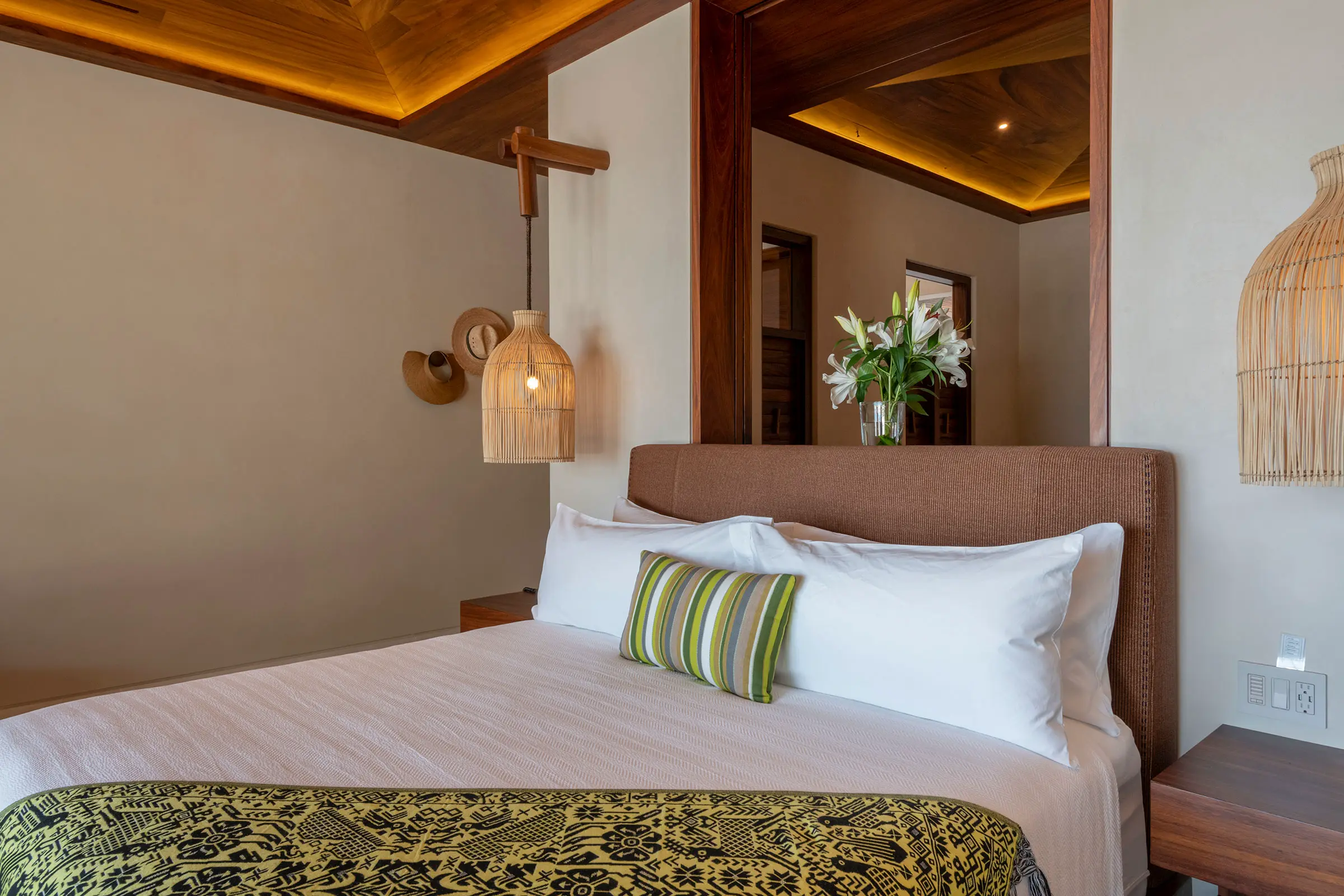 The Master Suite offers a king-size bed, ocean views, and direct access to the pool and terrace. This luxurious suite also includes a small living room area, a Smart TV, and a spa-like en-suite bathroom with a bathtub, double sink, and indoor and outdoor showers. It is a truly serene space, perfect for unwinding after a day at the beach.