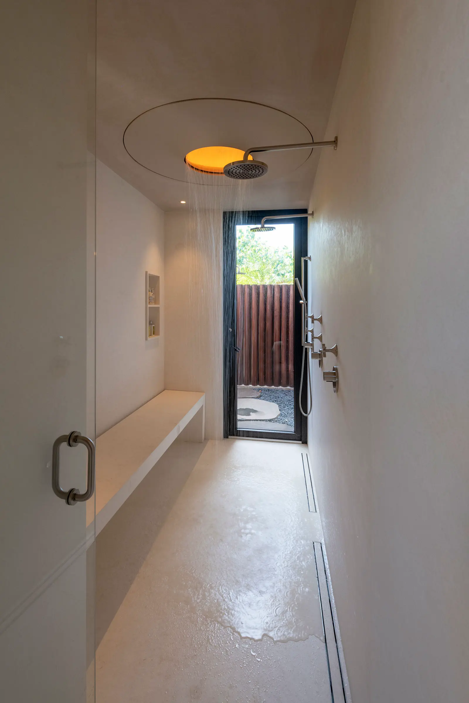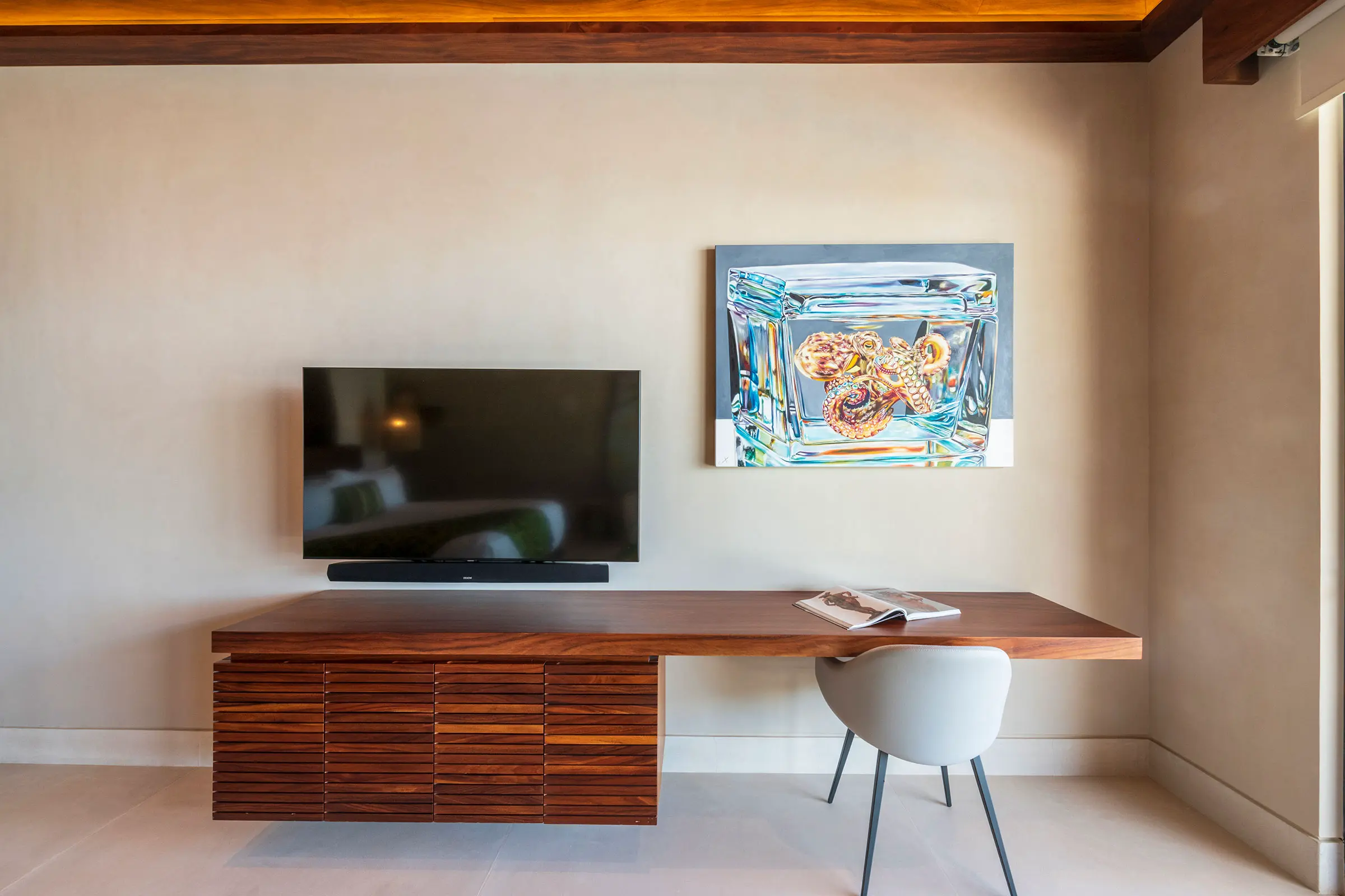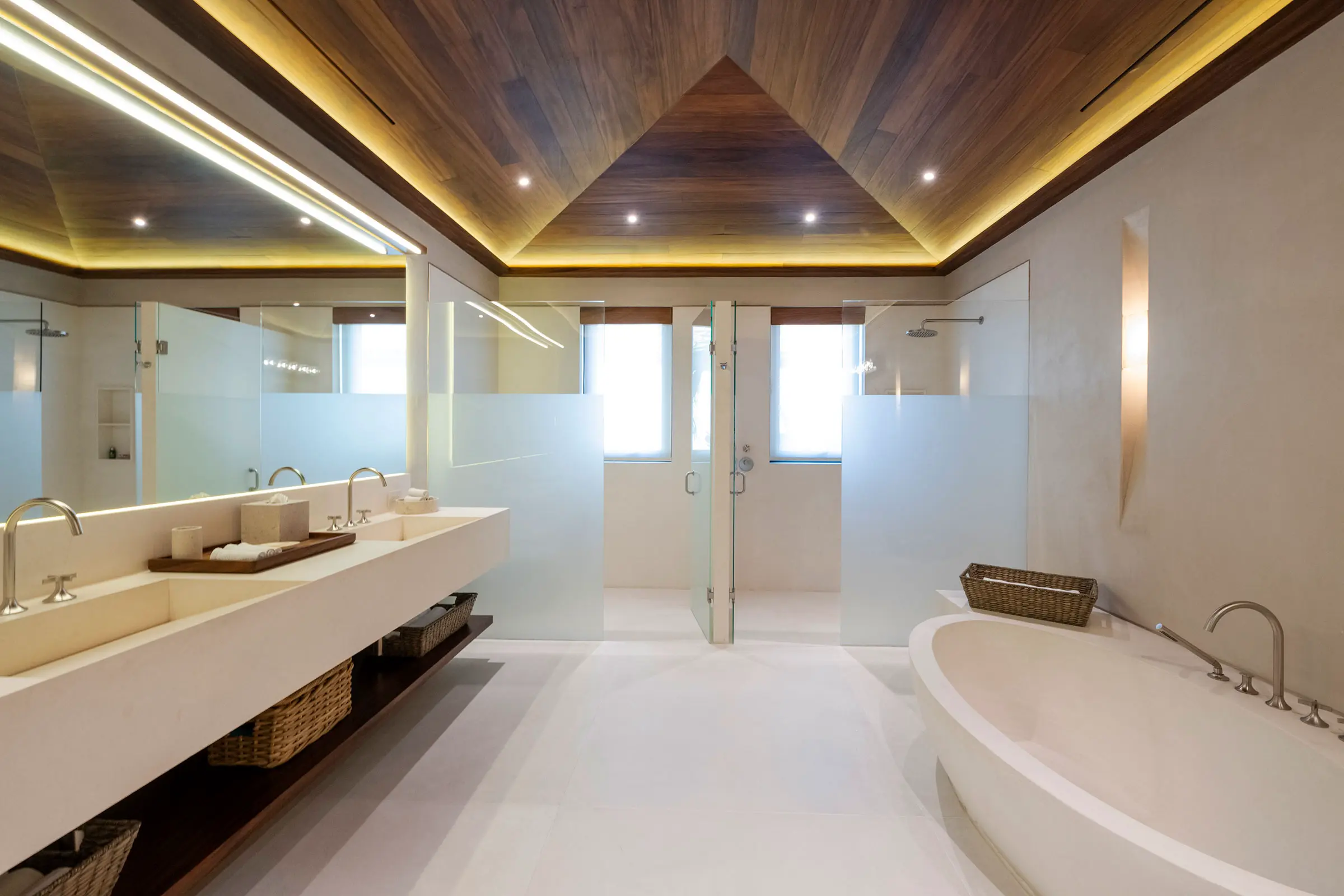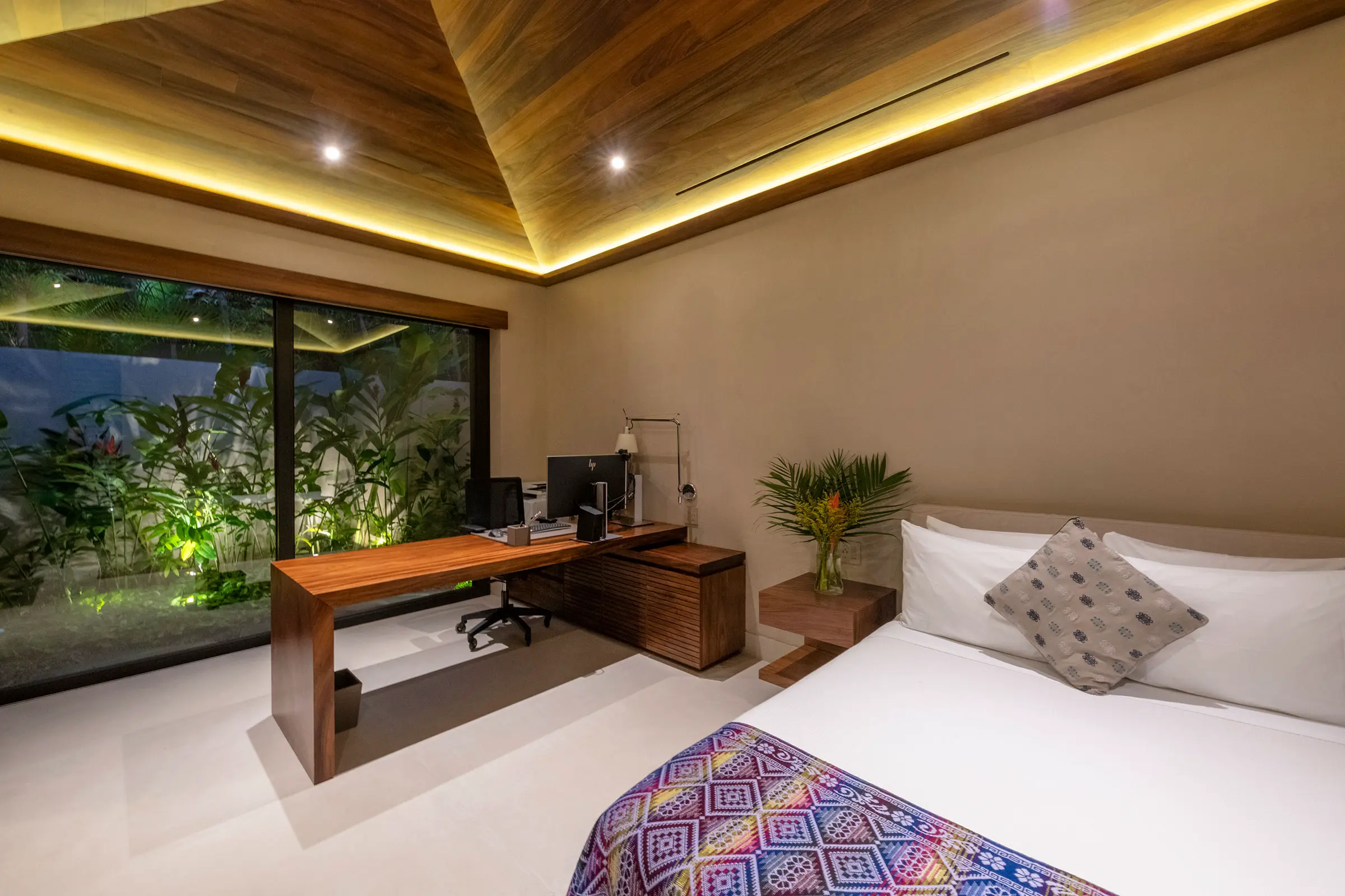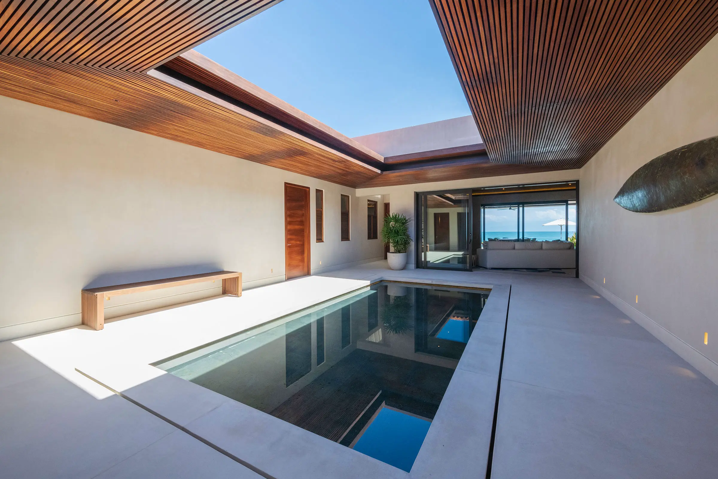 The Master Suite offers a king-size bed, ocean views, and direct access to the pool and terrace. This luxurious suite also includes a small living room area, a Smart TV, and a spa-like en-suite bathroom with a bathtub, double sink, and indoor and outdoor showers. It is a truly serene space, perfect for unwinding after a day at the beach.