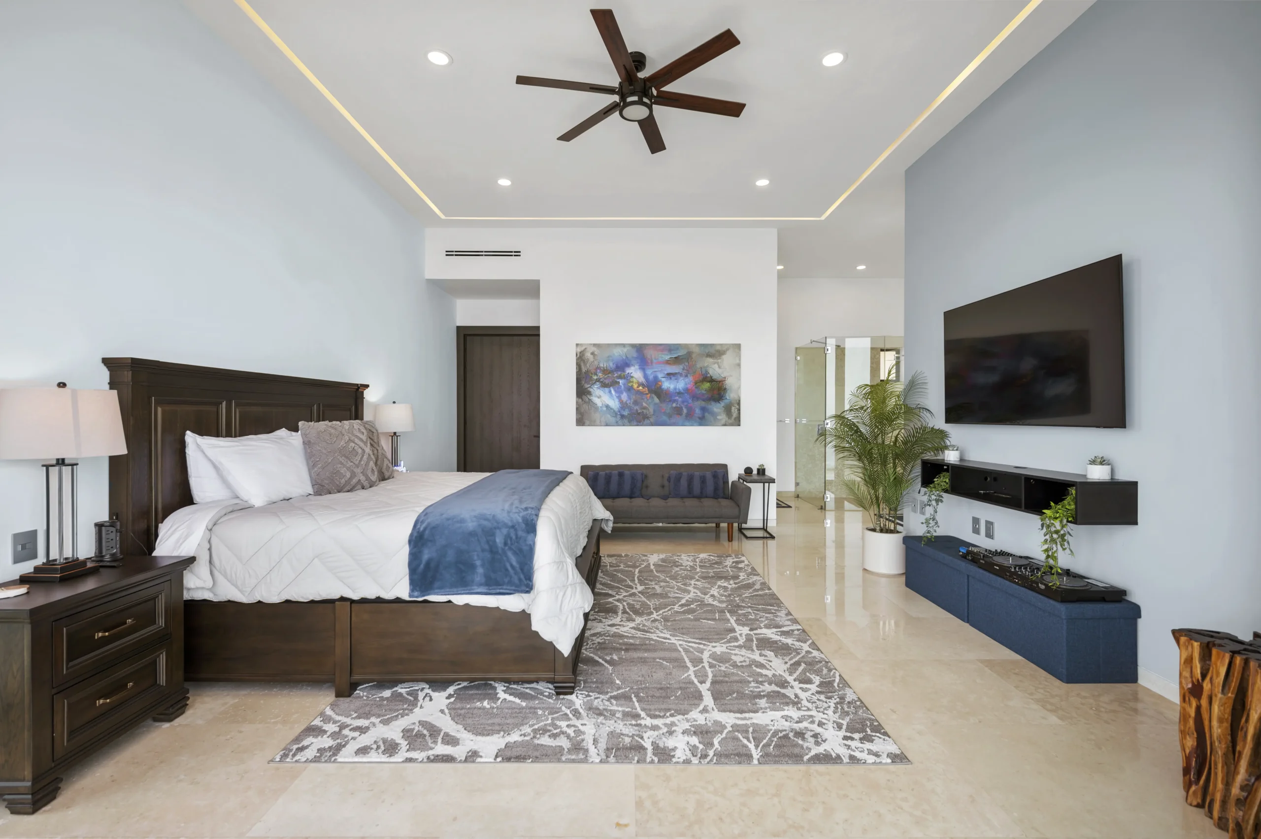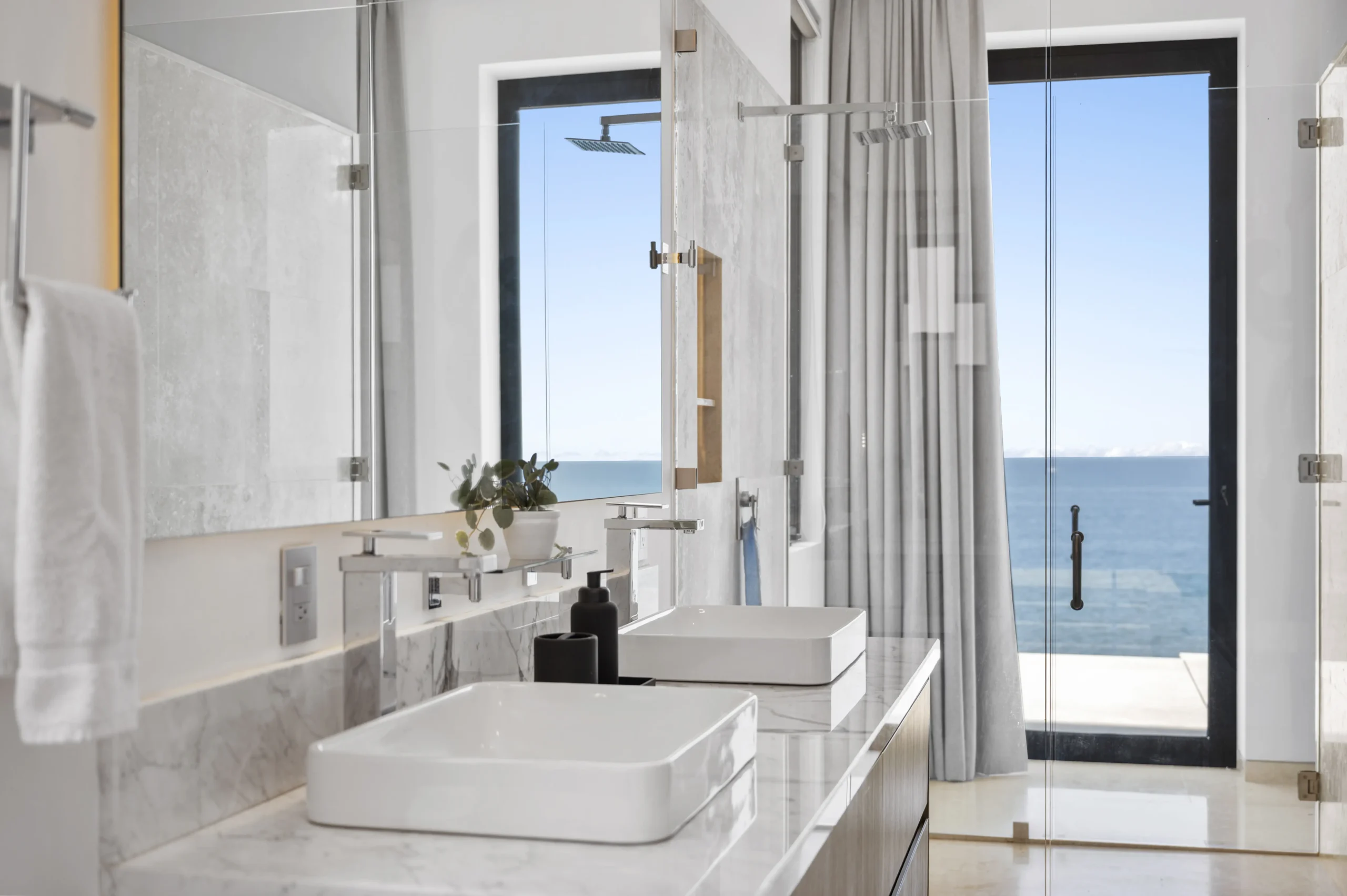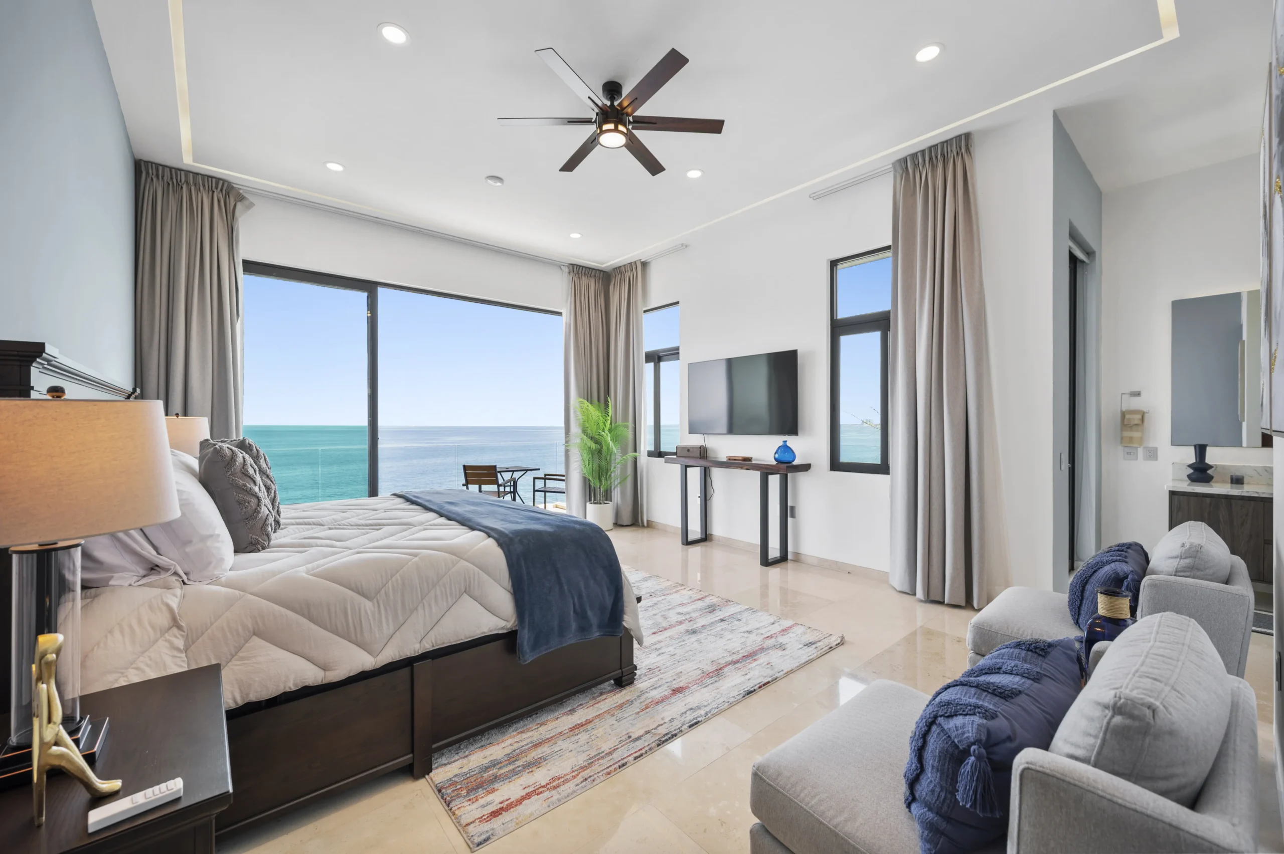 Spread across three levels connected by an elevator, the property is planned for both togetherness and personal space. Six bedrooms, each with its own ensuite bath, are arranged to provide a consistent standard of comfort, with king beds, high-thread-count linens, and spa-like bathrooms. Select bedrooms feature private balconies, giving guests an additional layer of seclusion within the larger home.