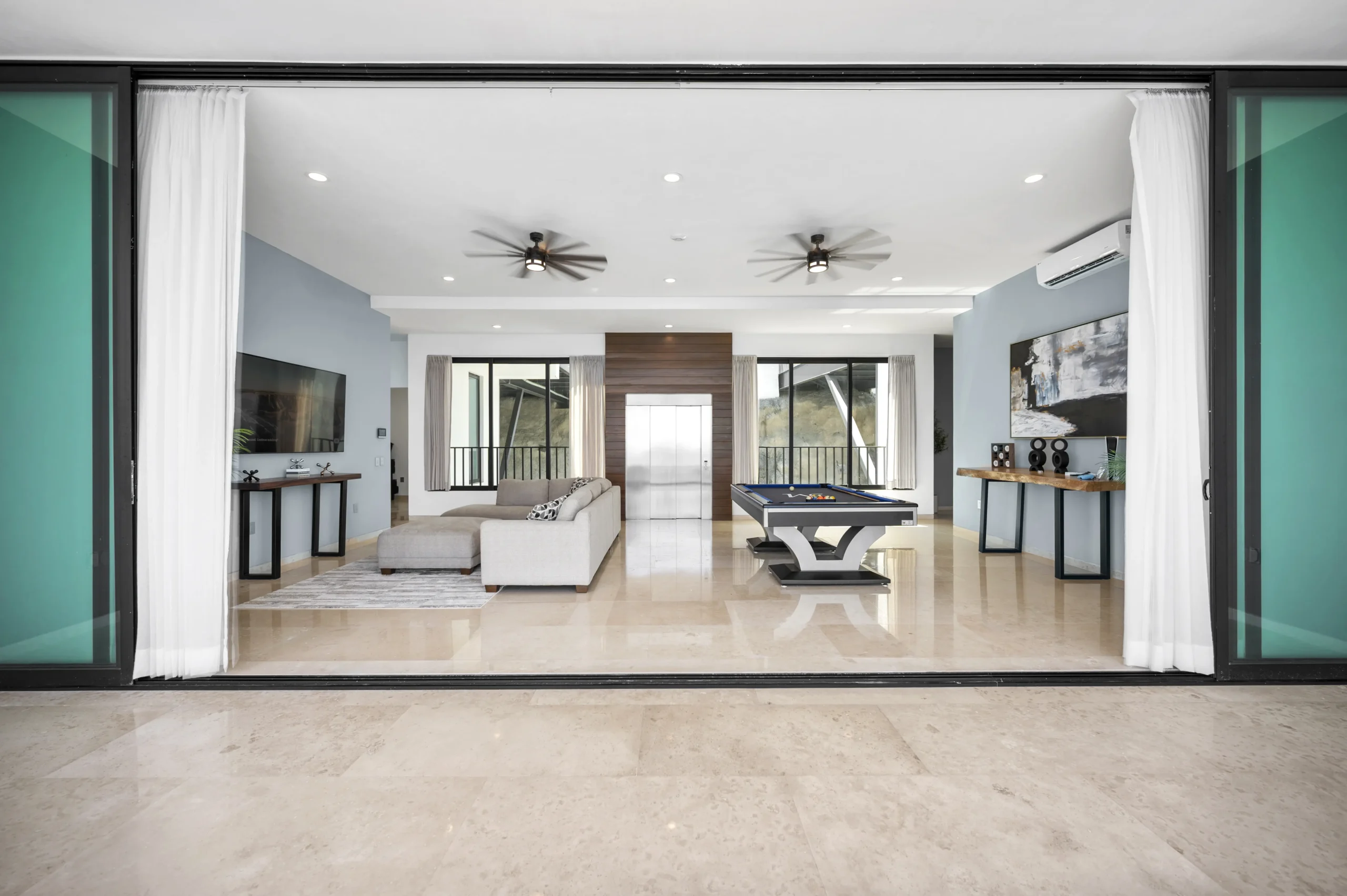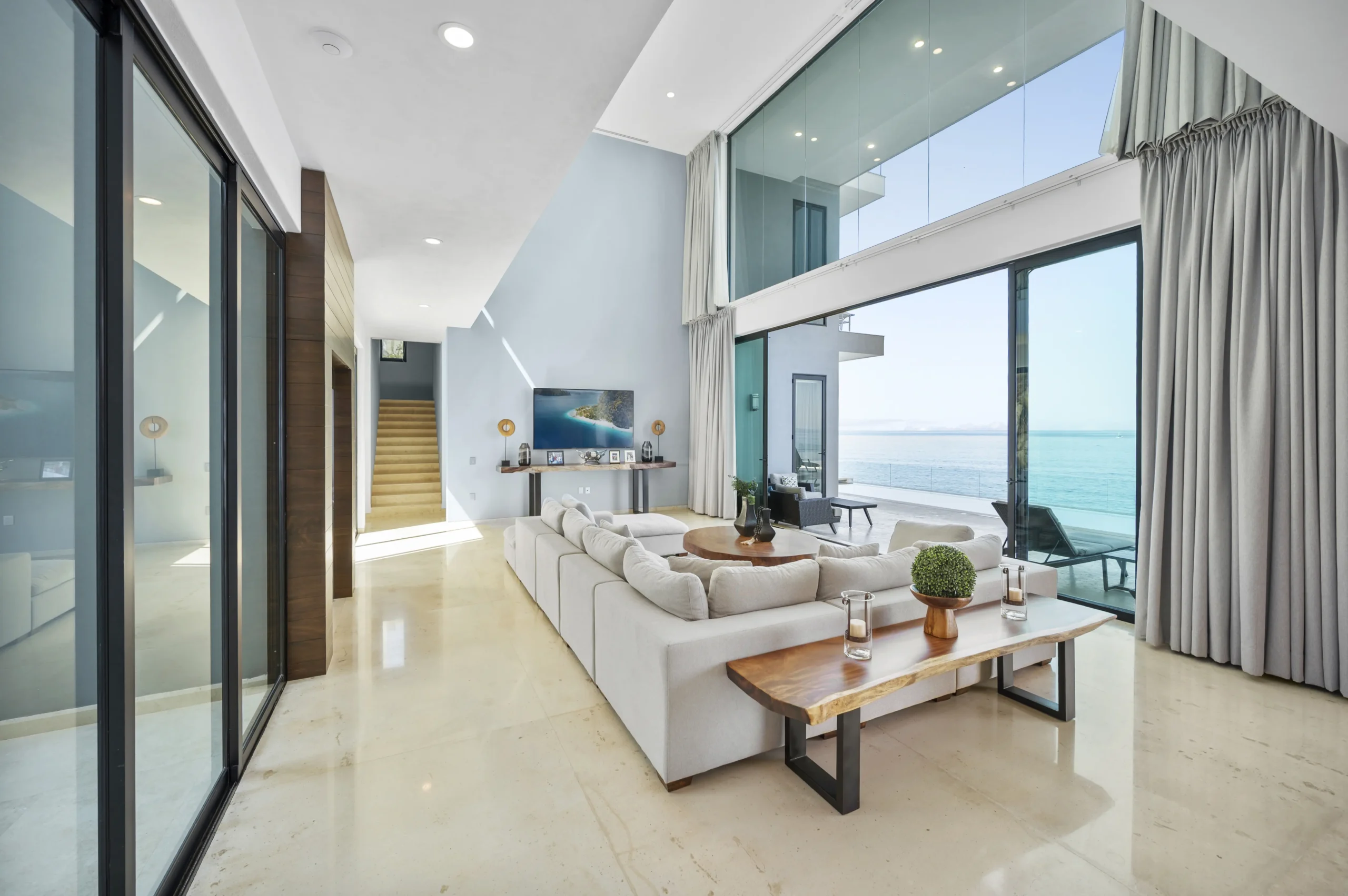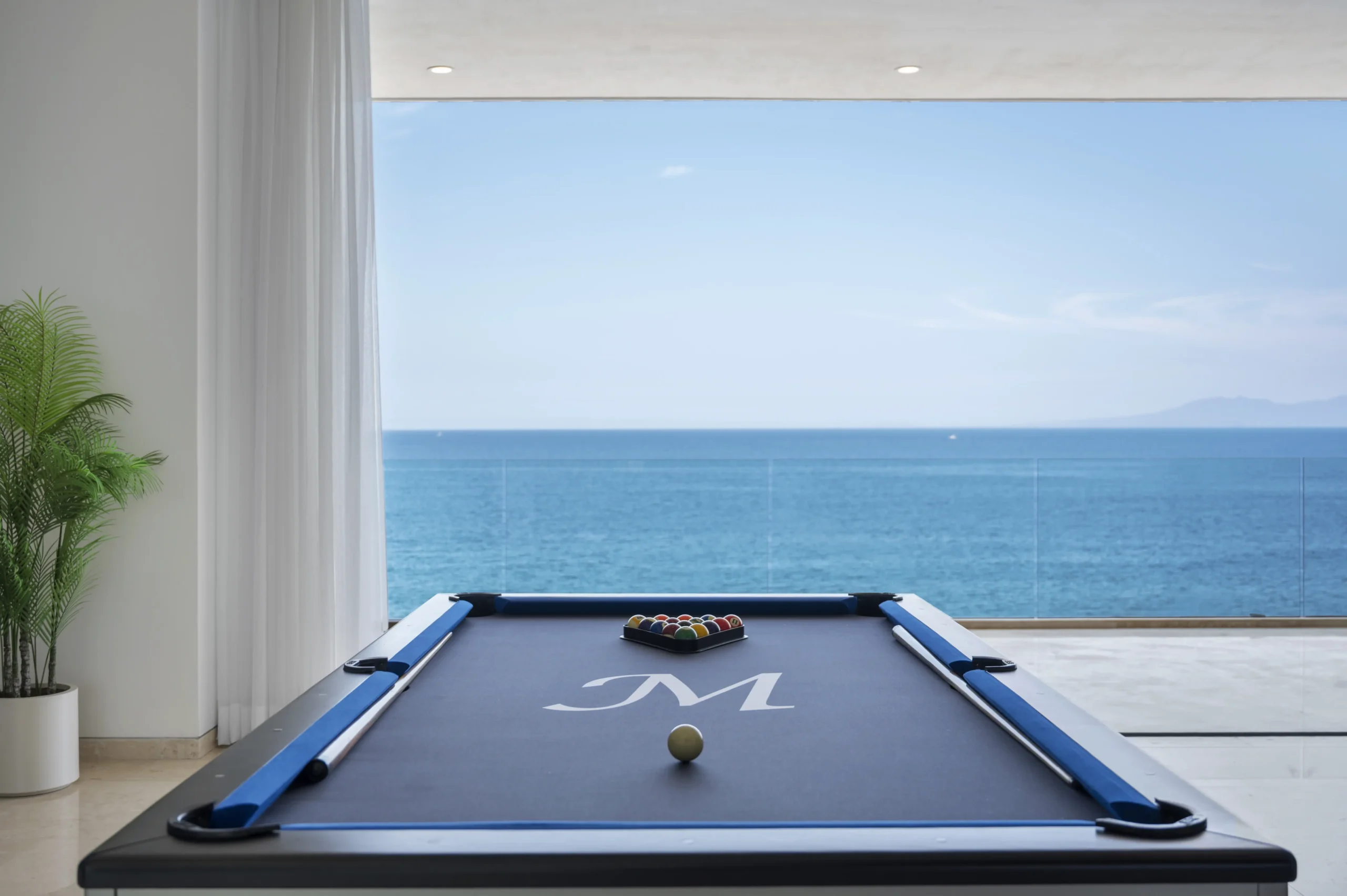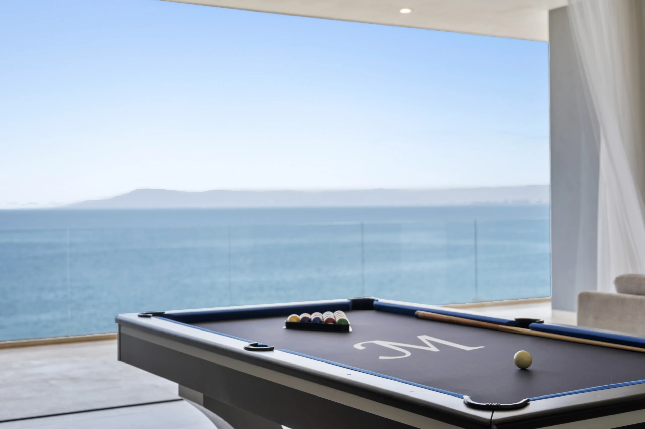 Daily life here naturally flows between relaxed lounging and sociable gathering. A grand entry hall sets the tone on arrival, opening to expansive windows and a sense of openness that carries through the interiors. The game room level, with its pool table, oversized sofa, and large-screen TV, invites casual evenings, while the gourmet kitchen and refined living areas support more elevated moments. Outside, the oceanfront infinity pool forms the visual and social centerpiece, encouraging unhurried time in and around the water.