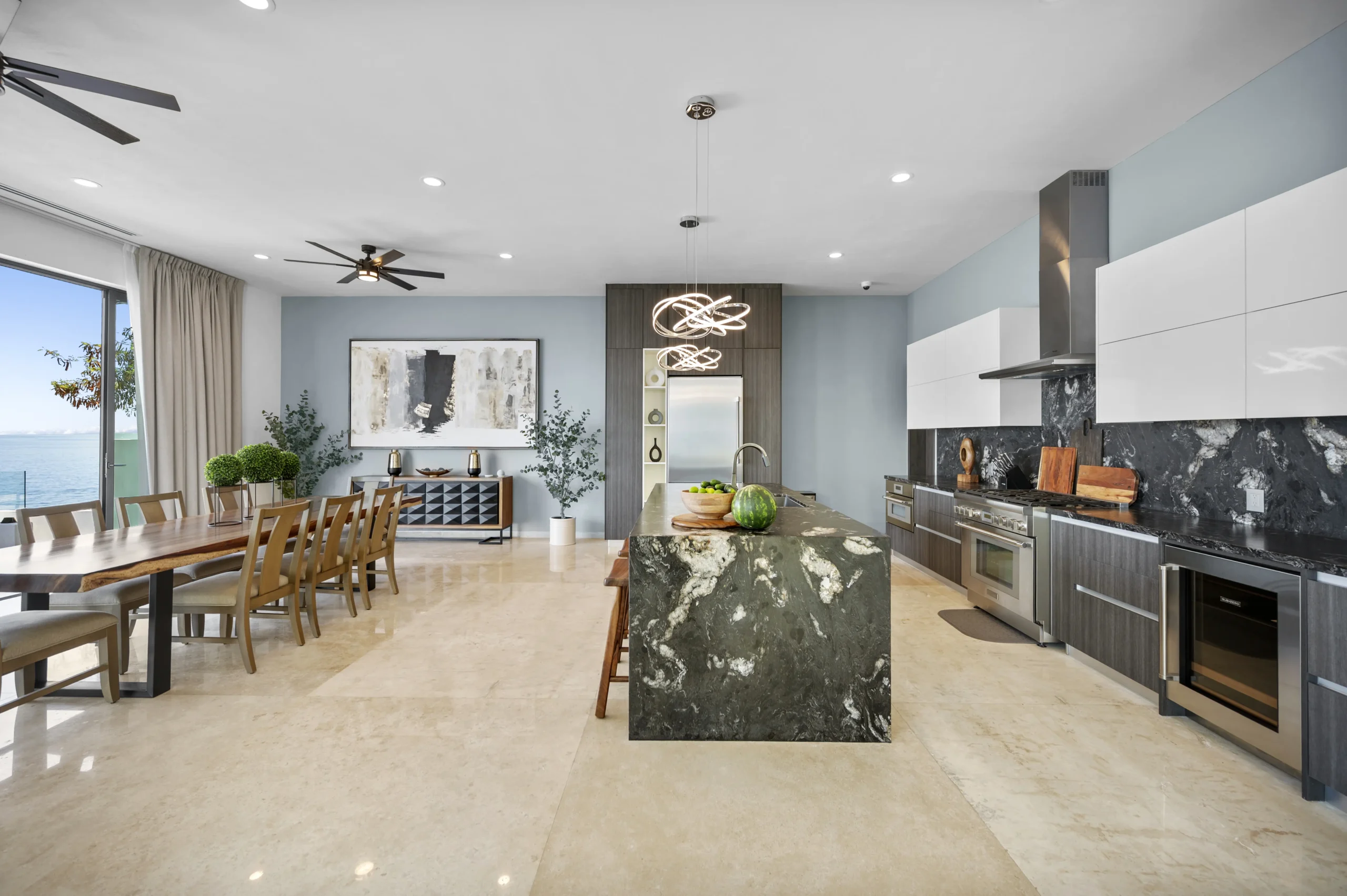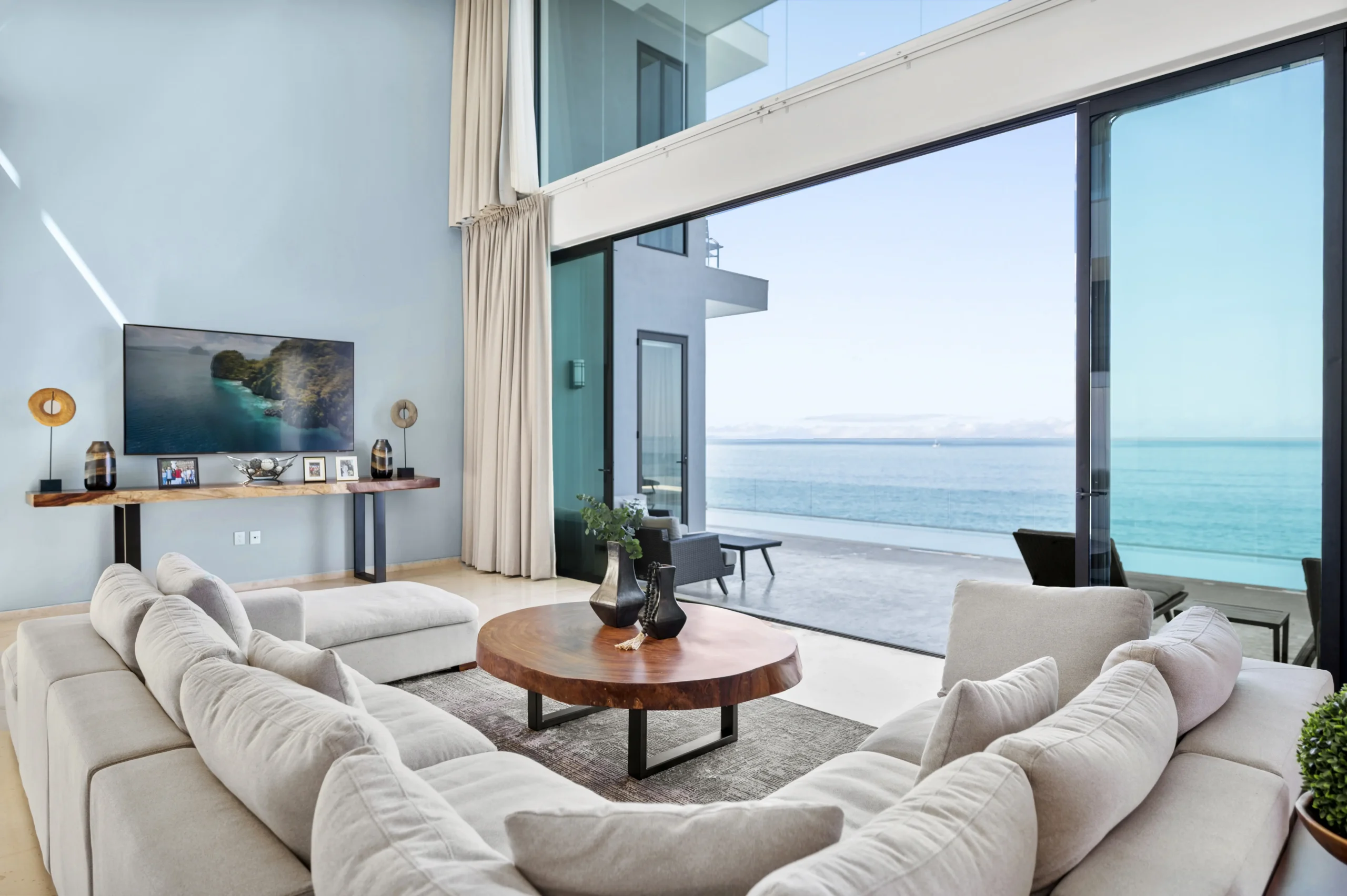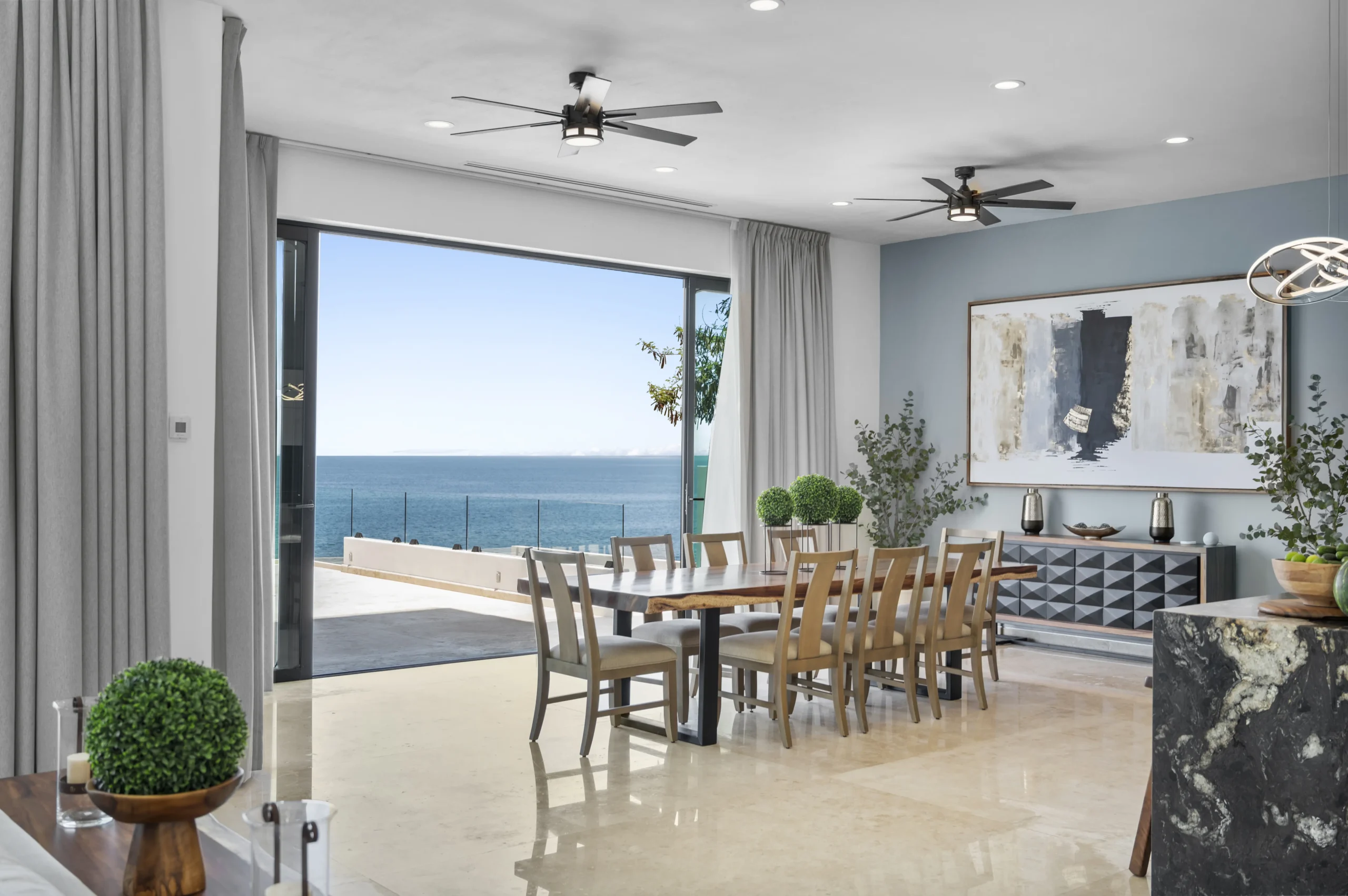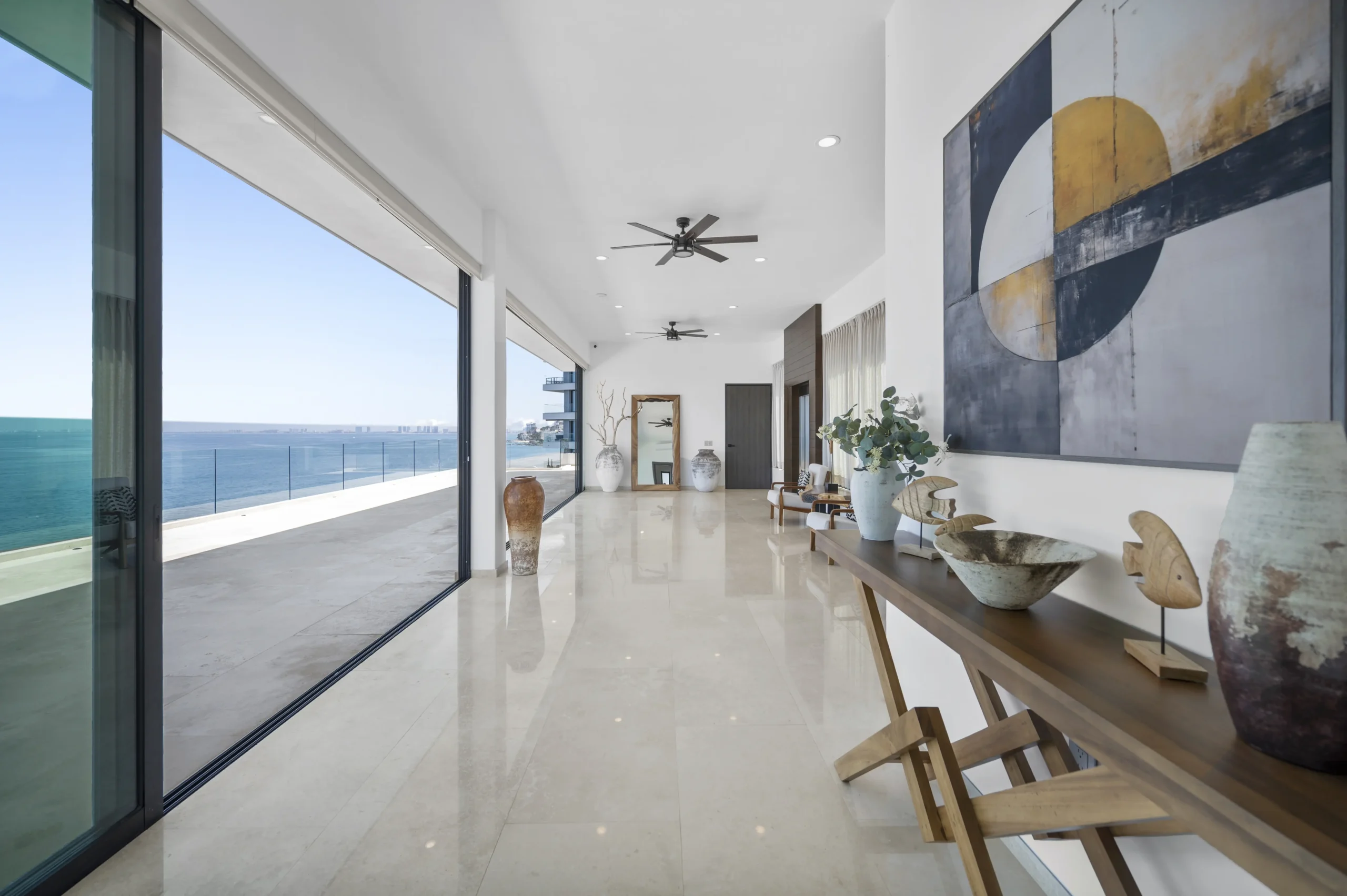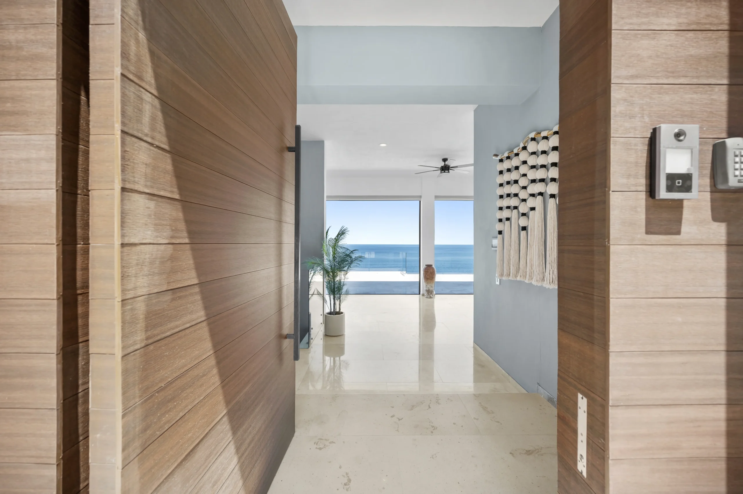 Daily life here naturally flows between relaxed lounging and sociable gathering. A grand entry hall sets the tone on arrival, opening to expansive windows and a sense of openness that carries through the interiors. The game room level, with its pool table, oversized sofa, and large-screen TV, invites casual evenings, while the gourmet kitchen and refined living areas support more elevated moments. Outside, the oceanfront infinity pool forms the visual and social centerpiece, encouraging unhurried time in and around the water.